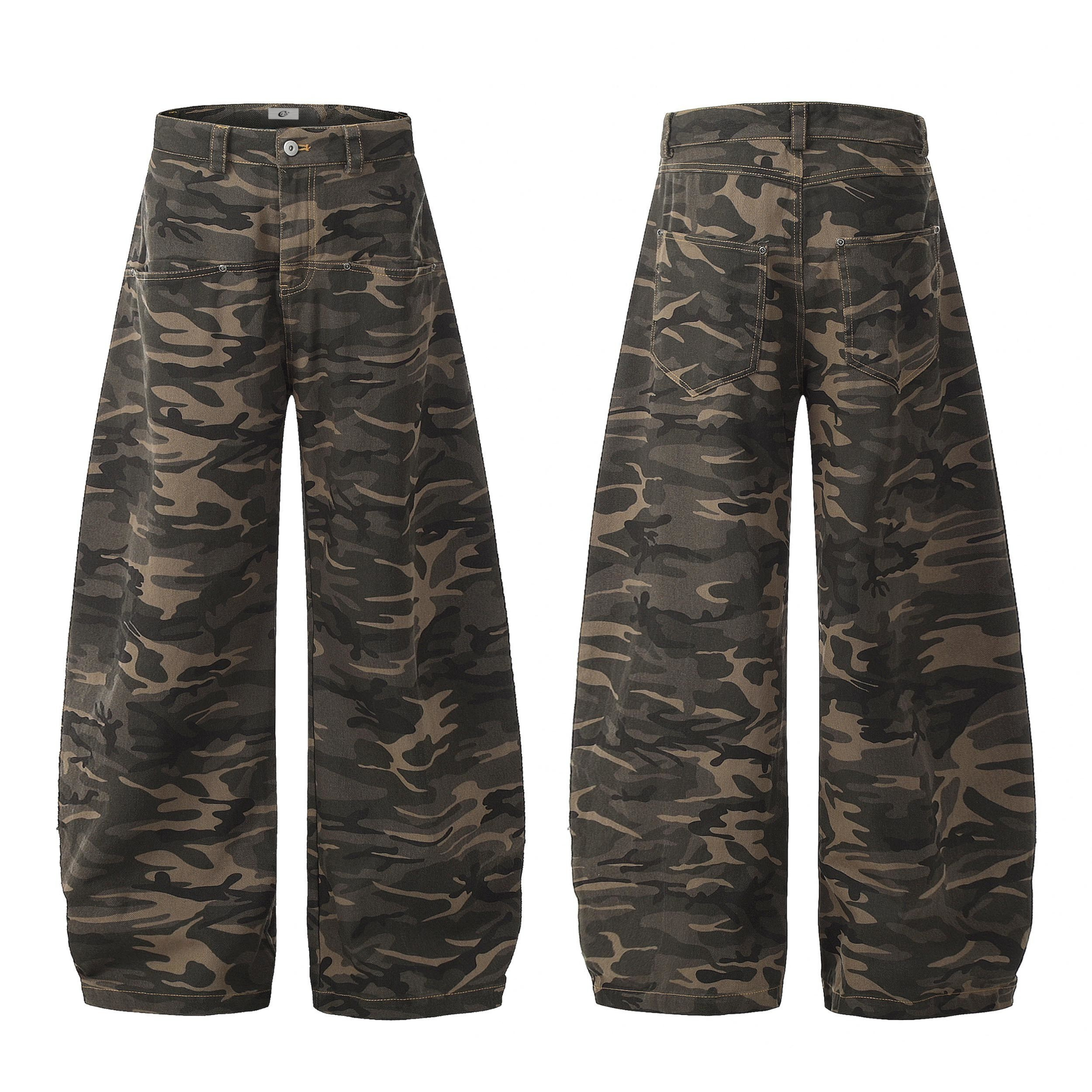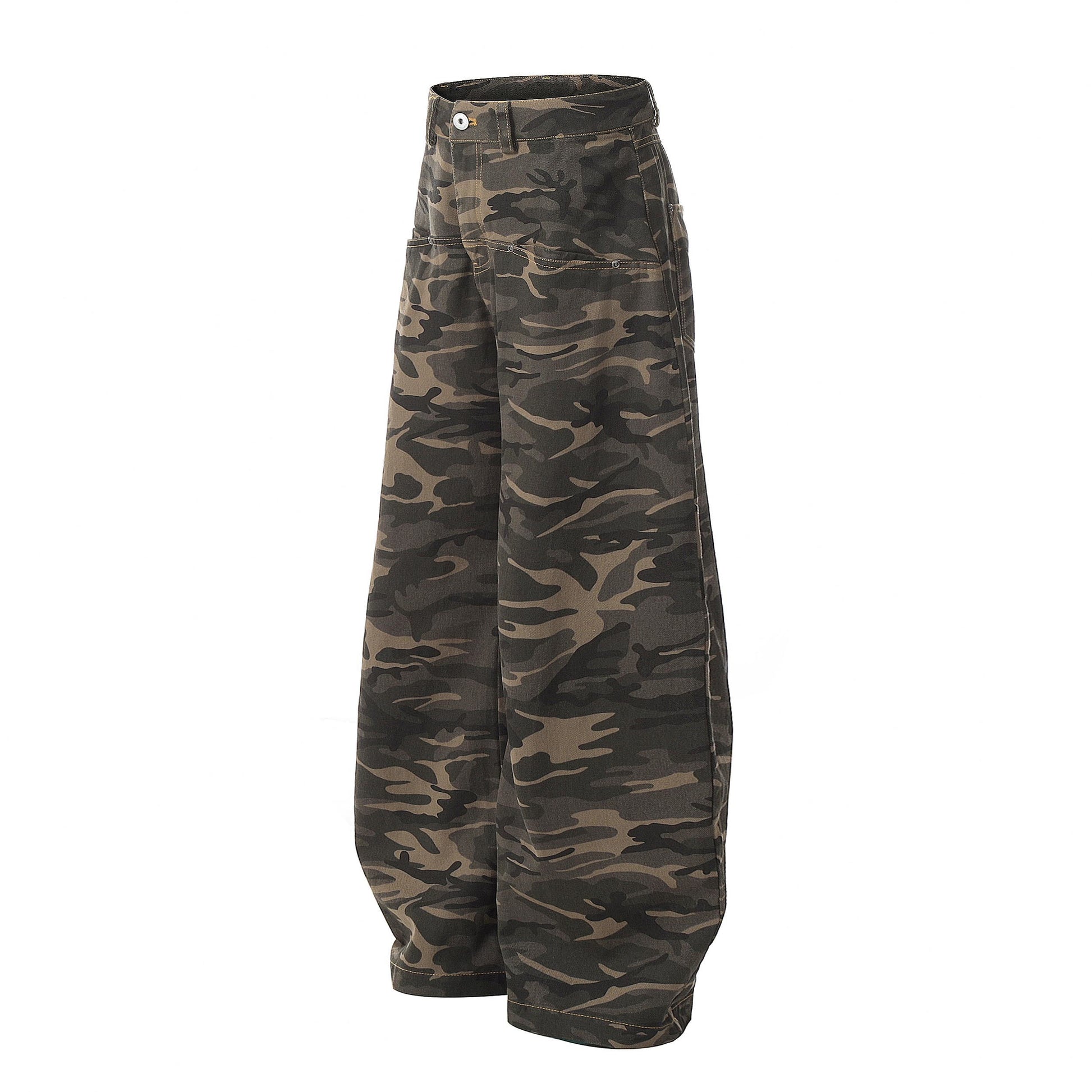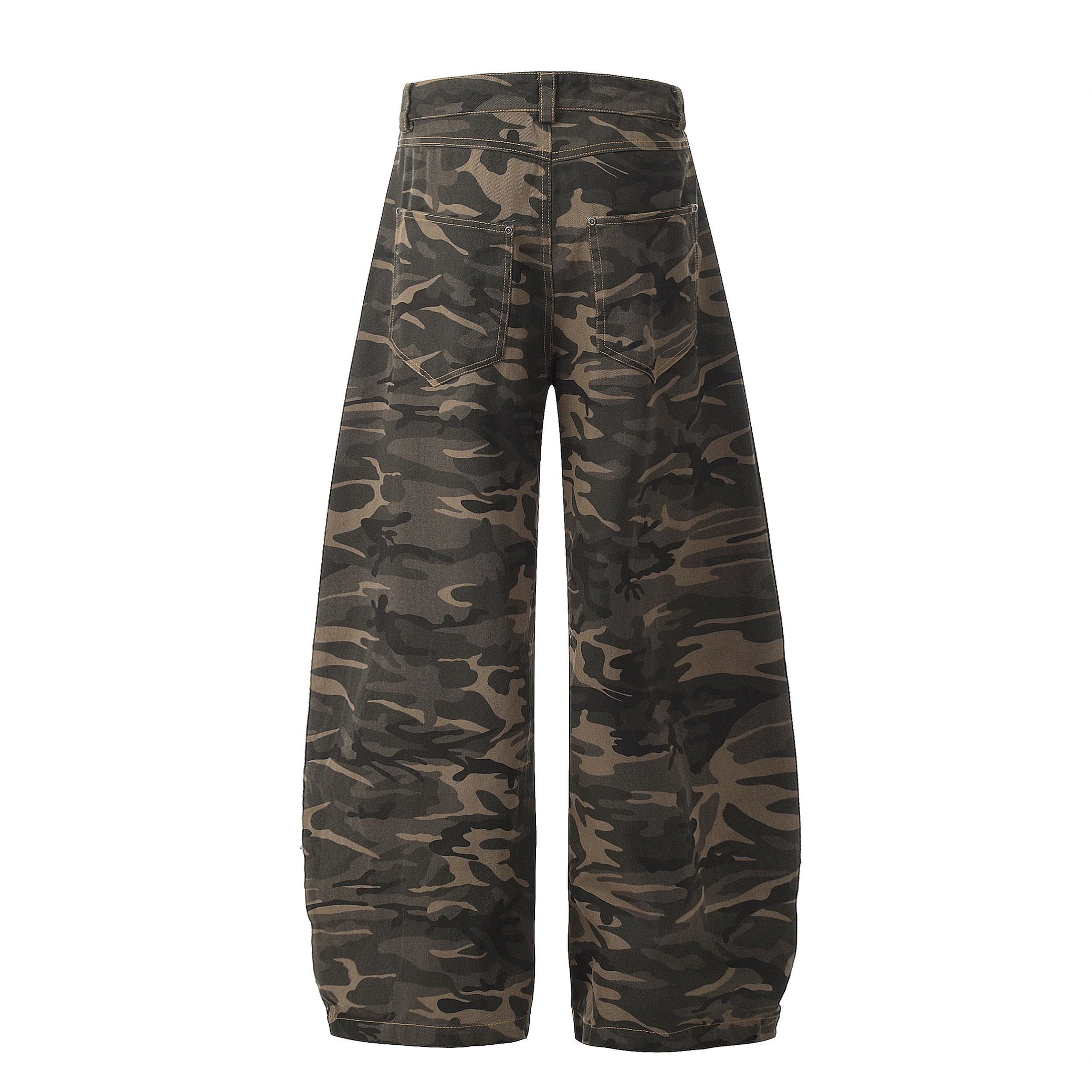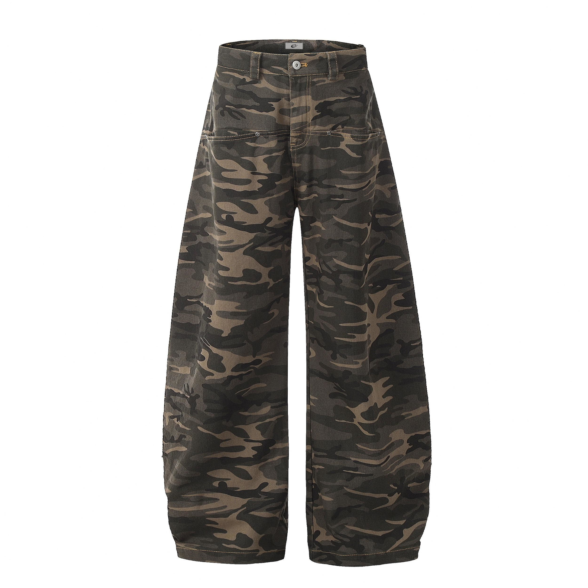 Clothing details: All-Over Camo Print, Balloon Wide-Leg Silhouette, Structured Waistband, Washed Finish, Five-Pocket Design, Relaxed Streetwear Fit