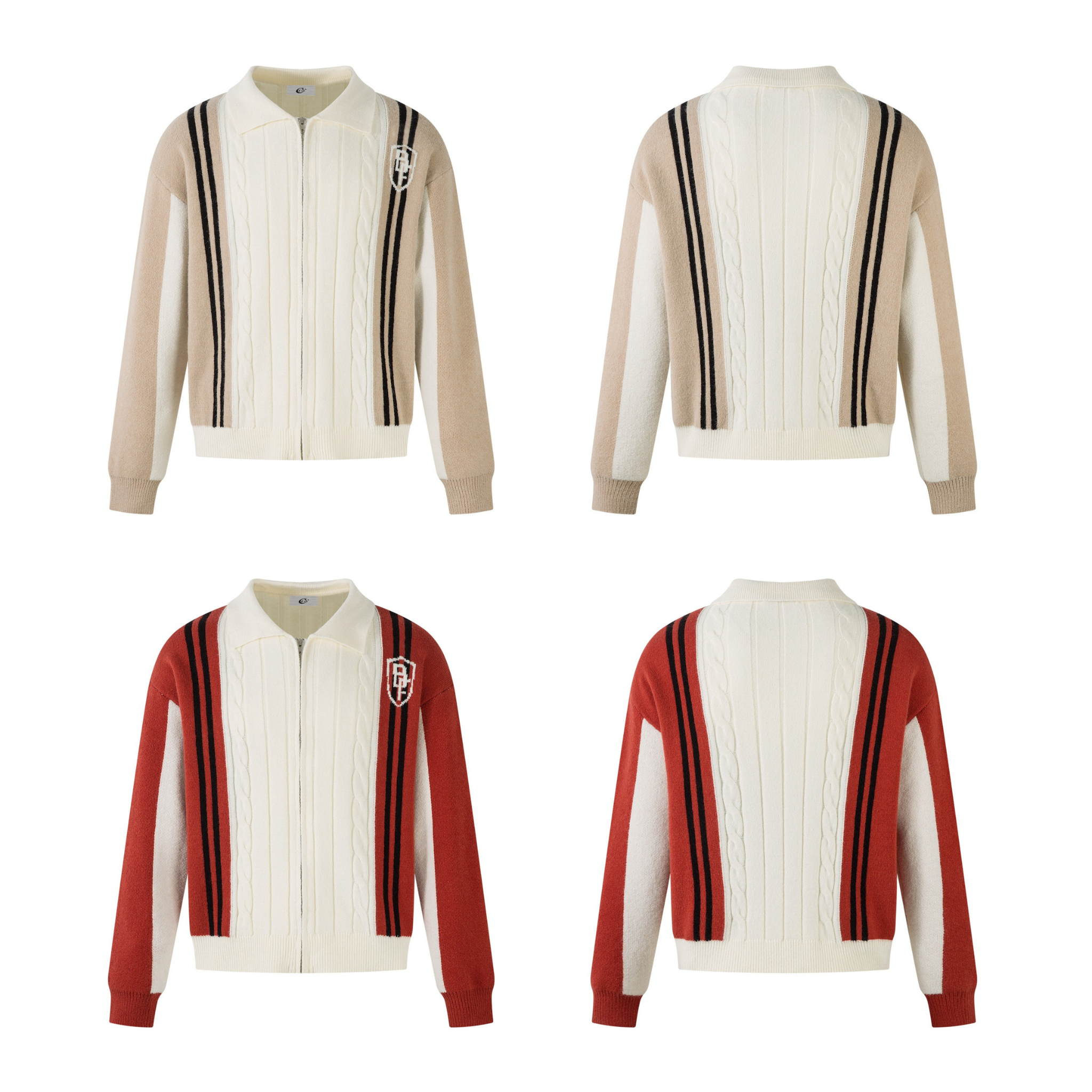 Clothing details Cable-knit body contrast color block stripes embroidered logo patch zip-up front ribbed cuffs and hem relaxed fit