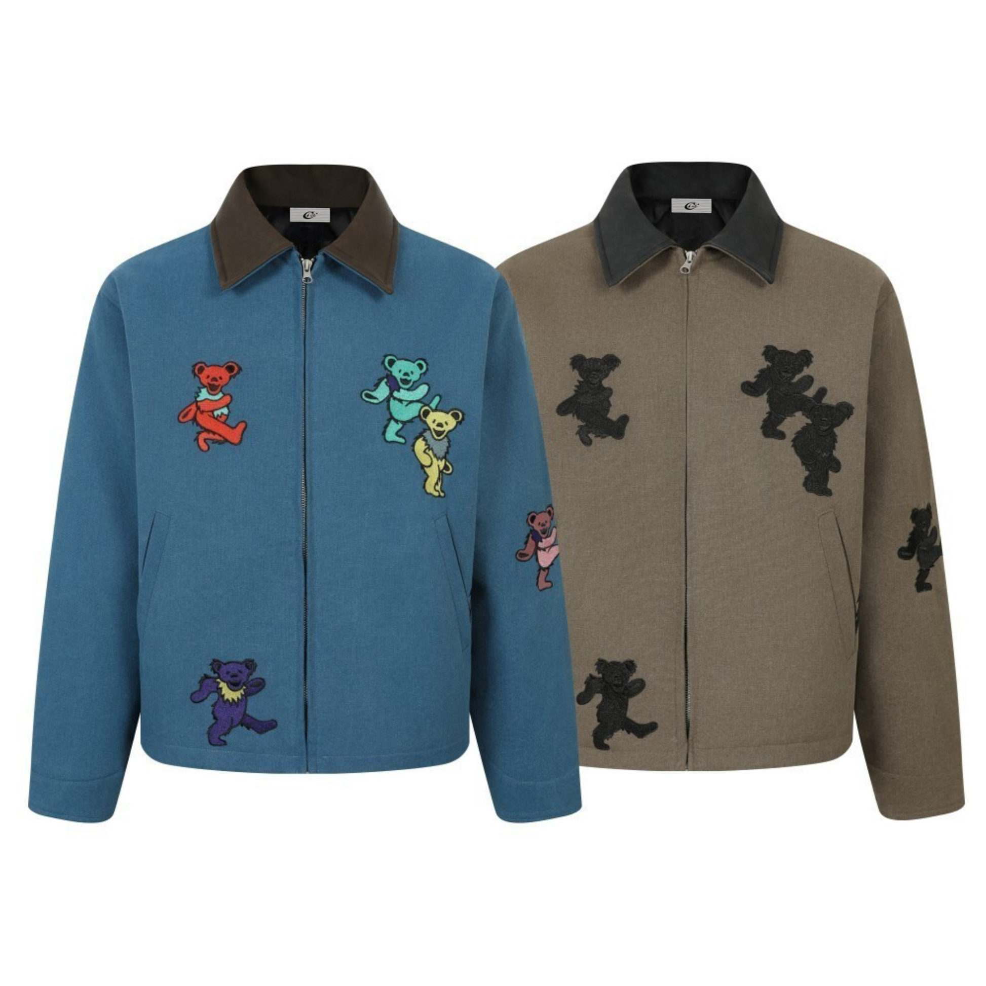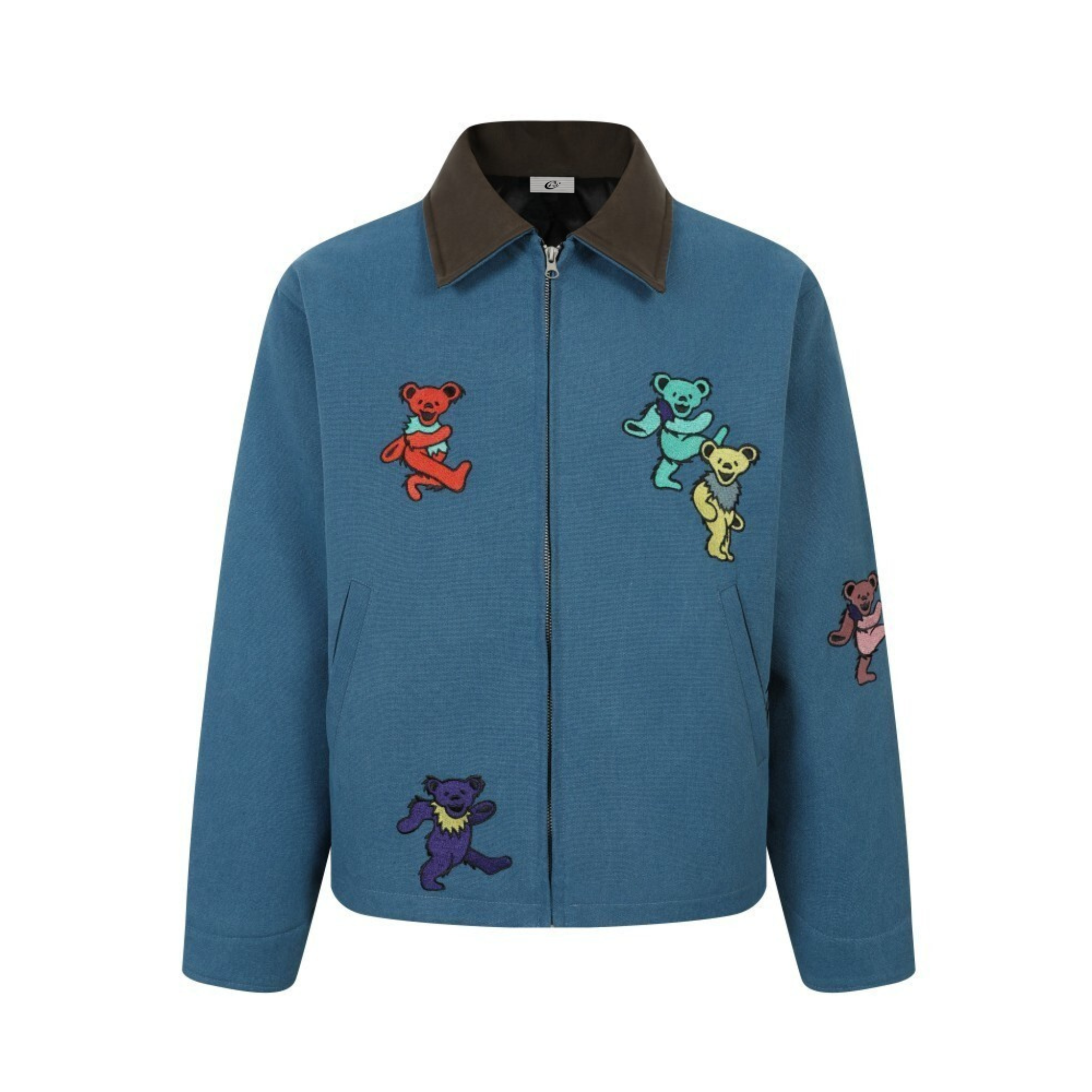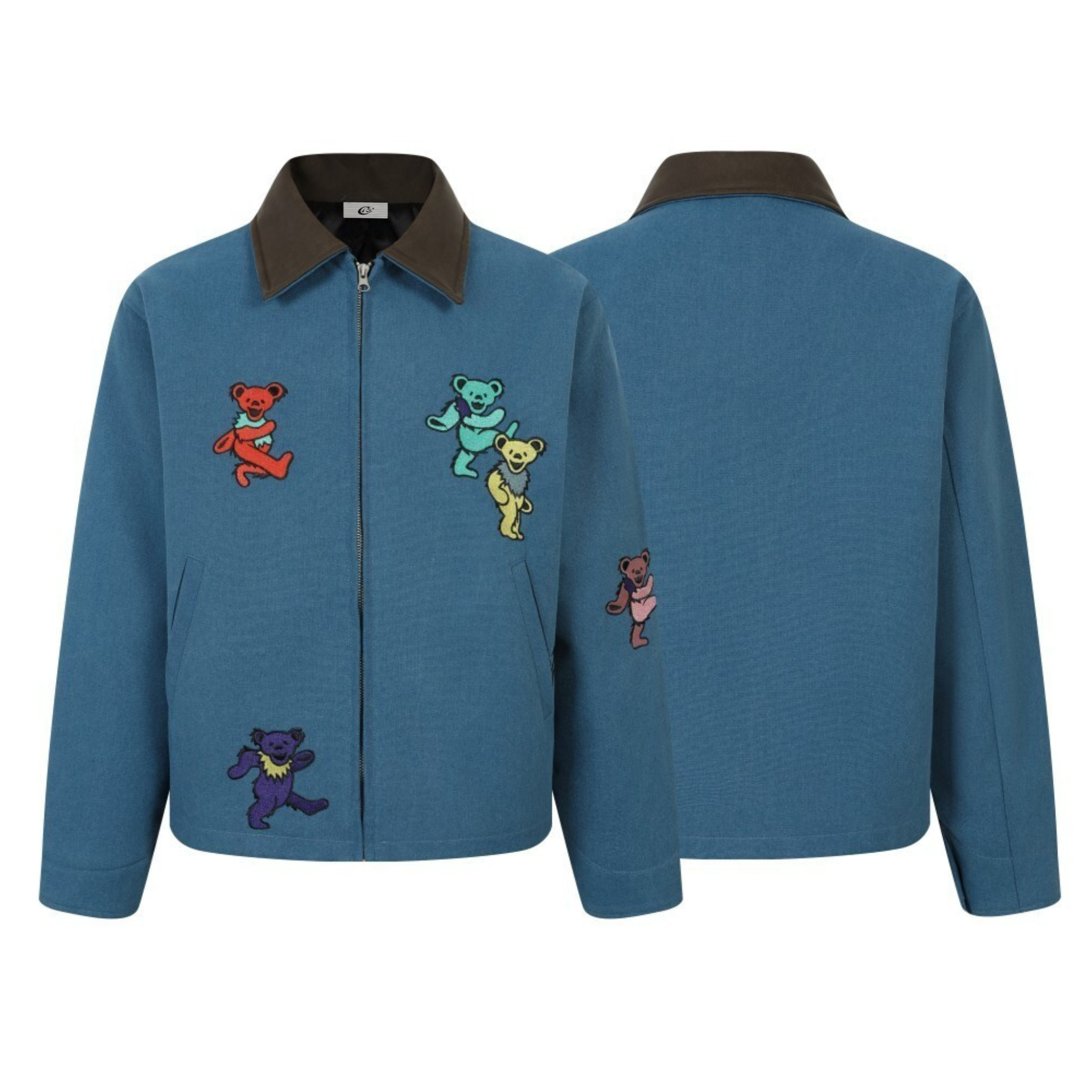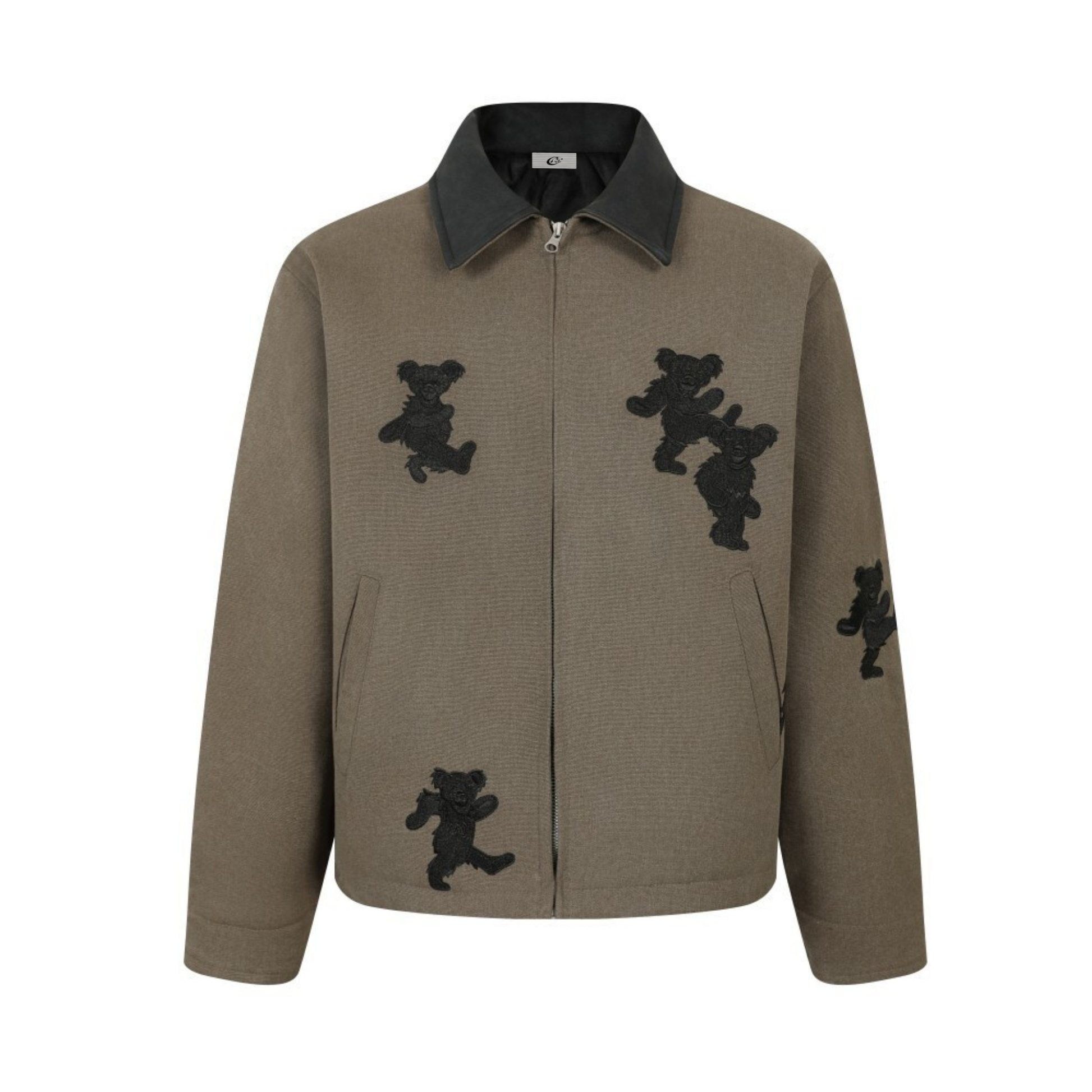 Clothing details: Embroidered dancing bear motifs, contrast collar, front zip closure, side welt pockets, relaxed straight-cut silhouette
