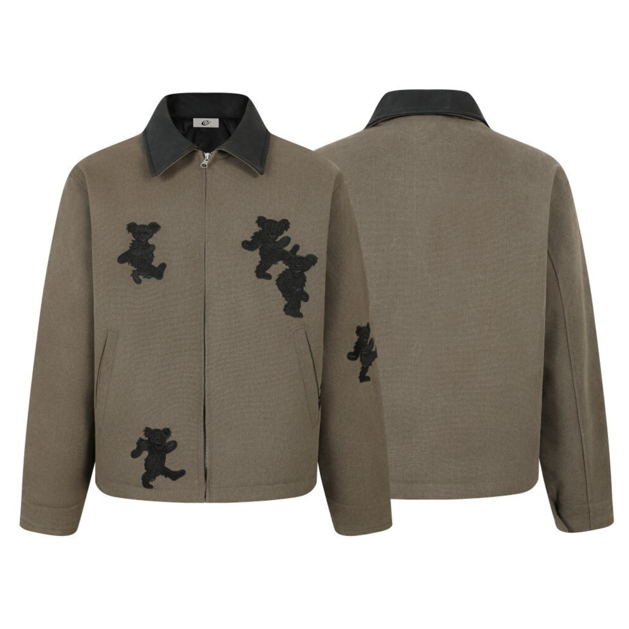 The Omirad Dancing Bear Embroidered Jacket fuses playful nostalgia with refined streetwear design. Crafted from a structured PU-blend fabric, it features multi-color or tonal bear embroidery that adds texture and attitude to a timeless zip-up silhouette. The contrast collar gives it a retro edge, making it perfect for both statement layering and casual street fits.