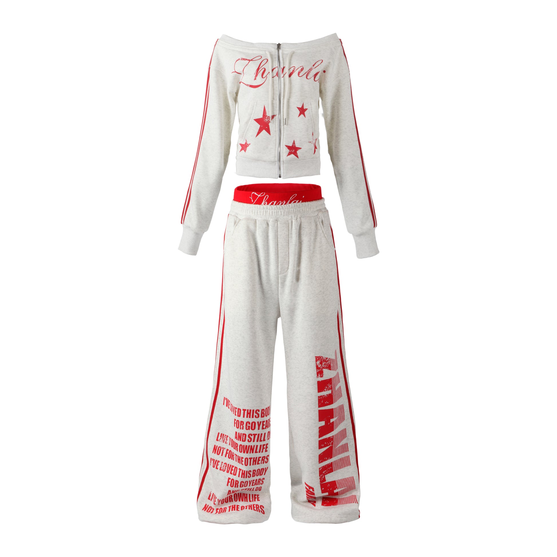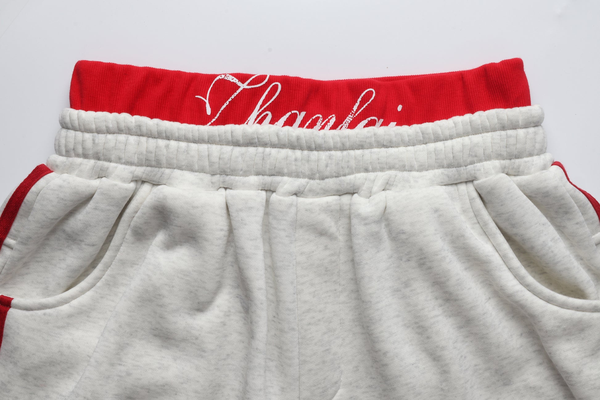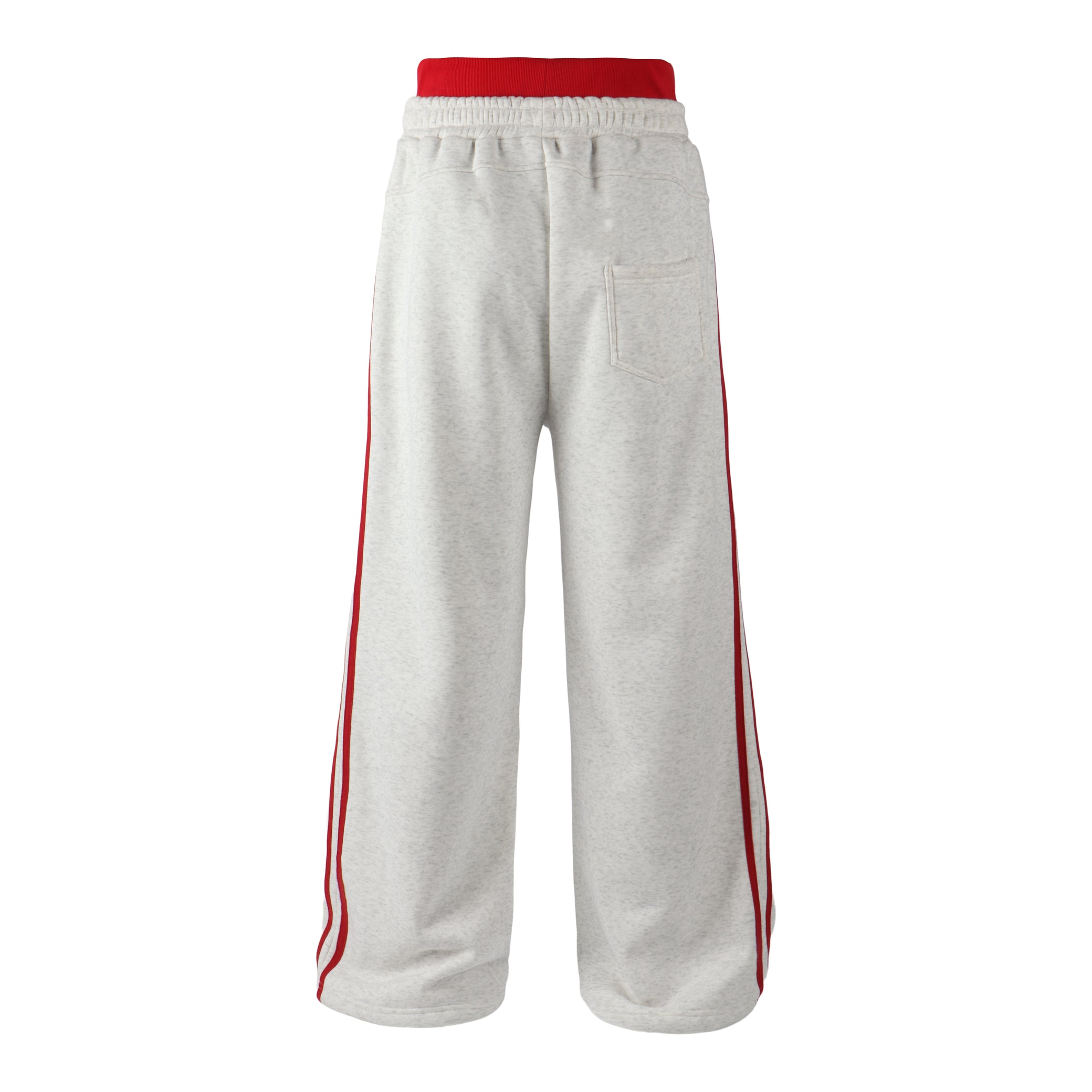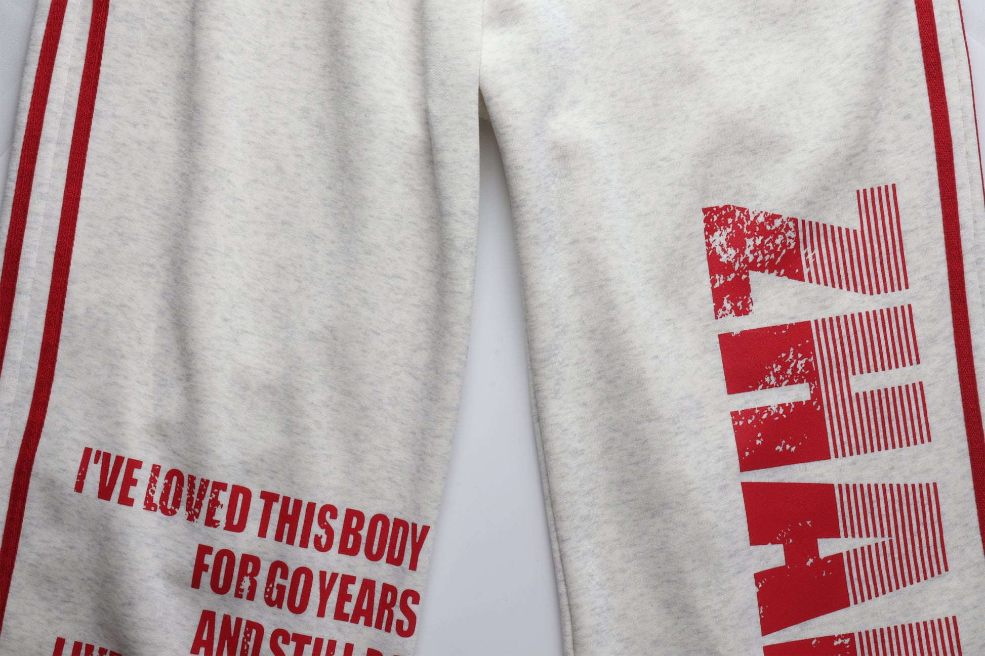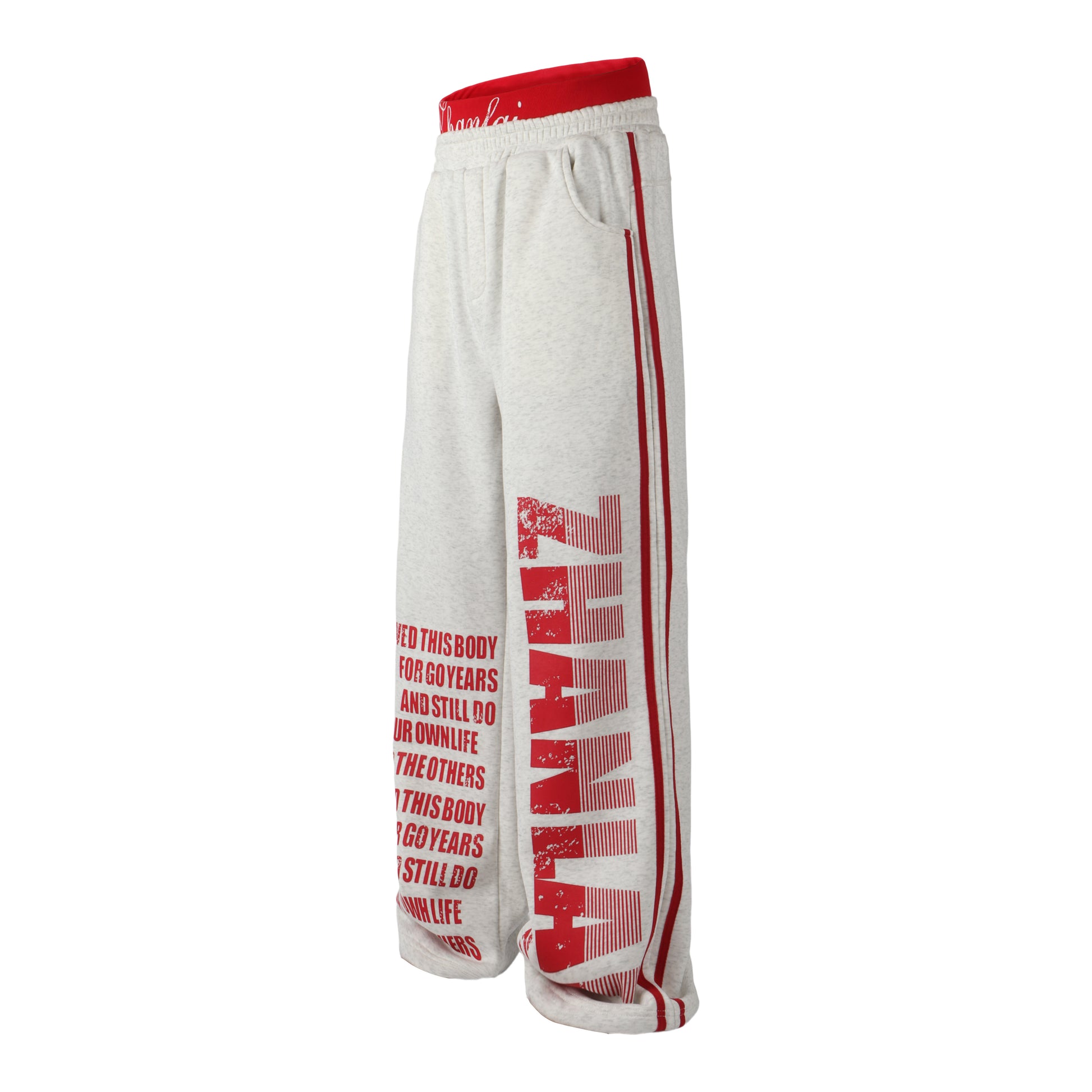 Clothing details: High-rise elastic waistband with contrast logo, red side stripes, bold leg text print, back patch pocket, wide-leg cut