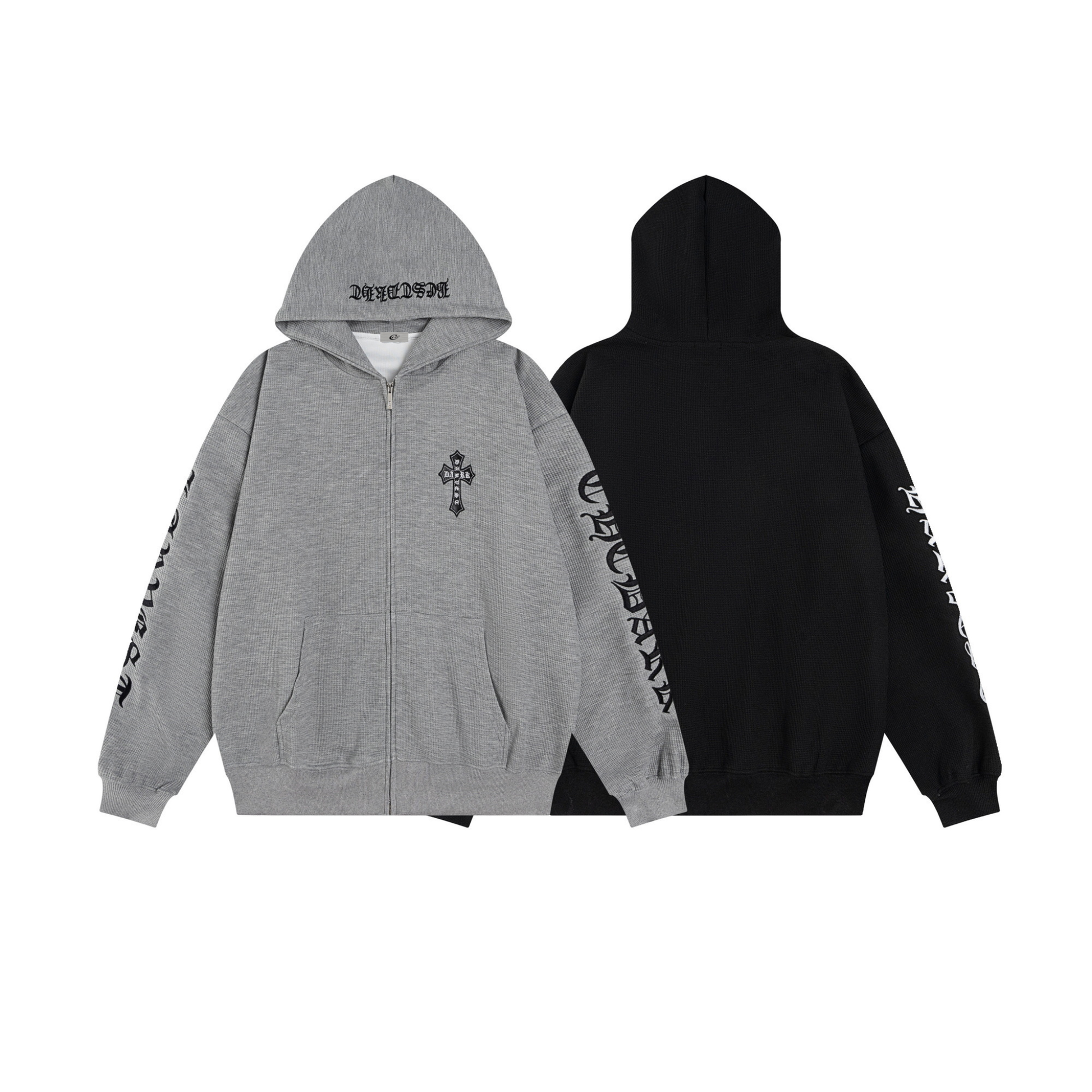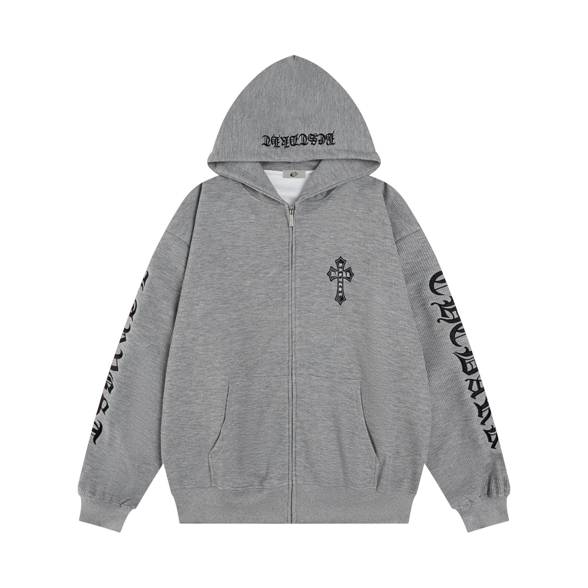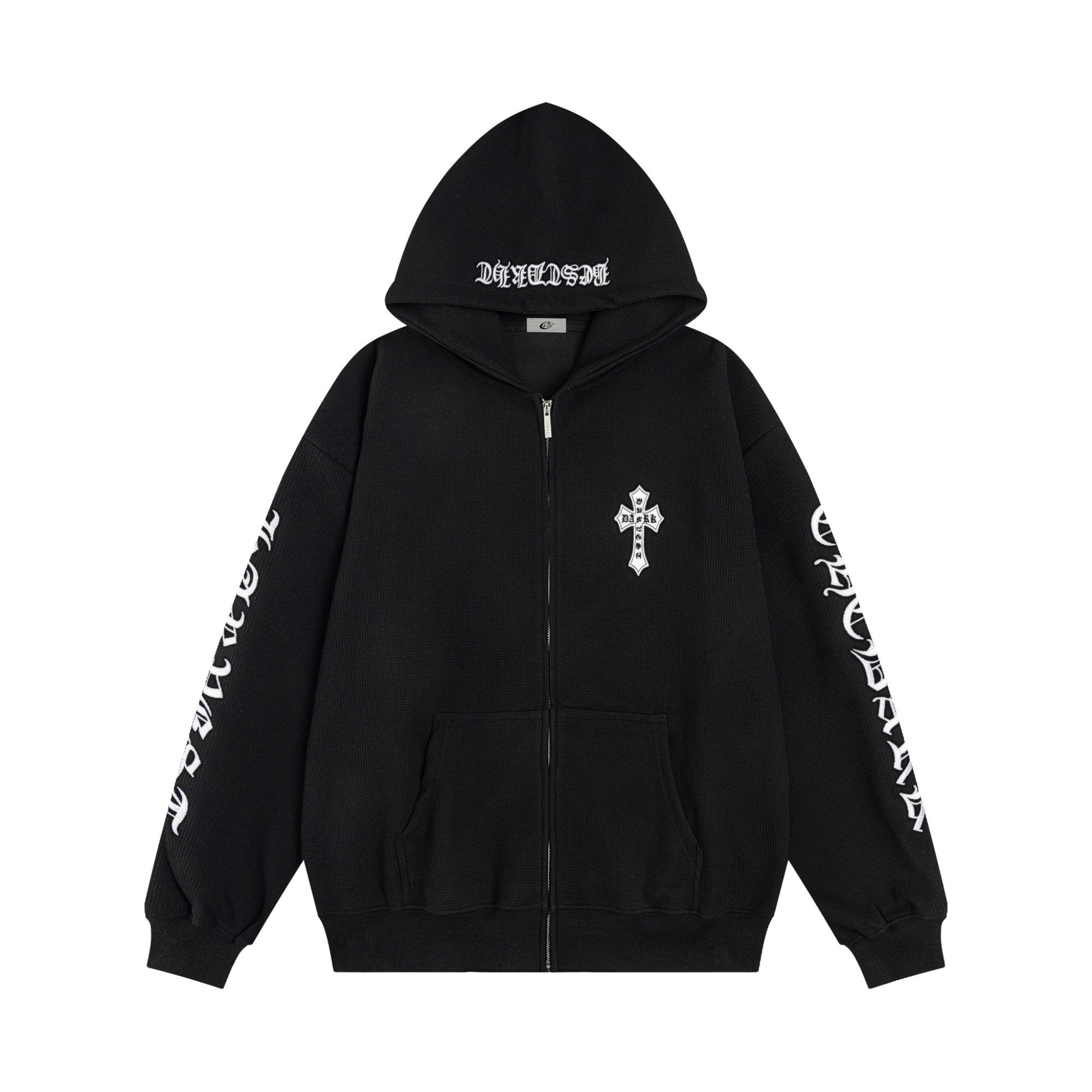 Clothing details: Gothic sleeve lettering, chest cross emblem, embroidered hood detail, full front zip closure, front kangaroo pockets, ribbed cuffs & hem