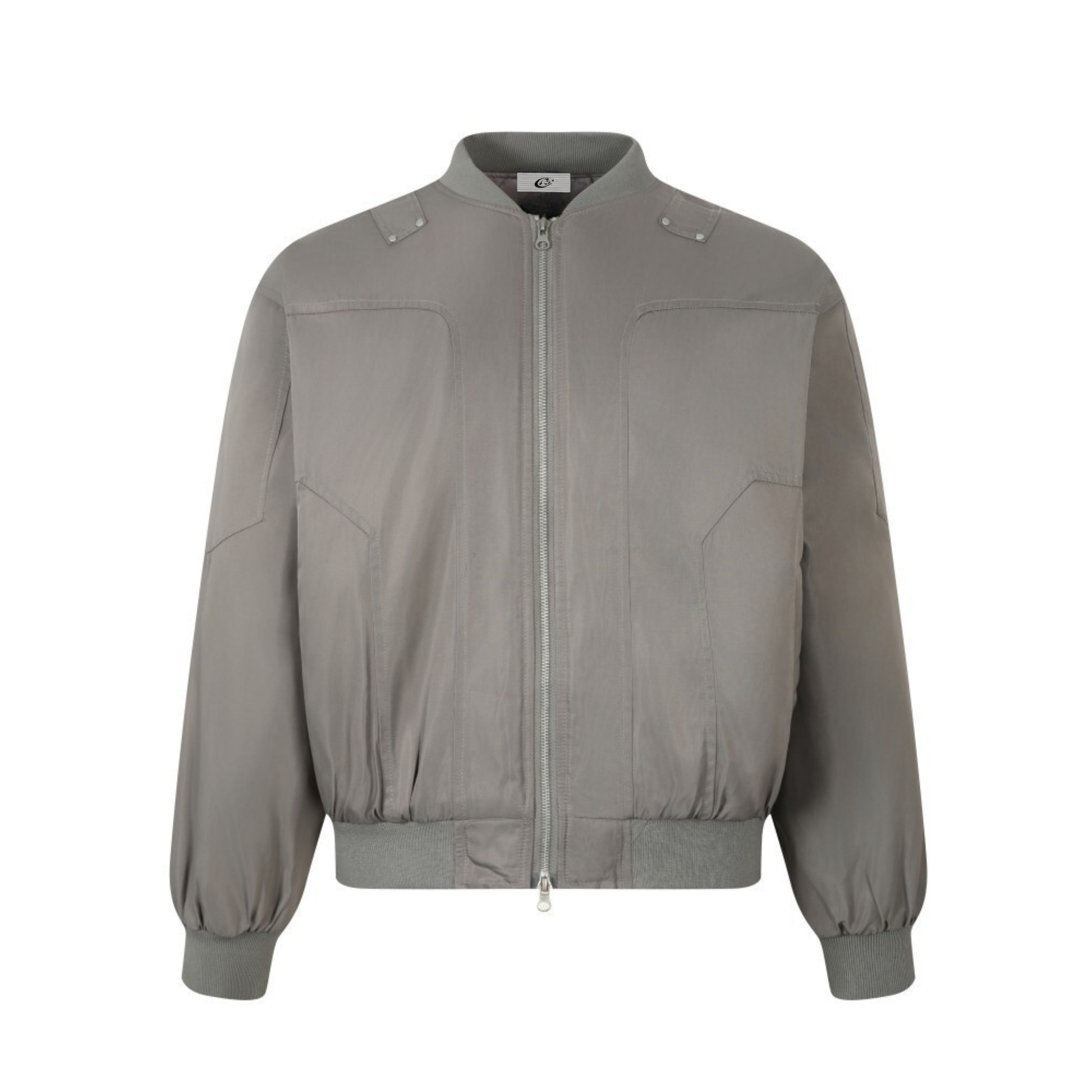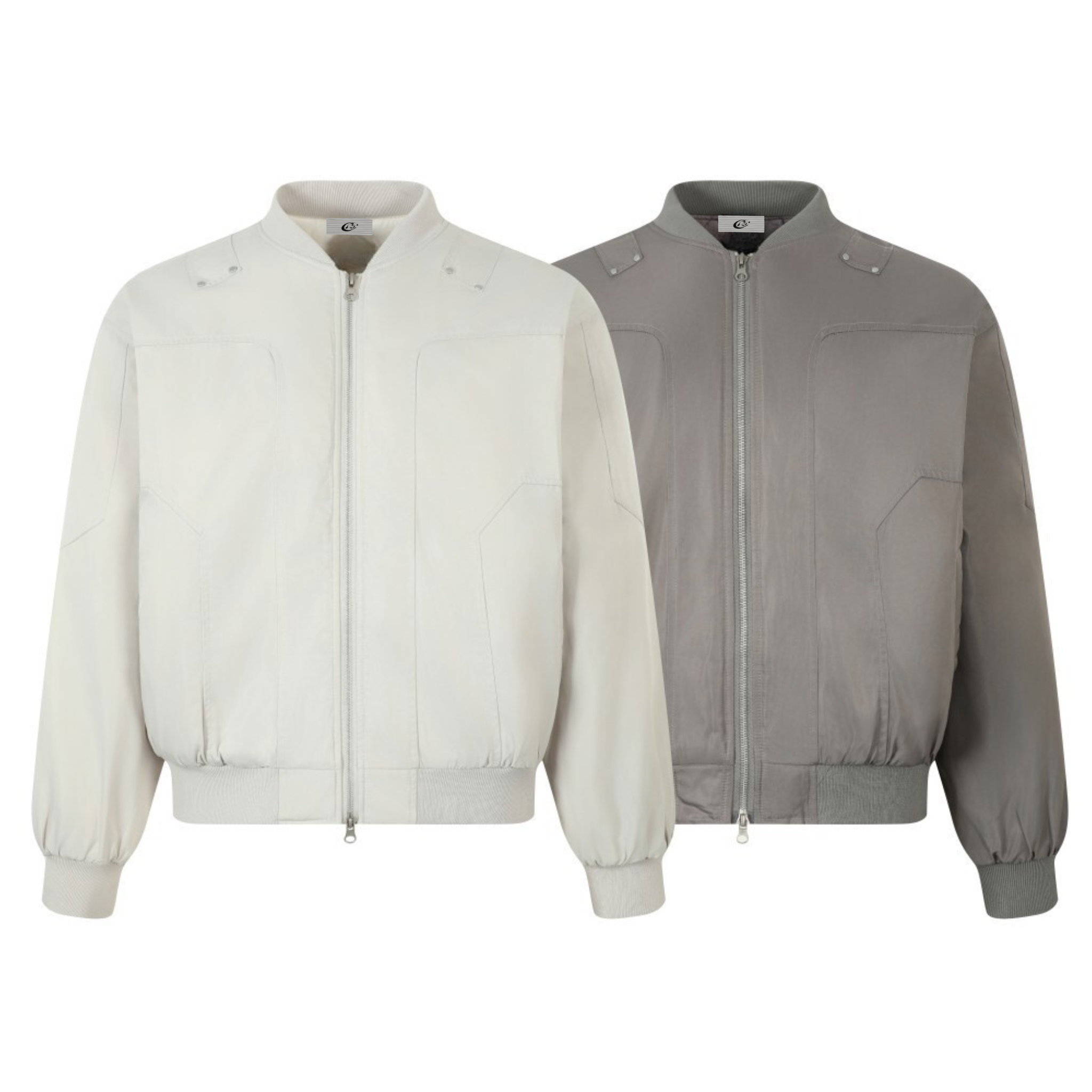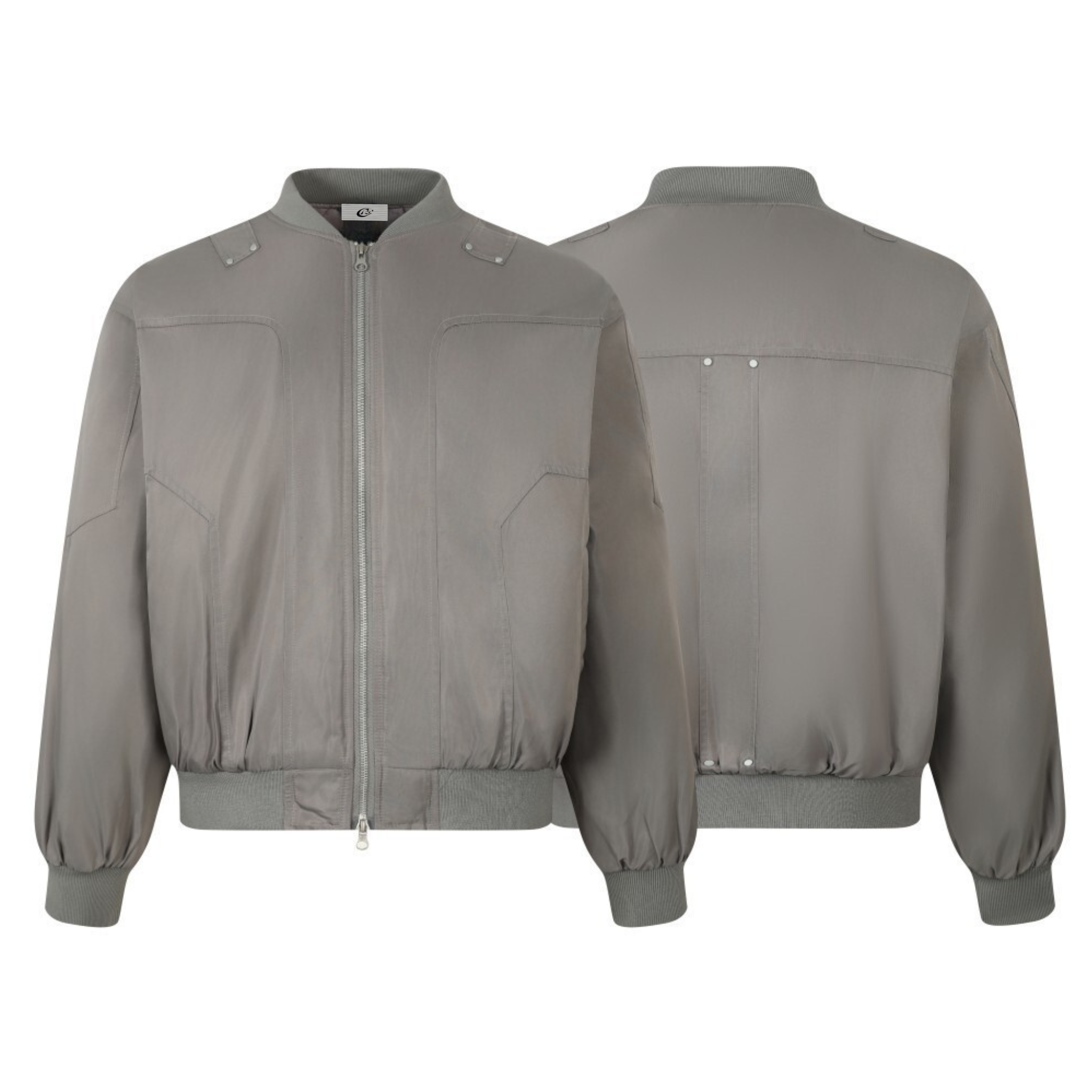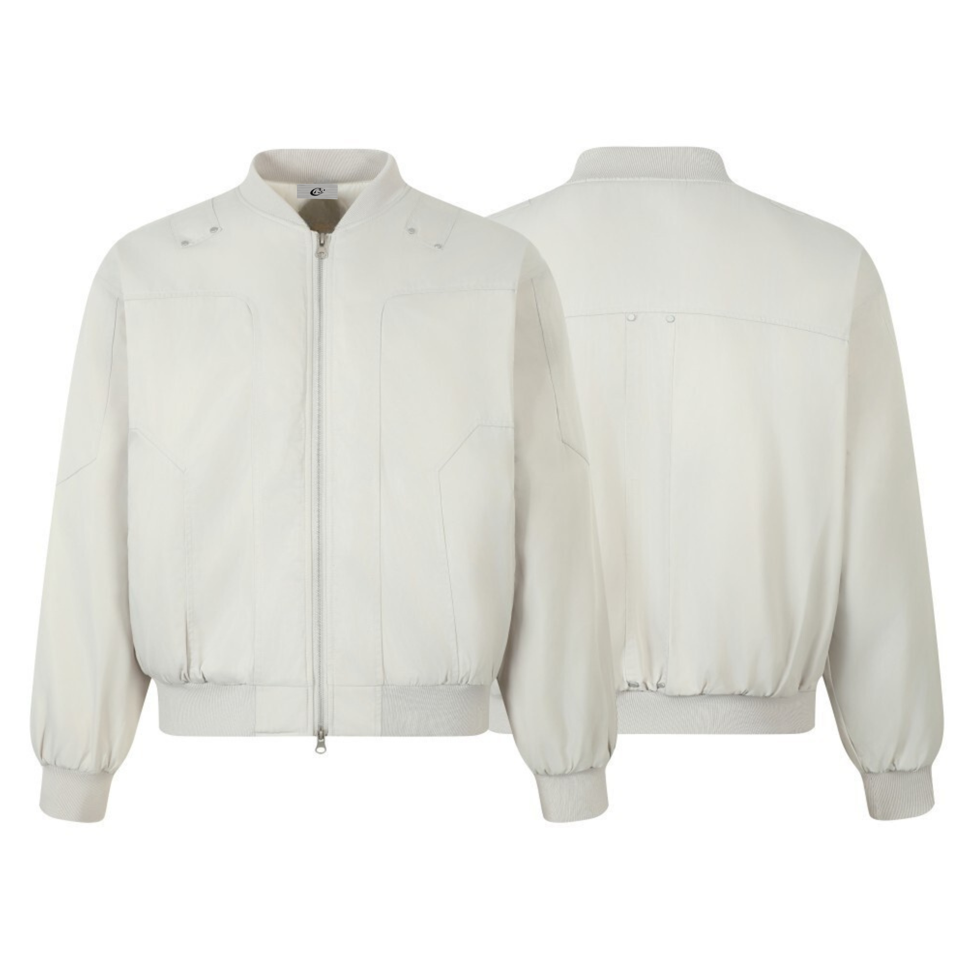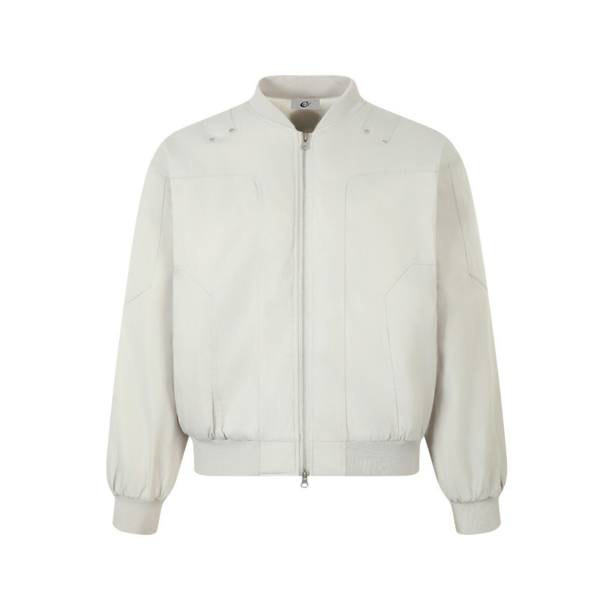 Clothing details: Shoulder rivet accents, structured panel seams, front zip closure, ribbed hem and cuffs, minimalist streetwear design