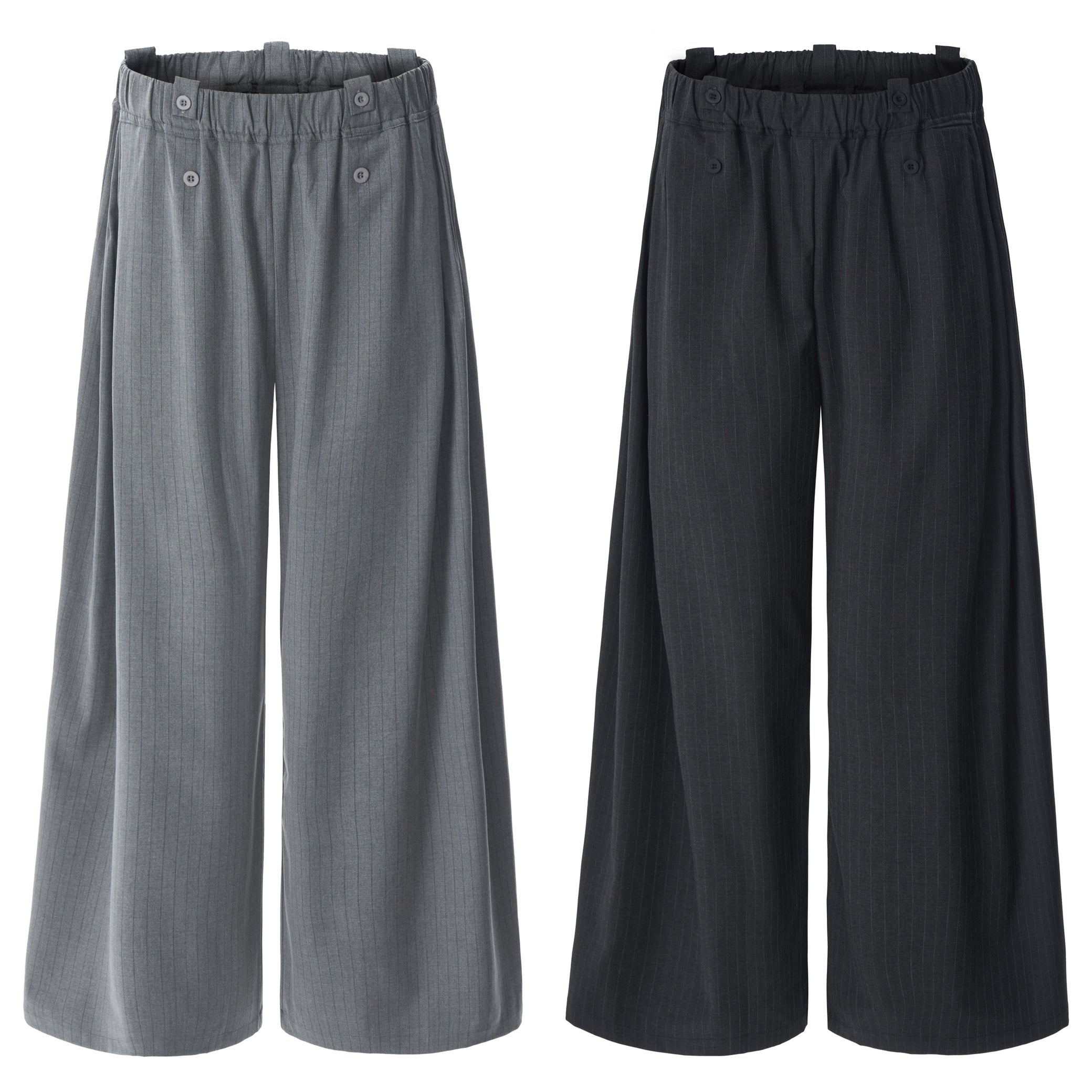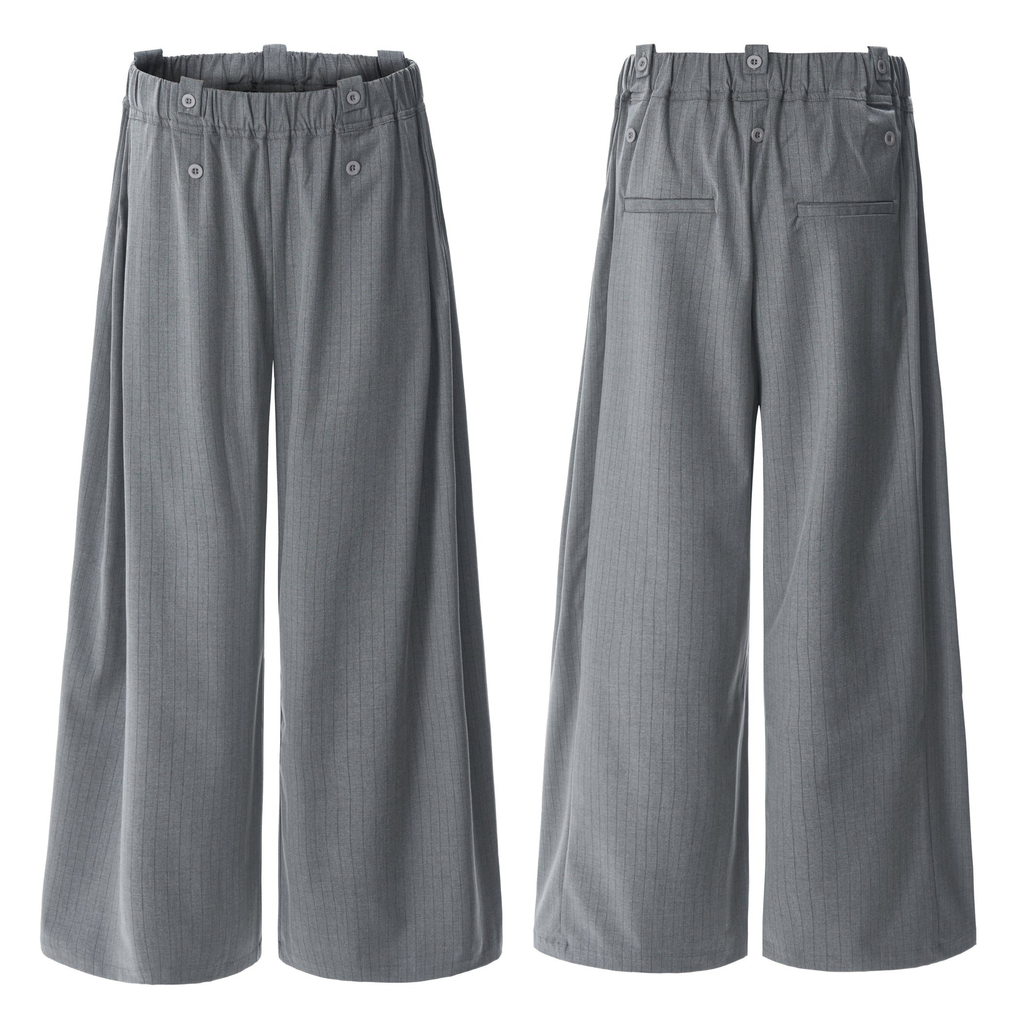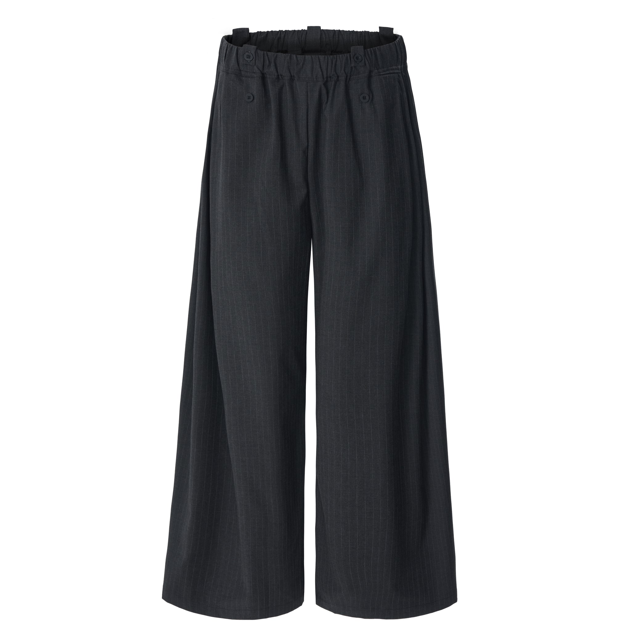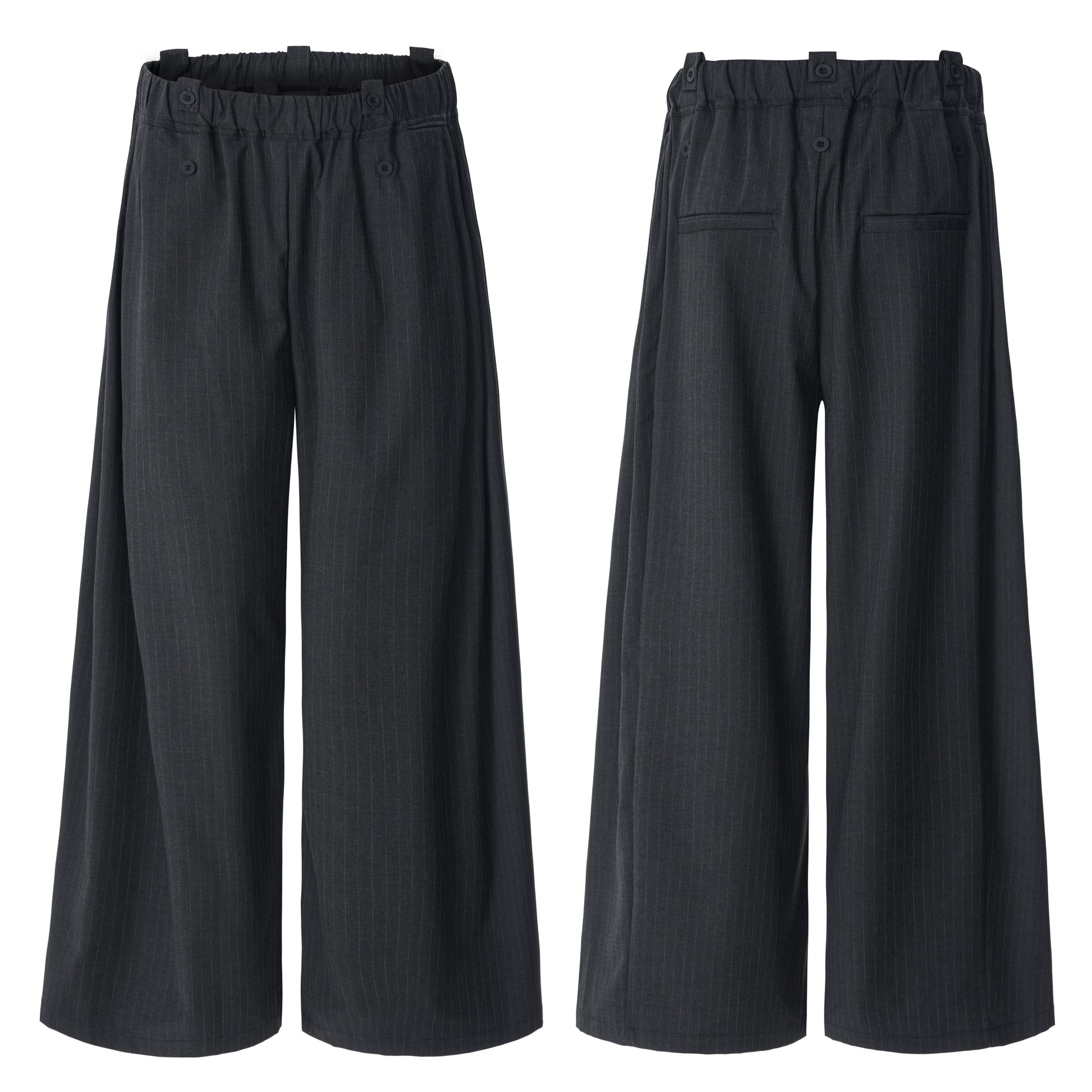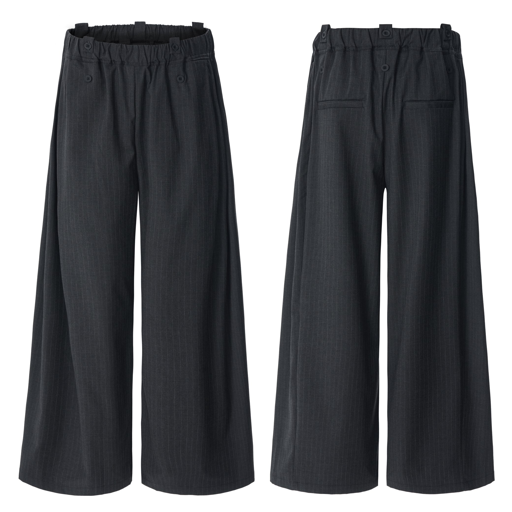 Clothing details: Dual-button waistband, pinstripe pattern, wide-leg silhouette, elastic back waist for comfort.