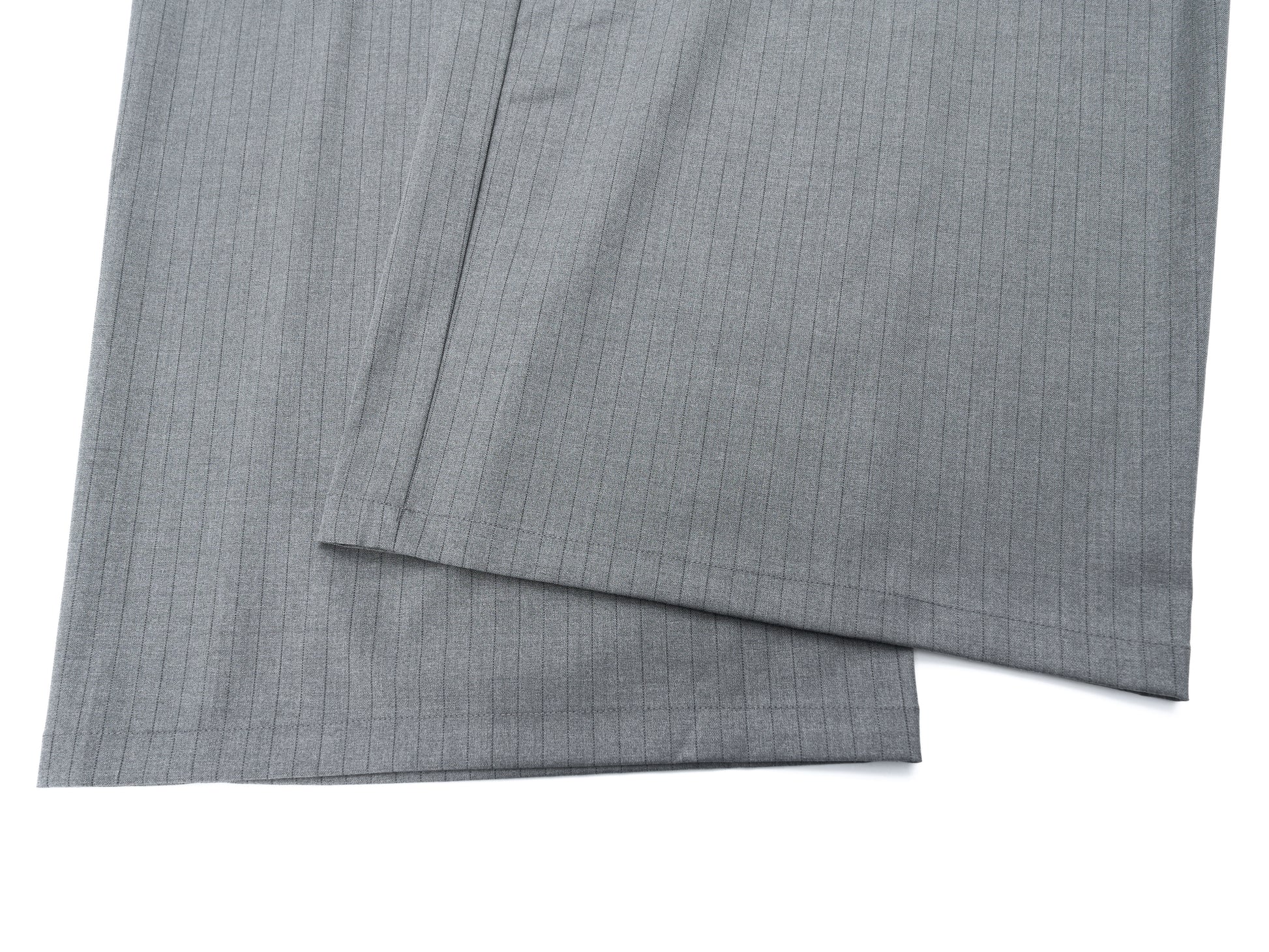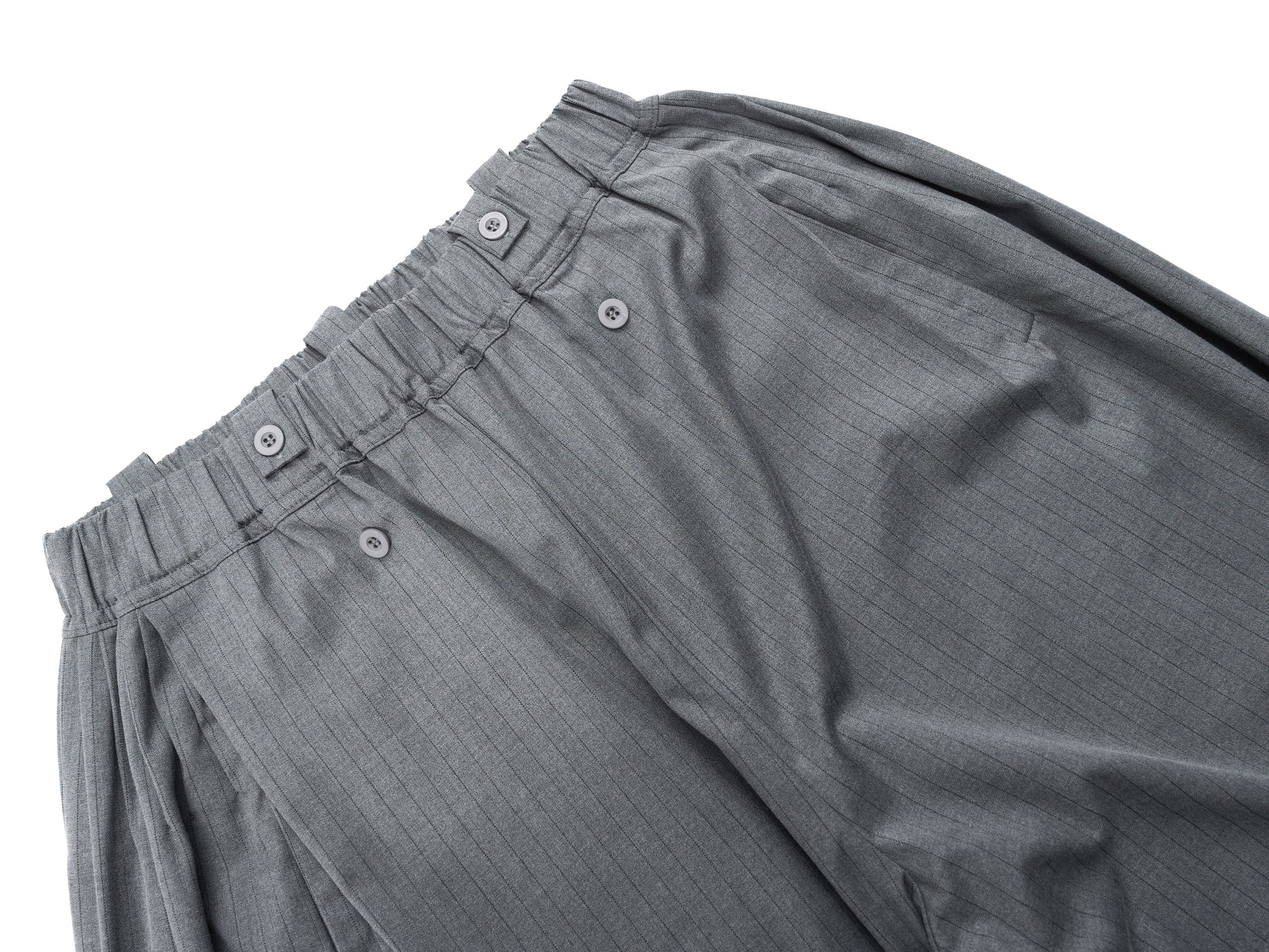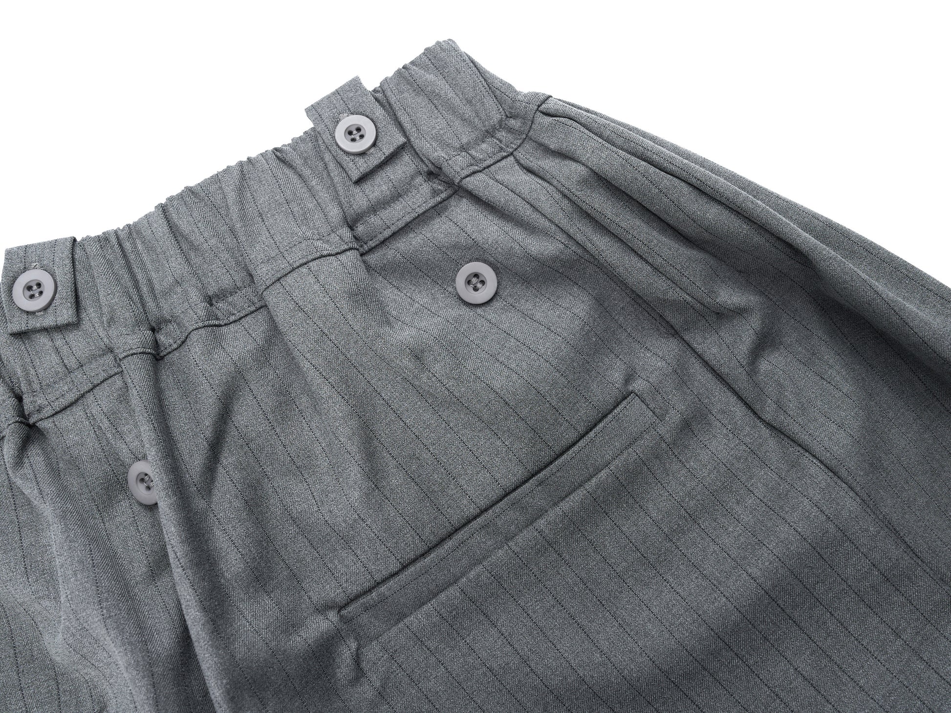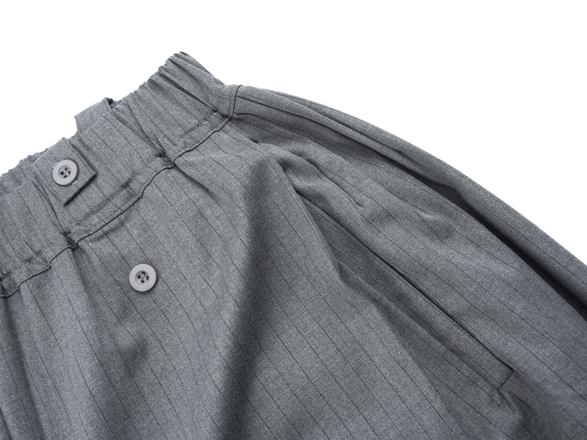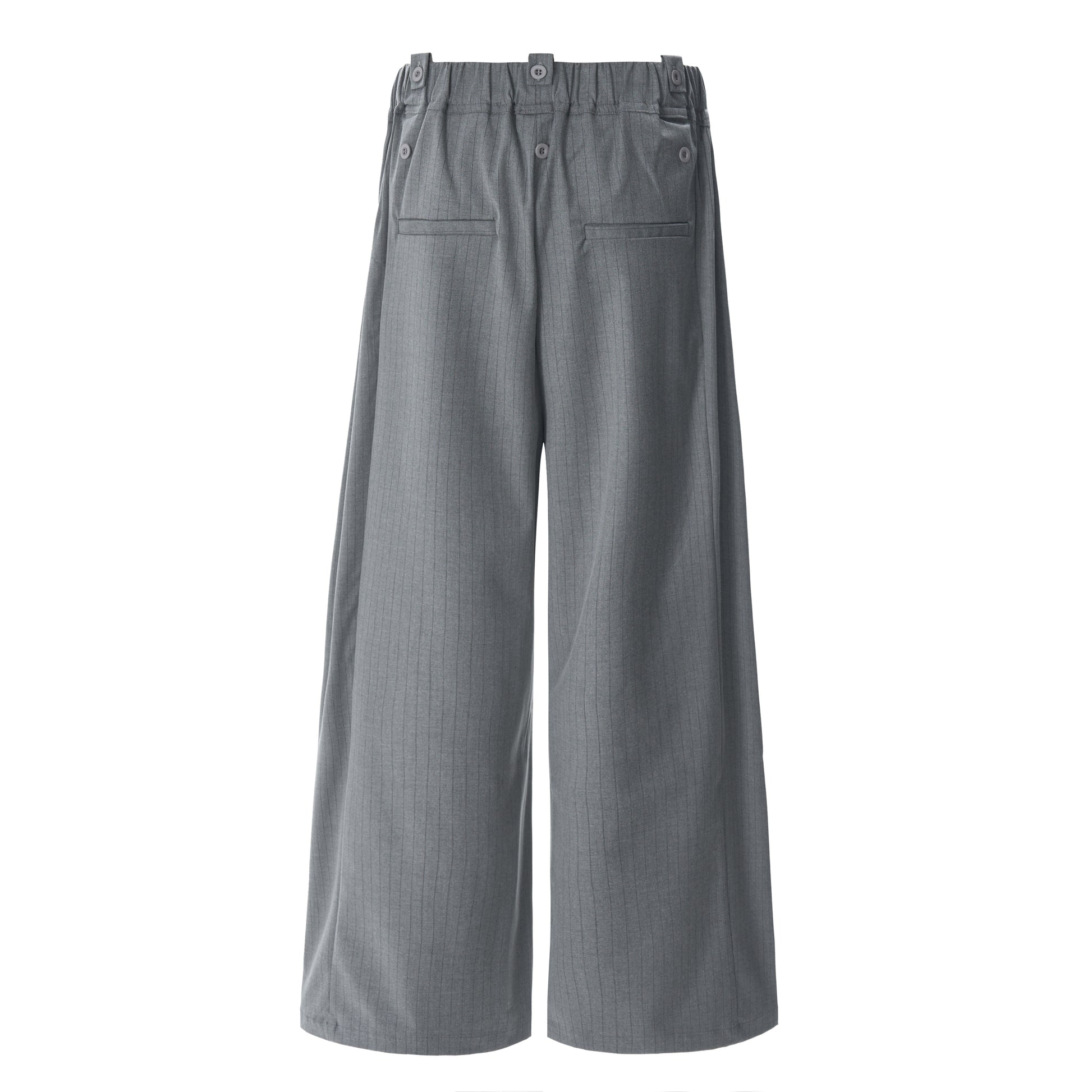 Clothing details: Dual-button waistband, pinstripe pattern, wide-leg silhouette, elastic back waist for comfort.