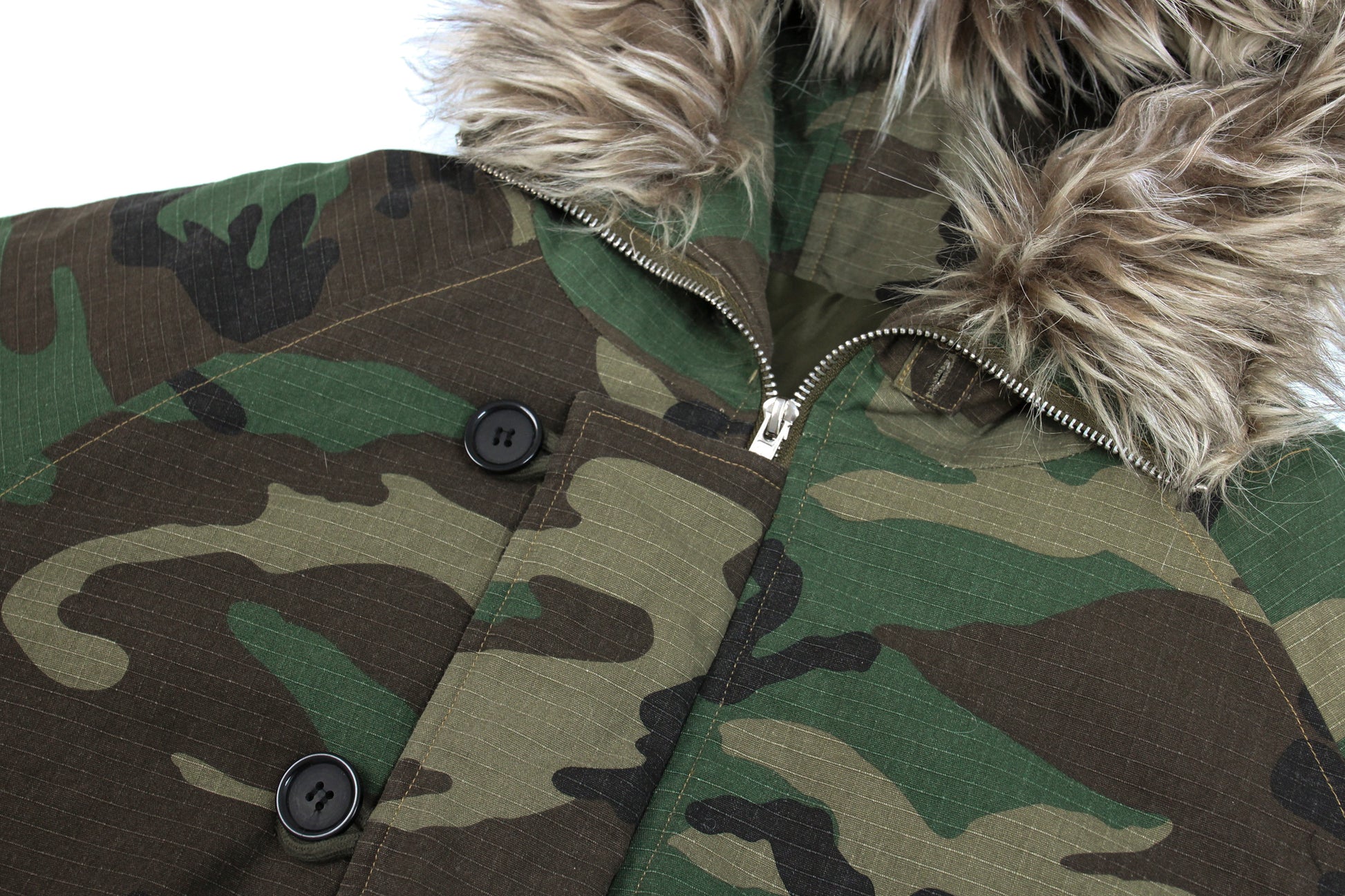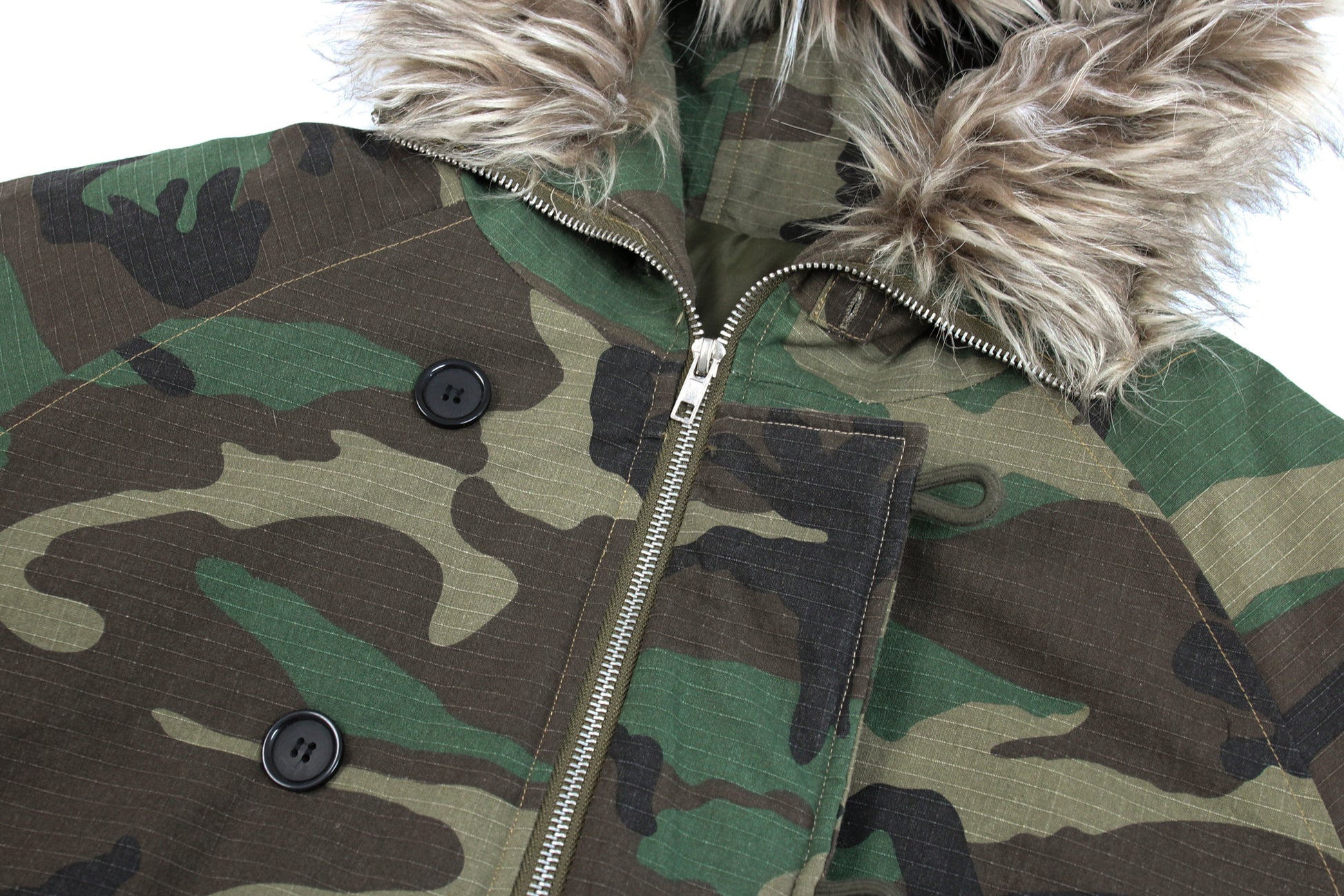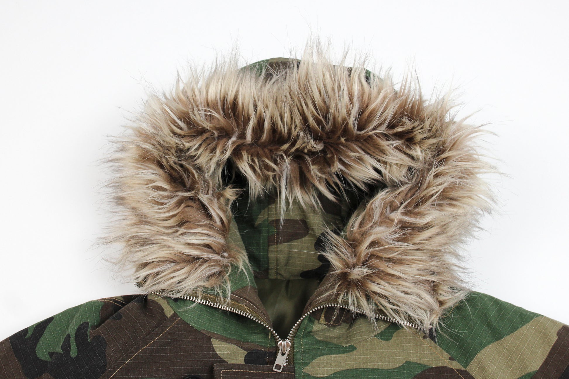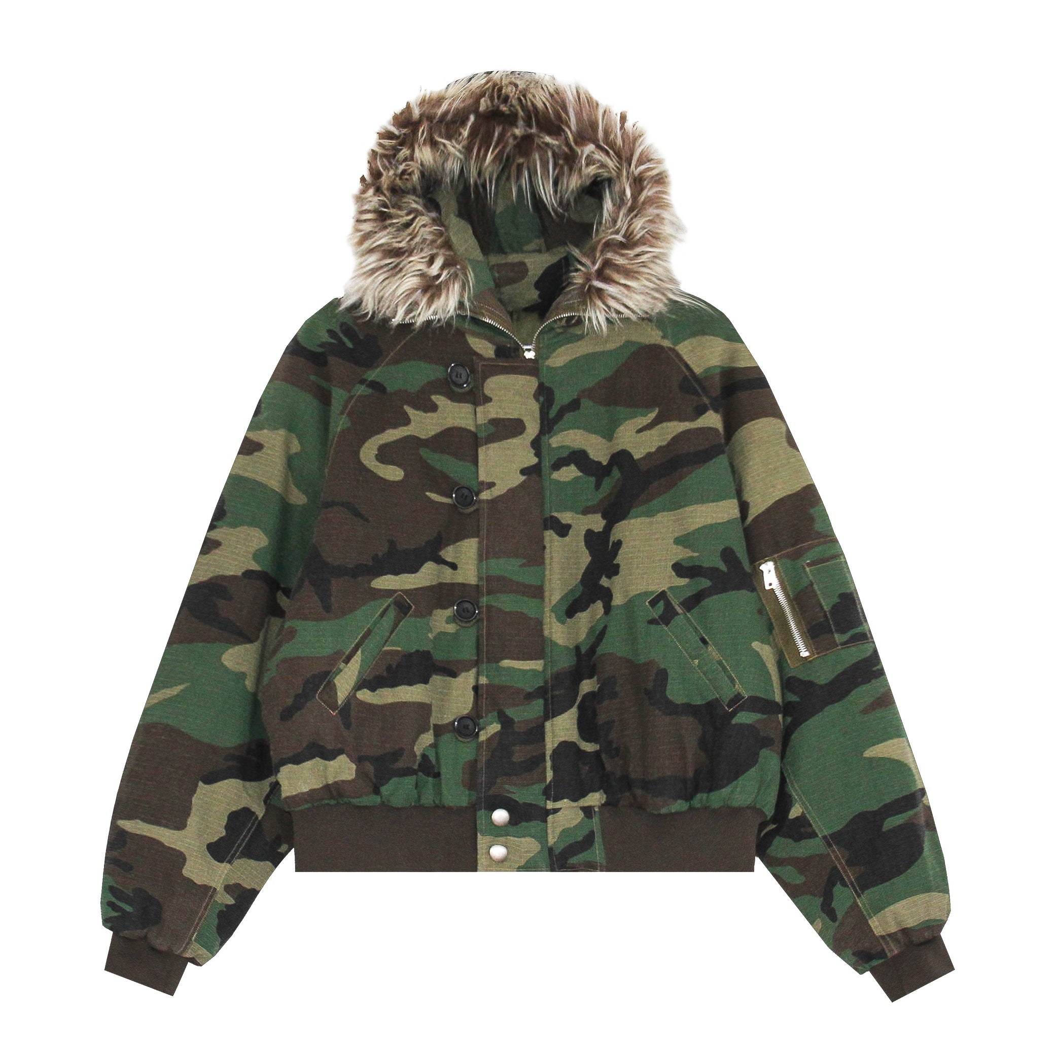 Clothing details: Detachable faux-fur hood trim, ribbed hem and cuffs, multiple utility pockets, front zipper with button placket, all-over camouflage print.