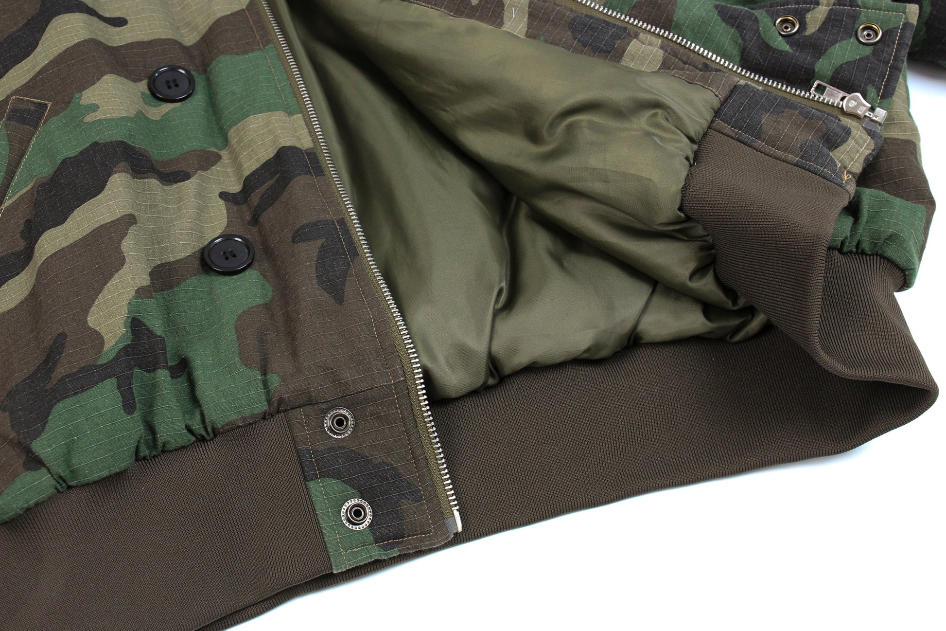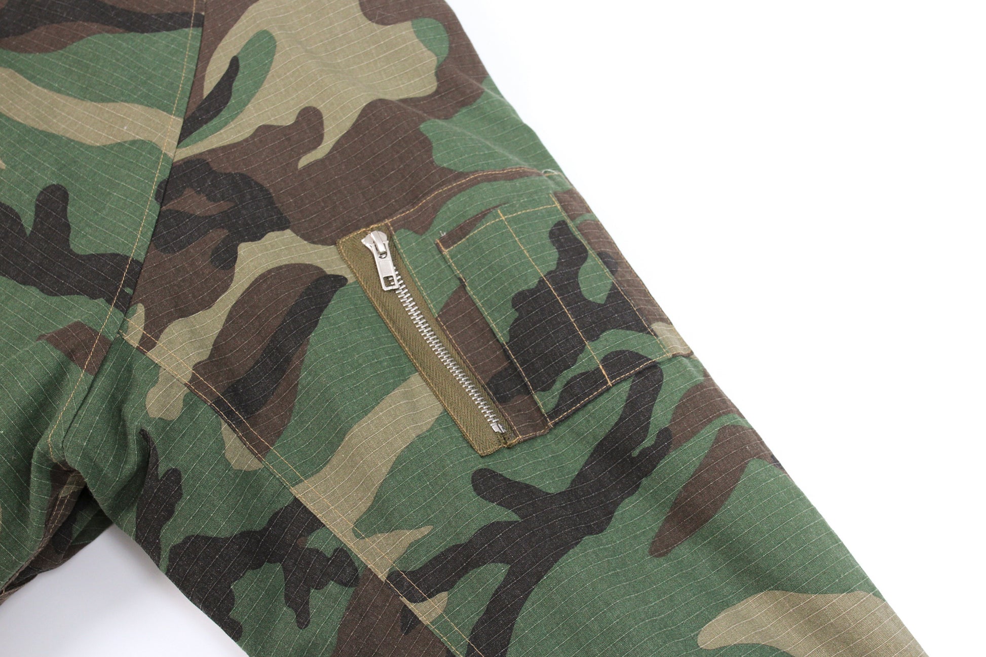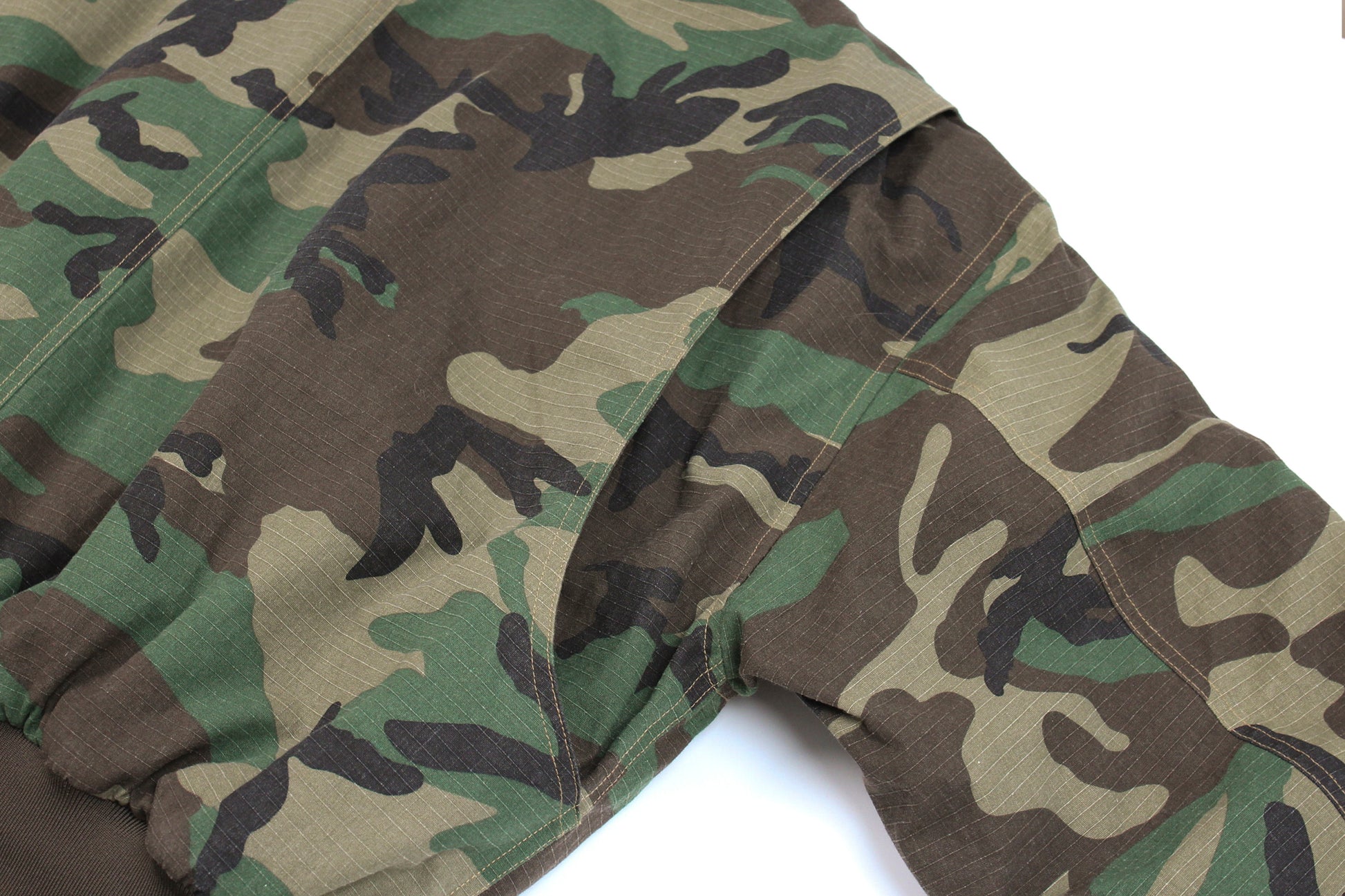 Clothing details: Detachable faux-fur hood trim, ribbed hem and cuffs, multiple utility pockets, front zipper with button placket, all-over camouflage print.