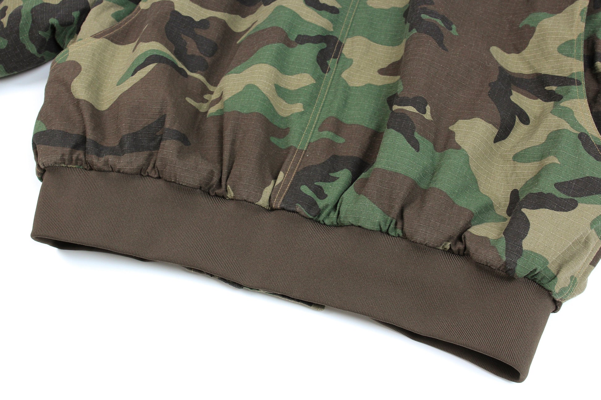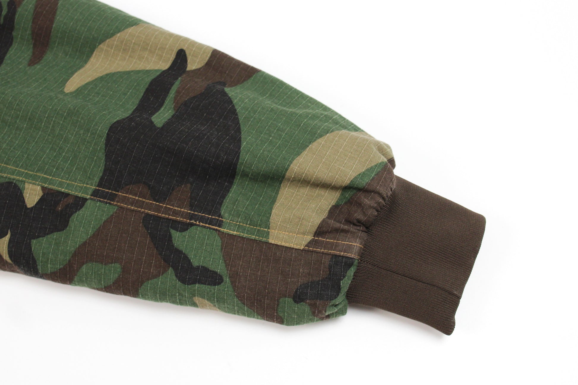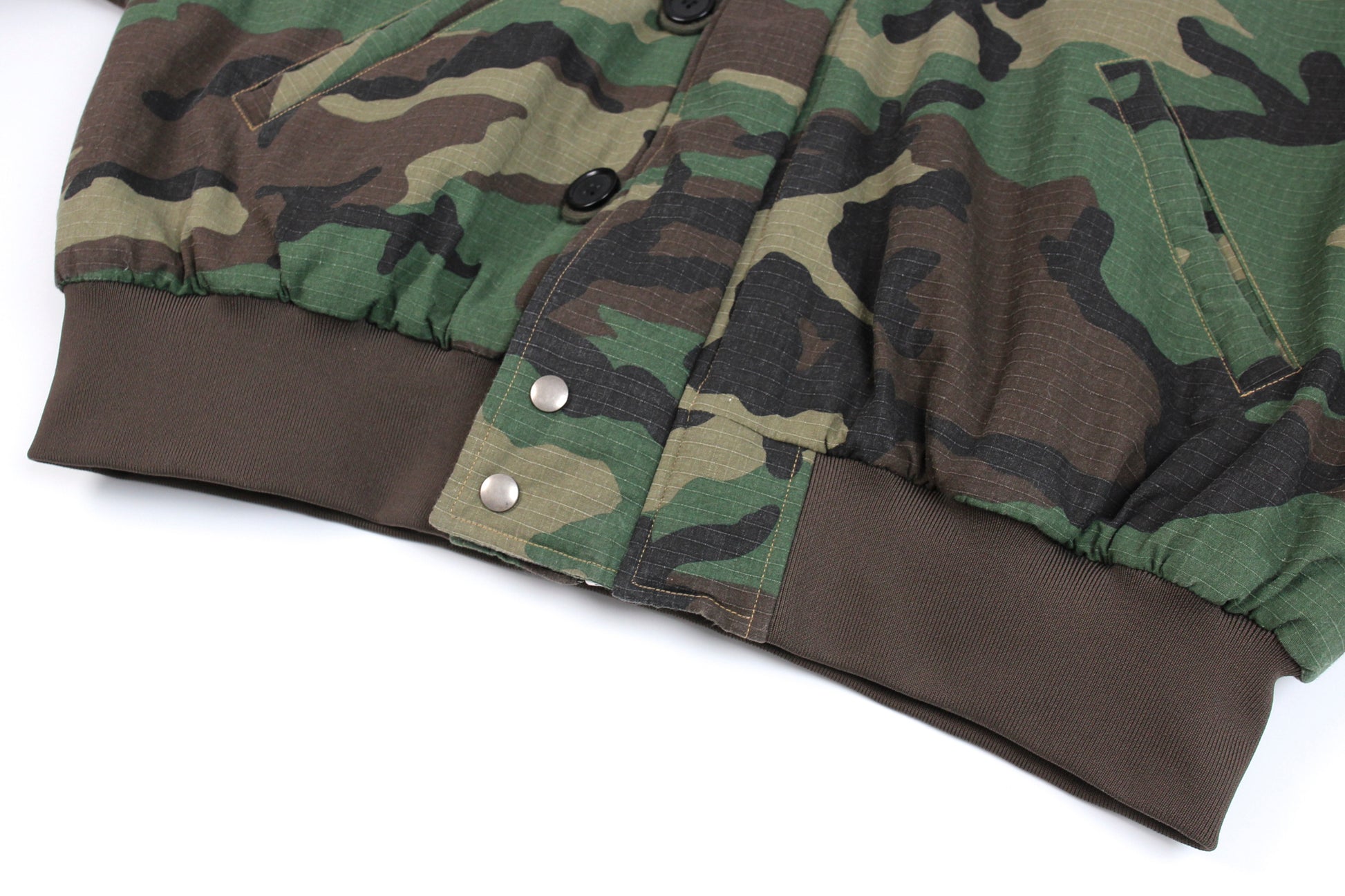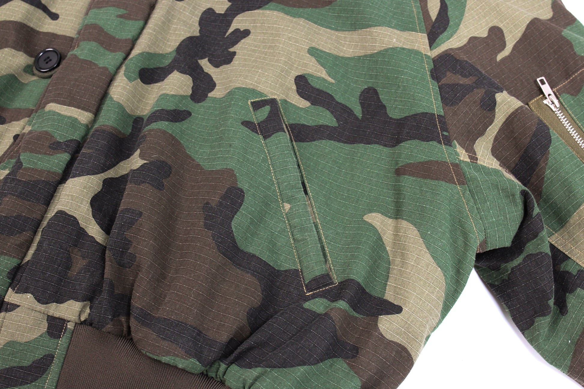 Clothing details: Detachable faux-fur hood trim, ribbed hem and cuffs, multiple utility pockets, front zipper with button placket, all-over camouflage print.