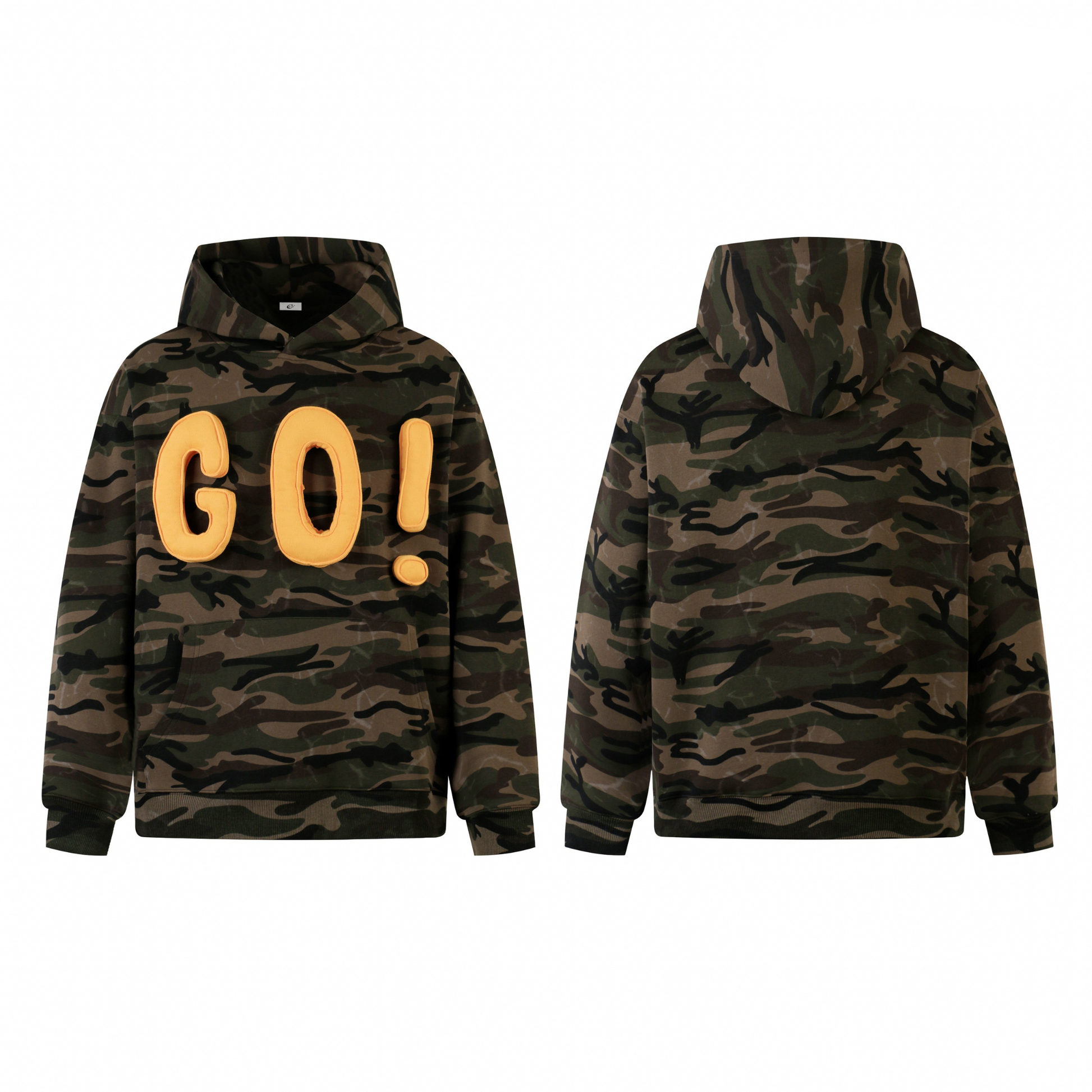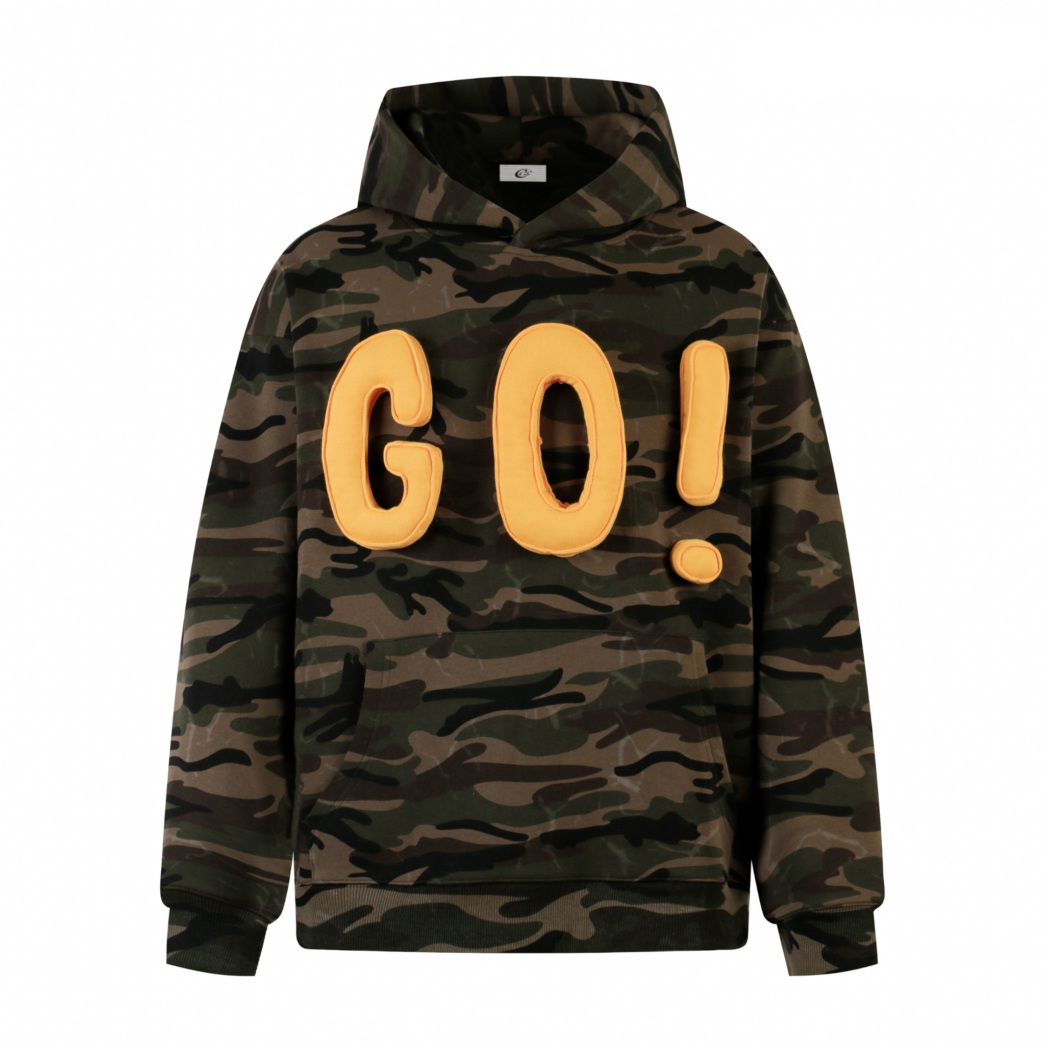 Clothing Details: Camouflage pattern, 3D puff “GO!” lettering, kangaroo pocket, ribbed cuffs and hem, relaxed streetwear fit