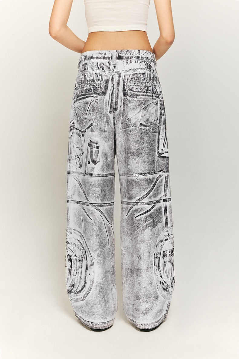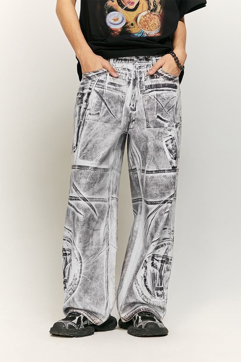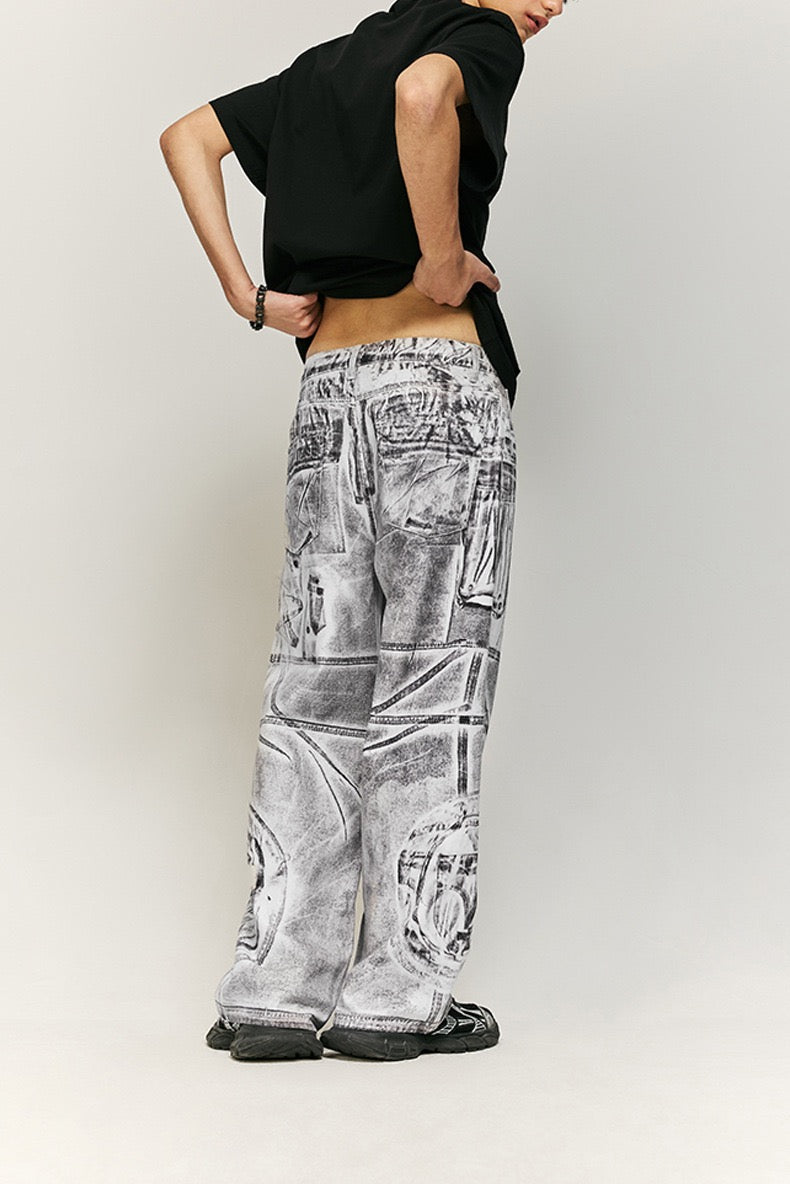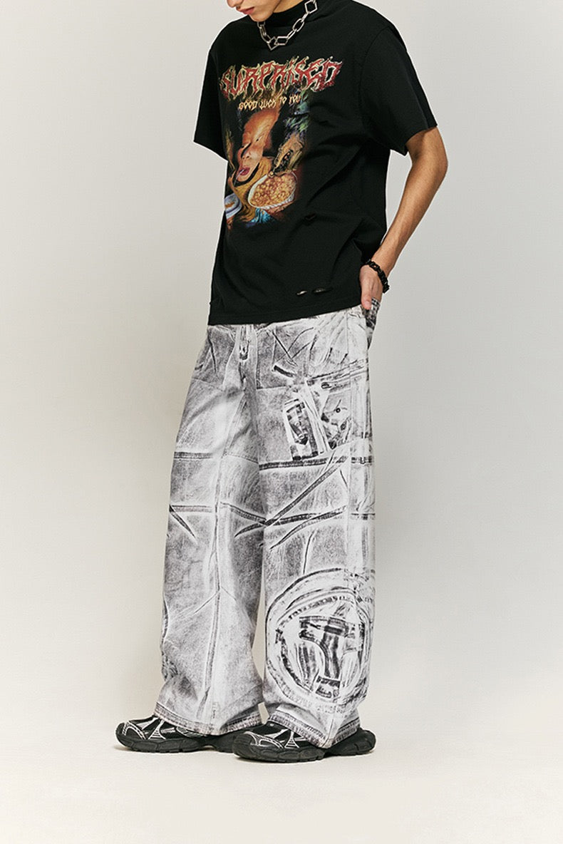 American Streetwear Color-Blocked Distressed Graphic Print Denim Jeans