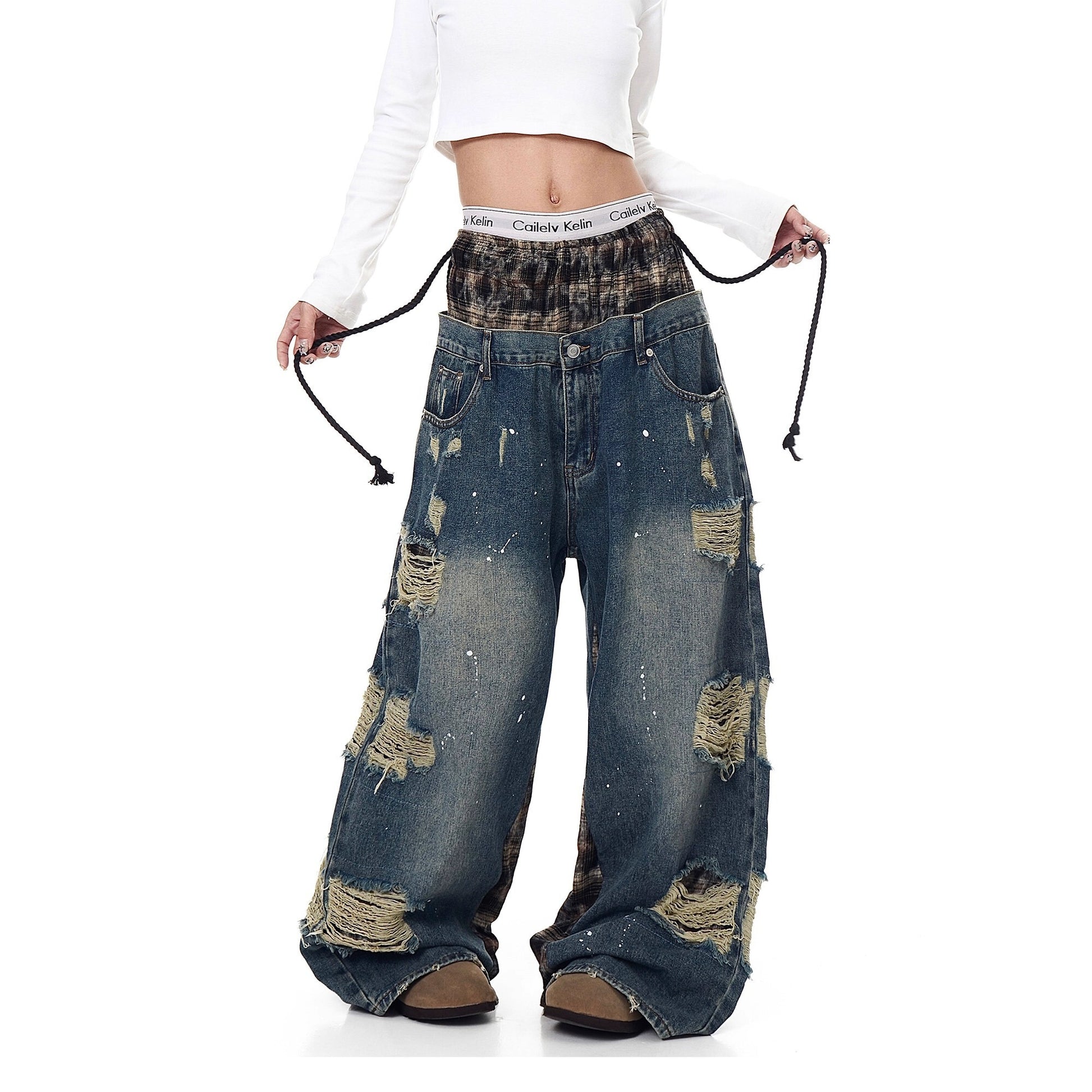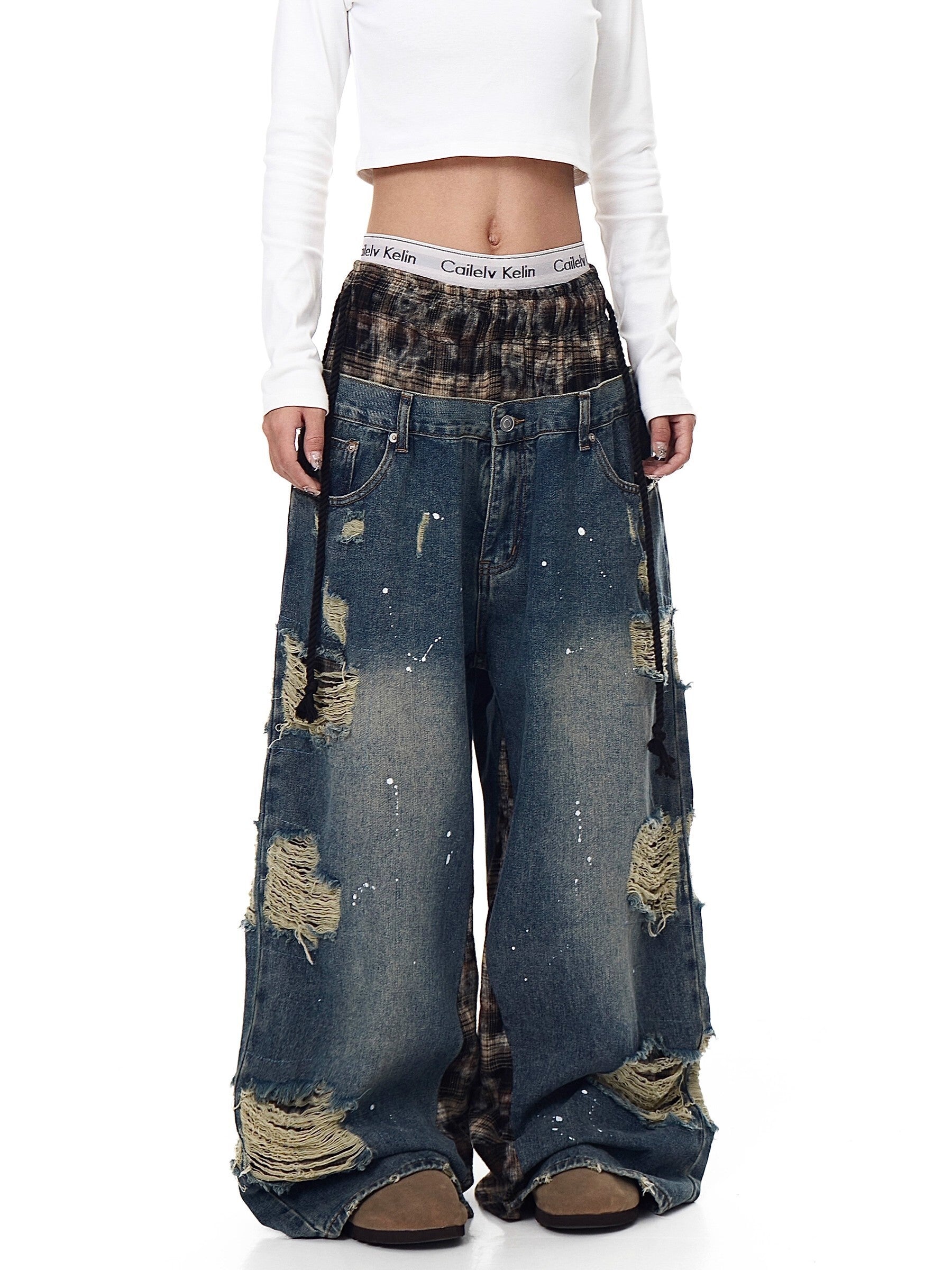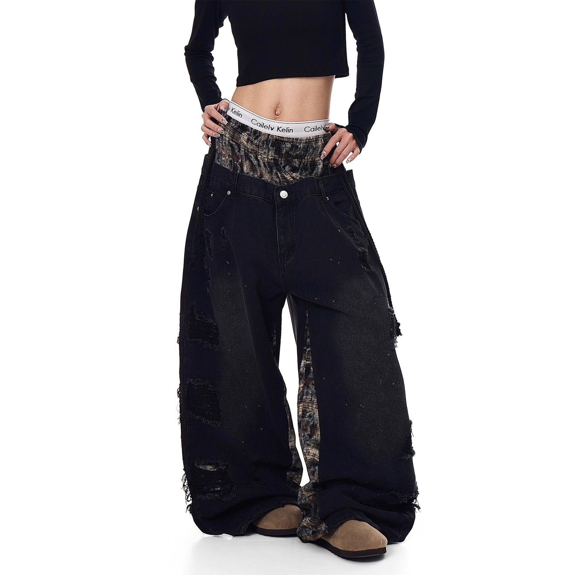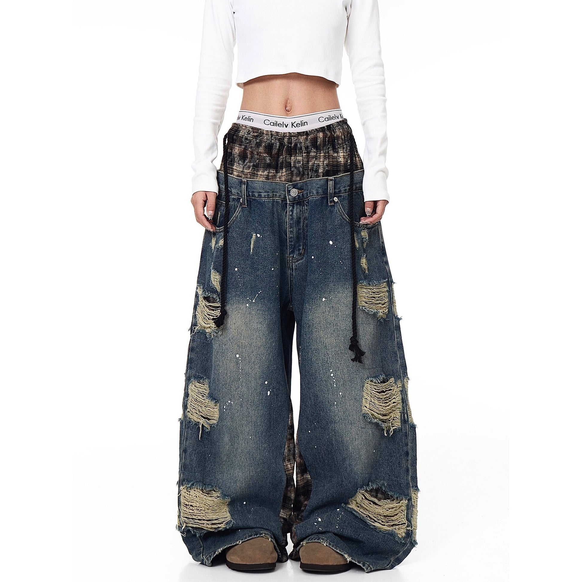 American Streetwear Double-Waist Plaid Patchwork Wide-Leg Jeans