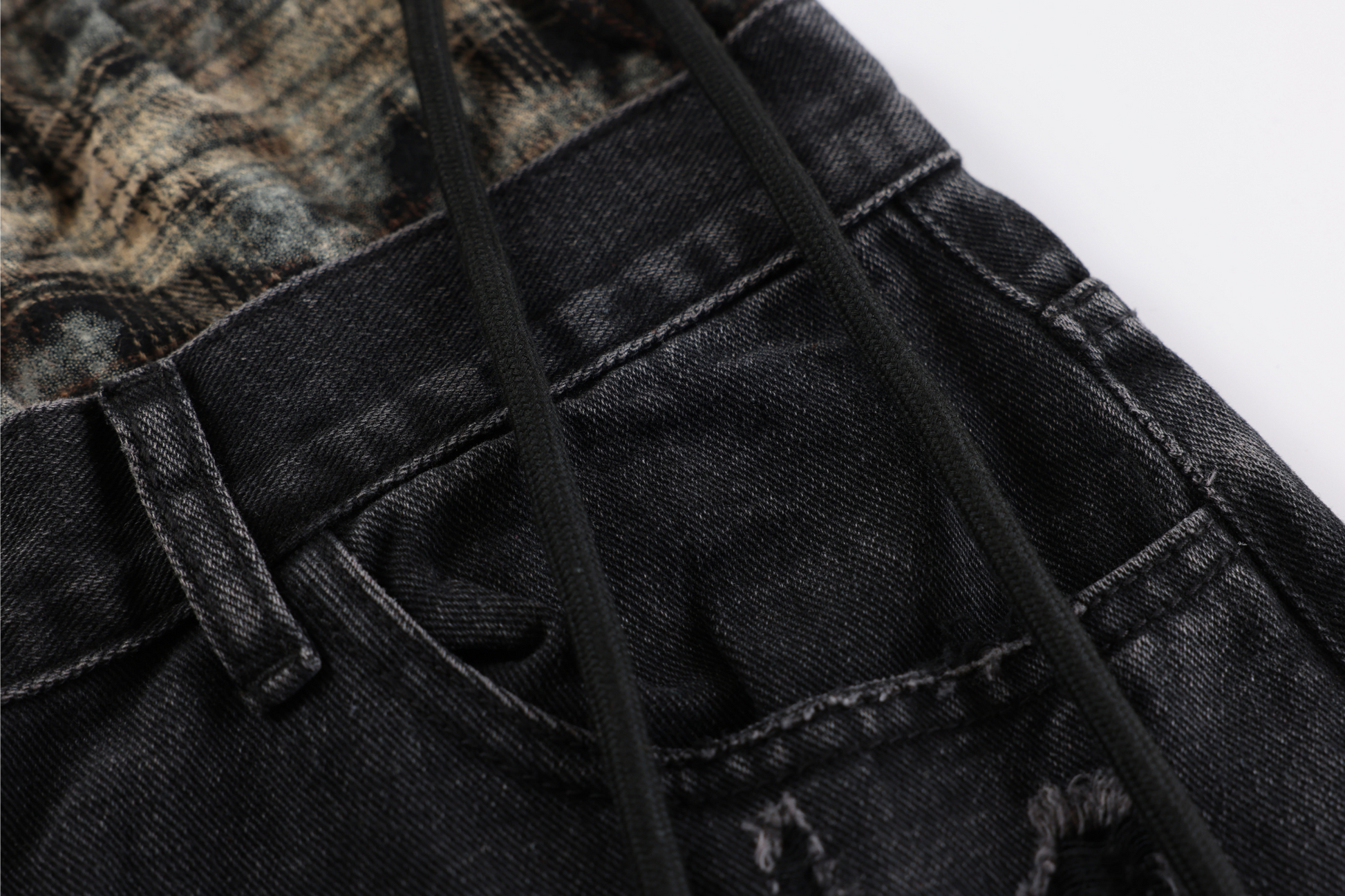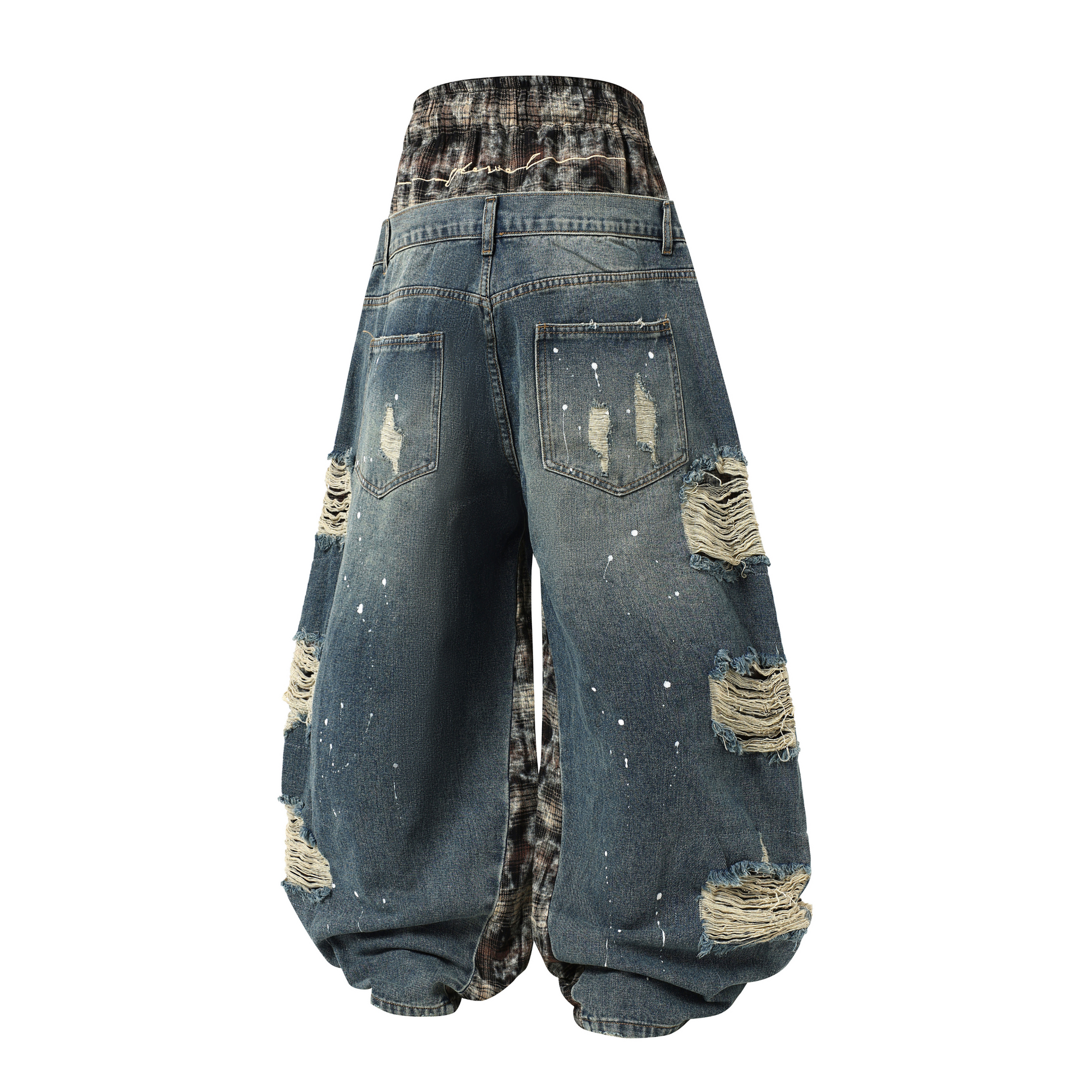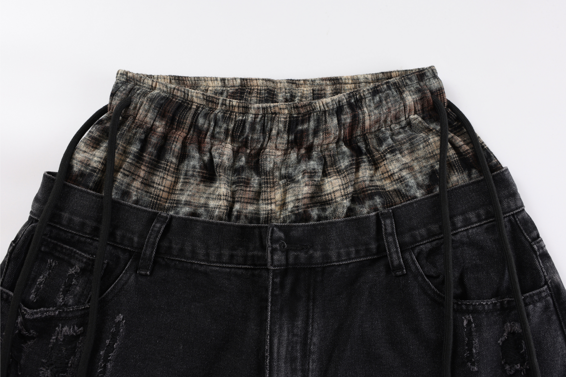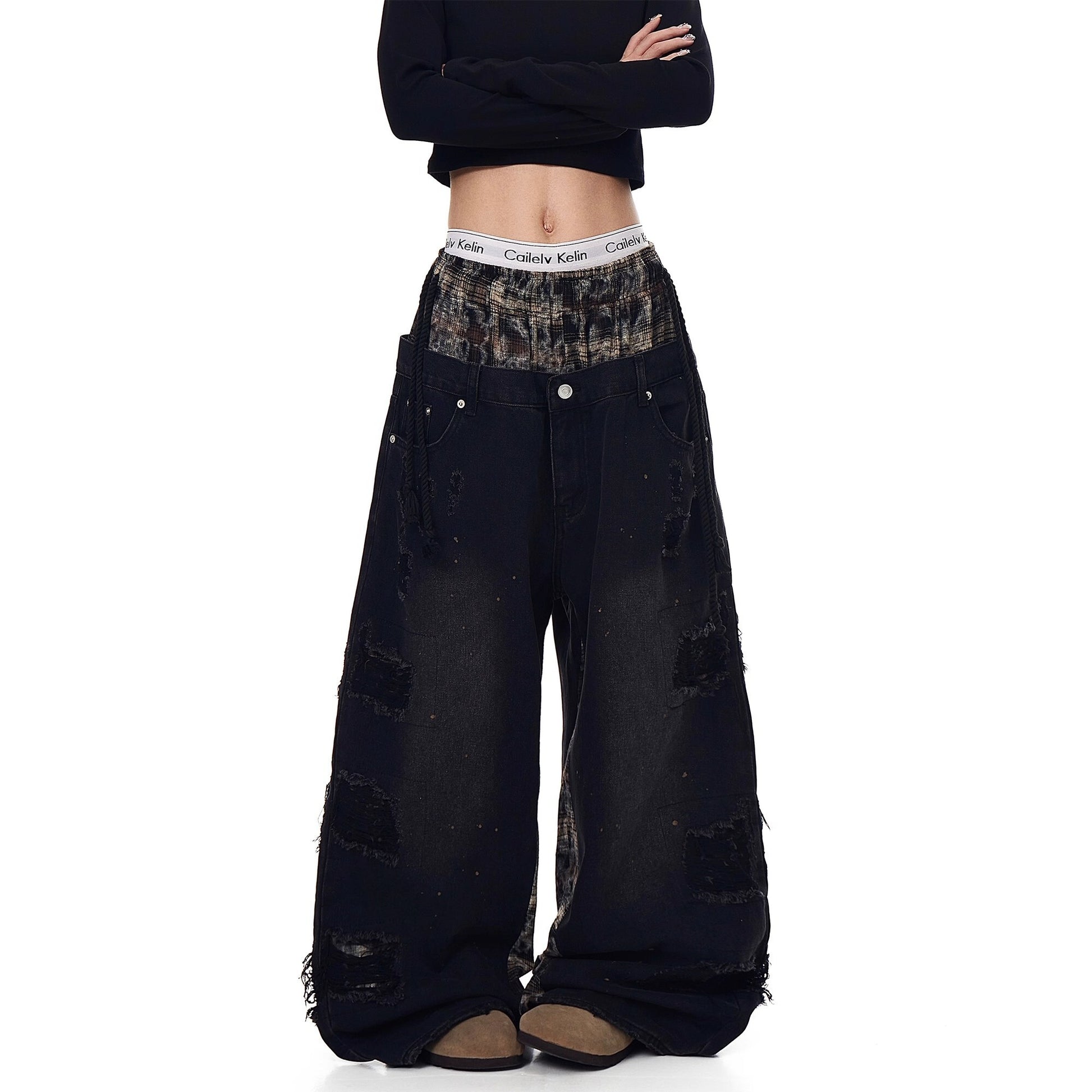 American Streetwear Double-Waist Plaid Patchwork Wide-Leg Jeans