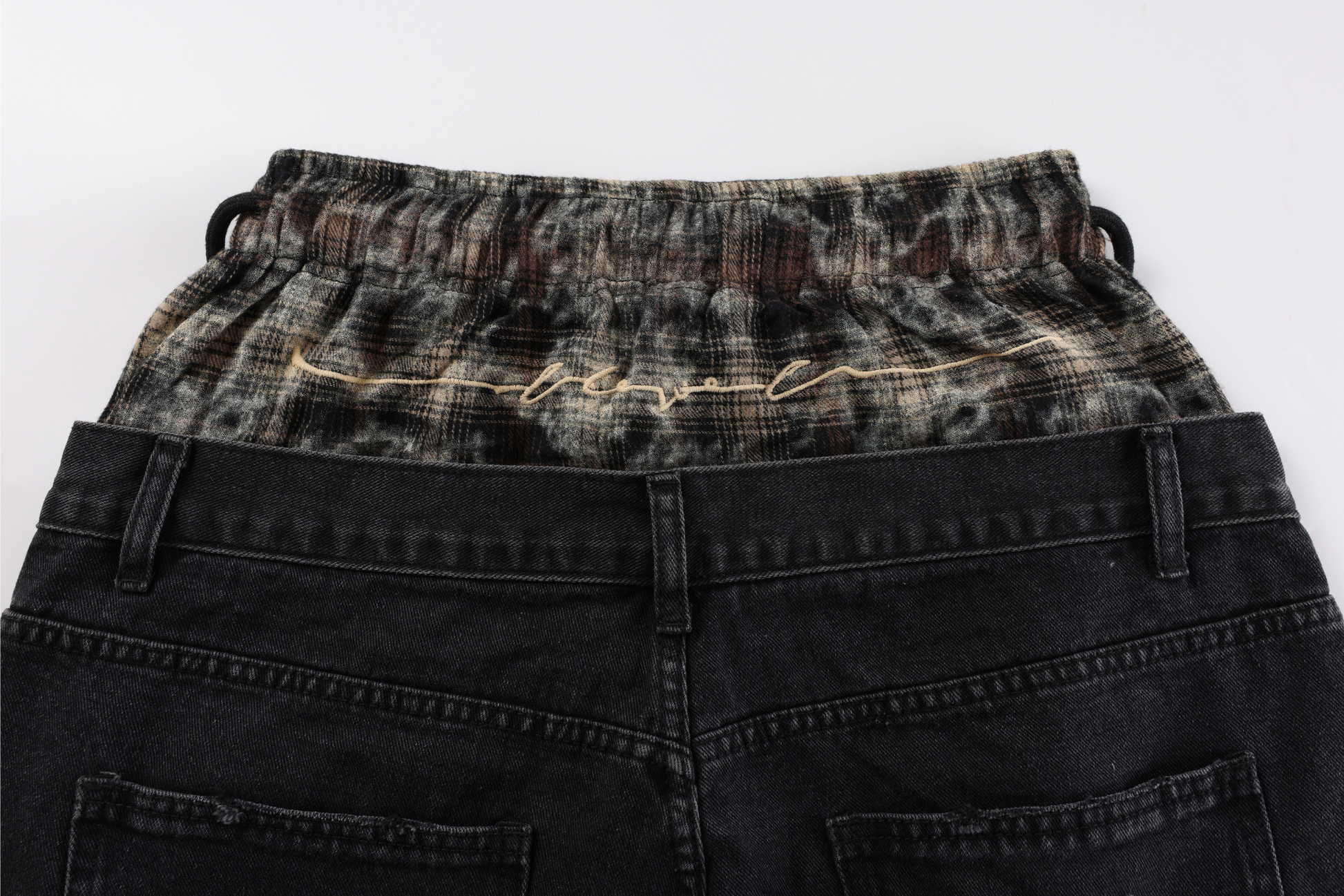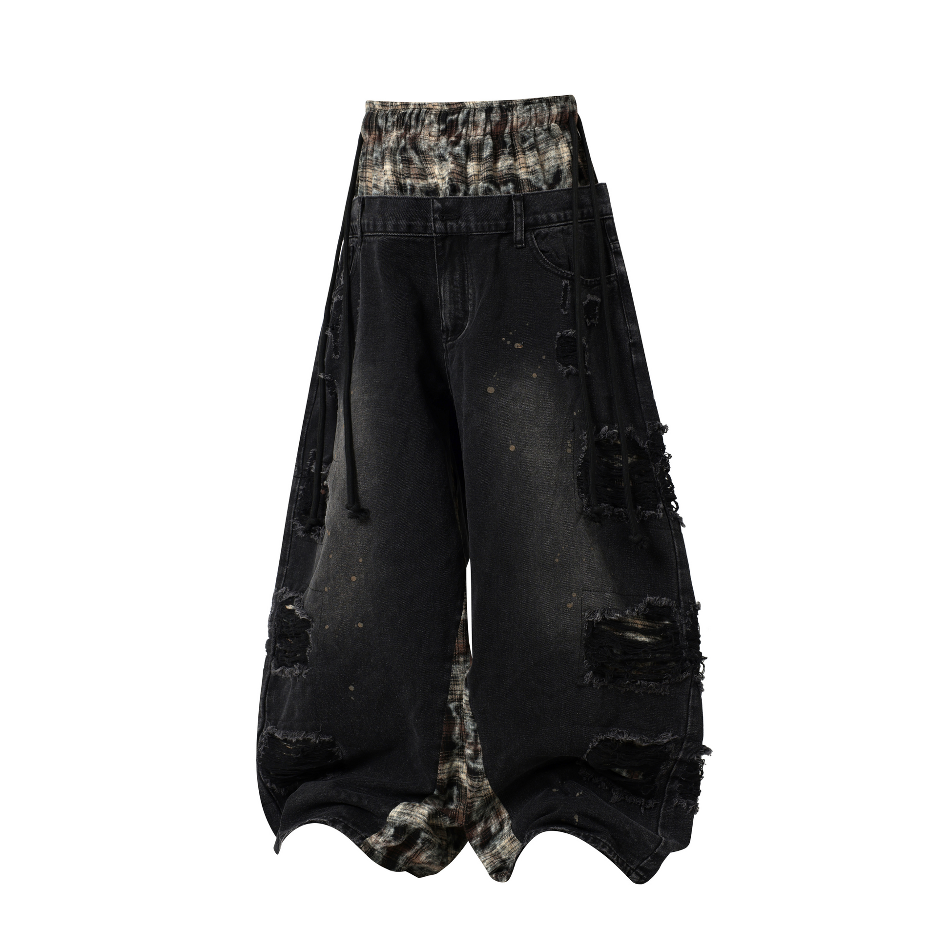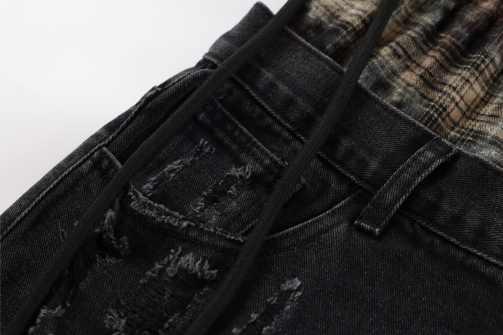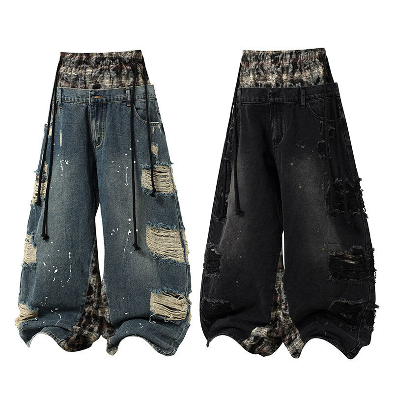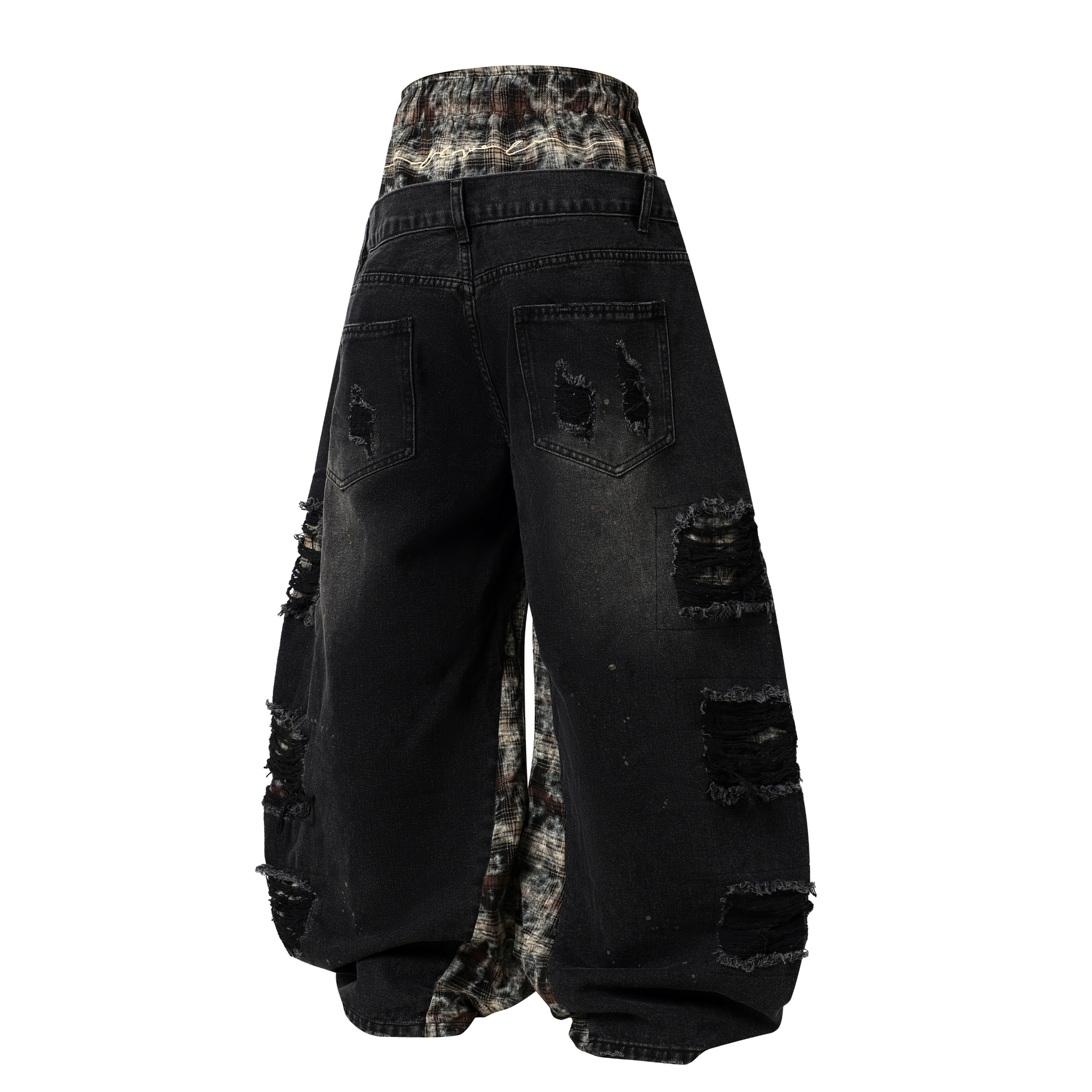 American Streetwear Double-Waist Plaid Patchwork Wide-Leg Jeans