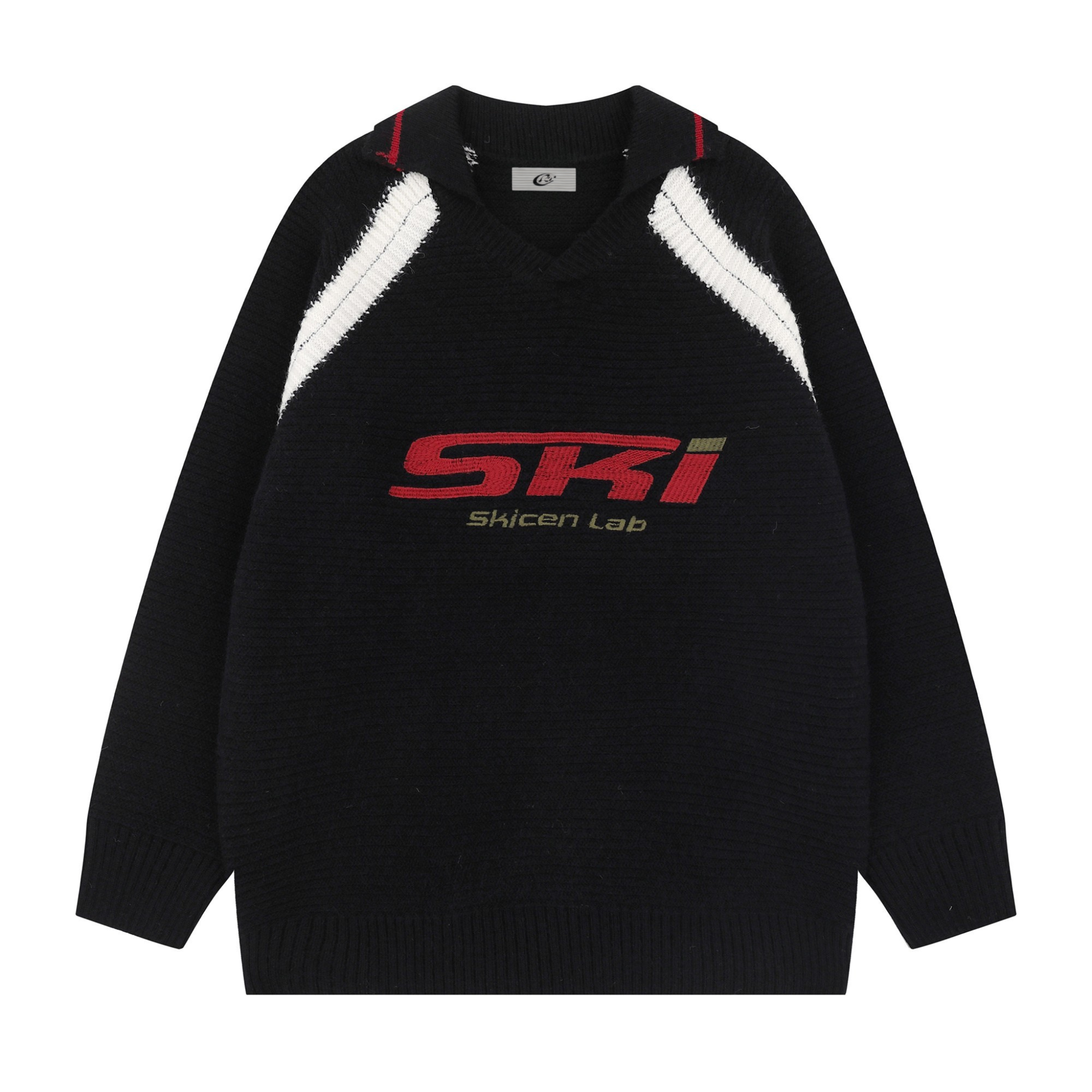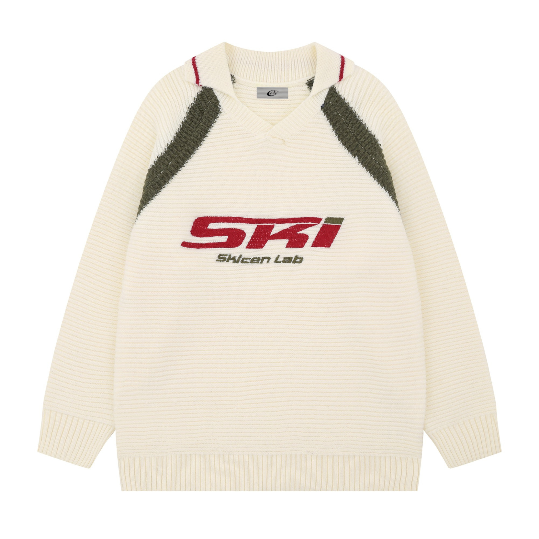 The Omirad Ski Panel Knit Sweater features bold athletic-inspired chest lettering paired with contrast shoulder paneling for a dynamic retro sports look. Perfect for elevating everyday streetwear, this sweater blends soft warmth with standout ski-style detailing.