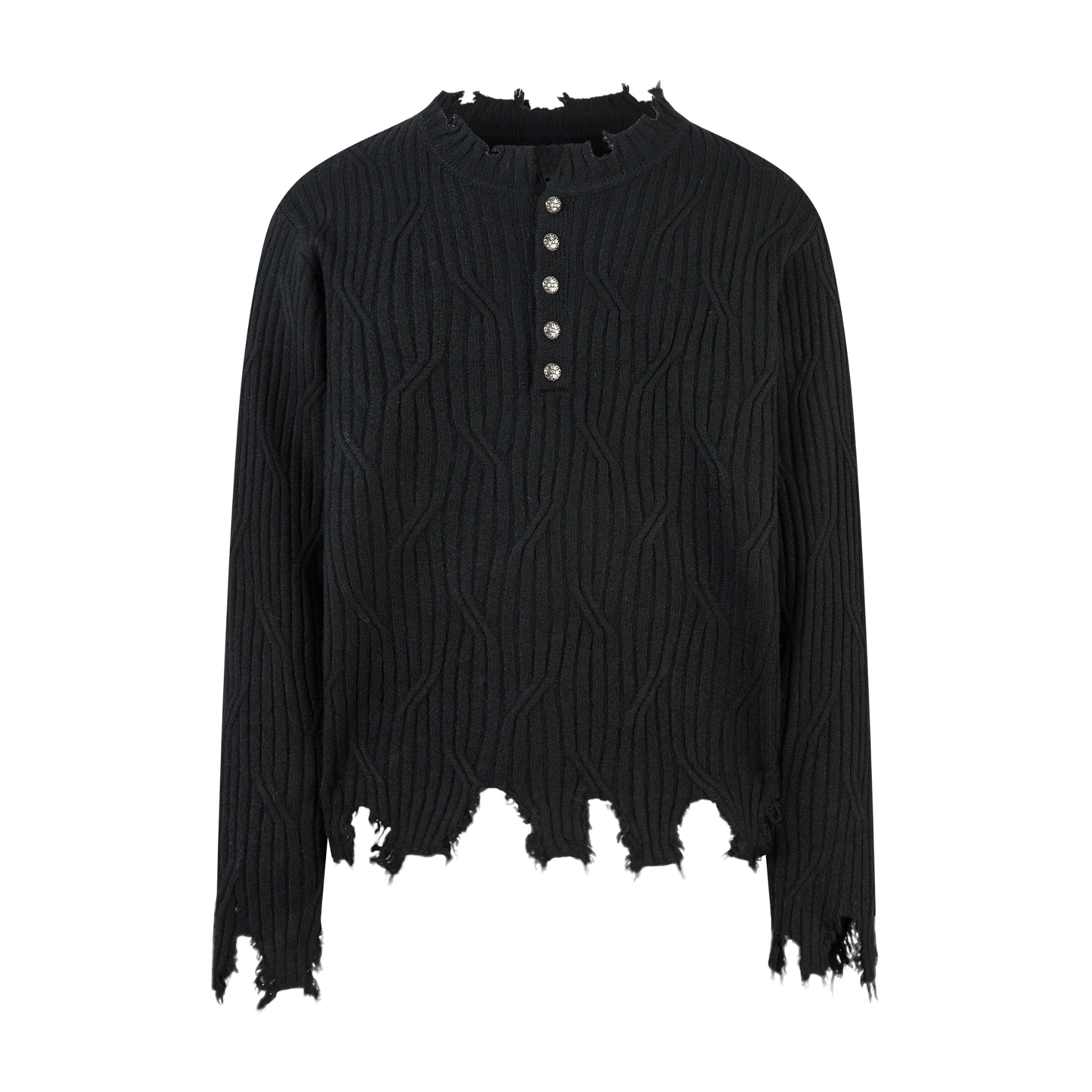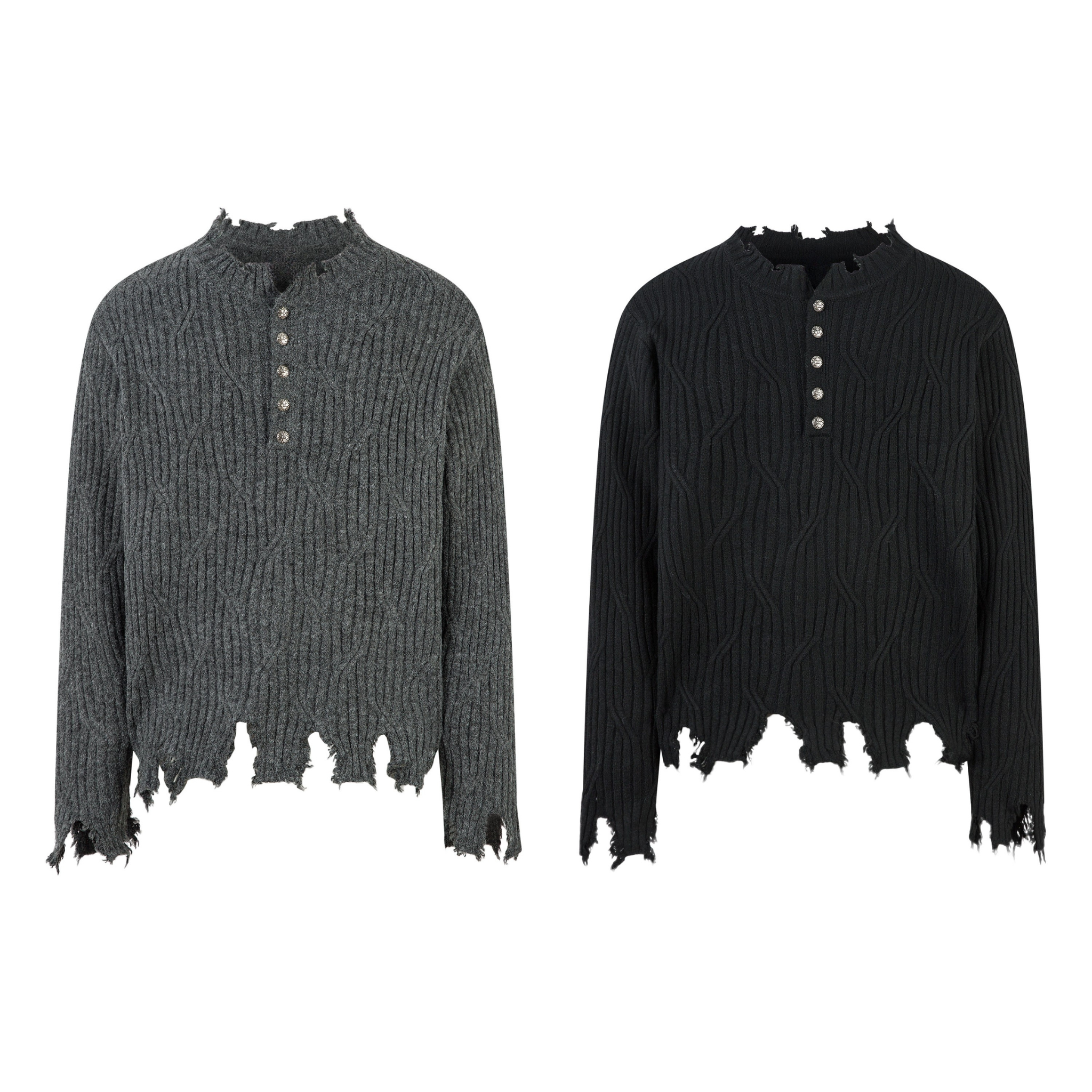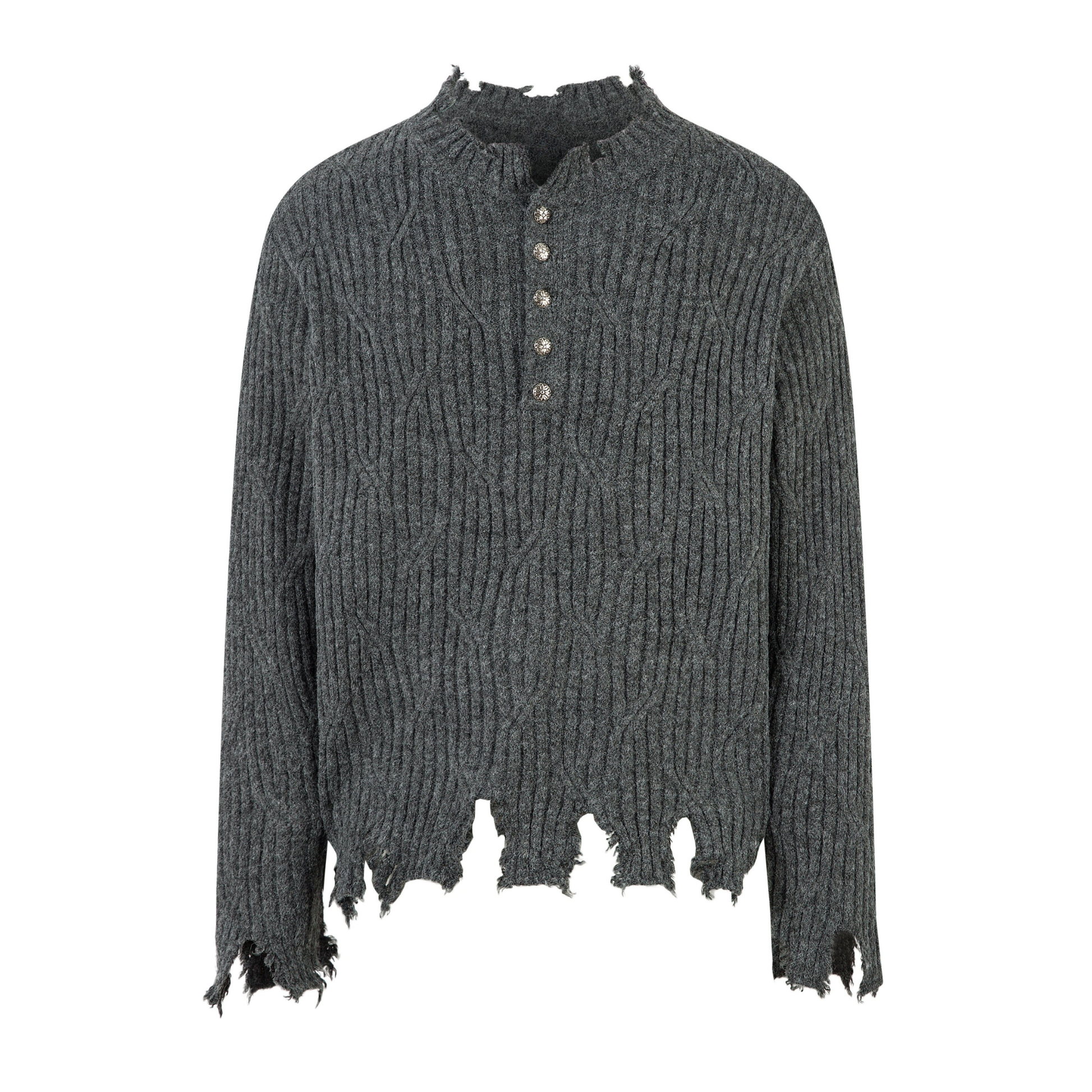 The Omirad Distressed Ribbed Henley Knit features a textured rib-knit pattern with a raw, heavily distressed hem and neckline for a grunge-inspired streetwear look. Made from a soft, stretchy blend of polyester, acrylic, wool, nylon, and spandex, it delivers comfort with bold attitude.