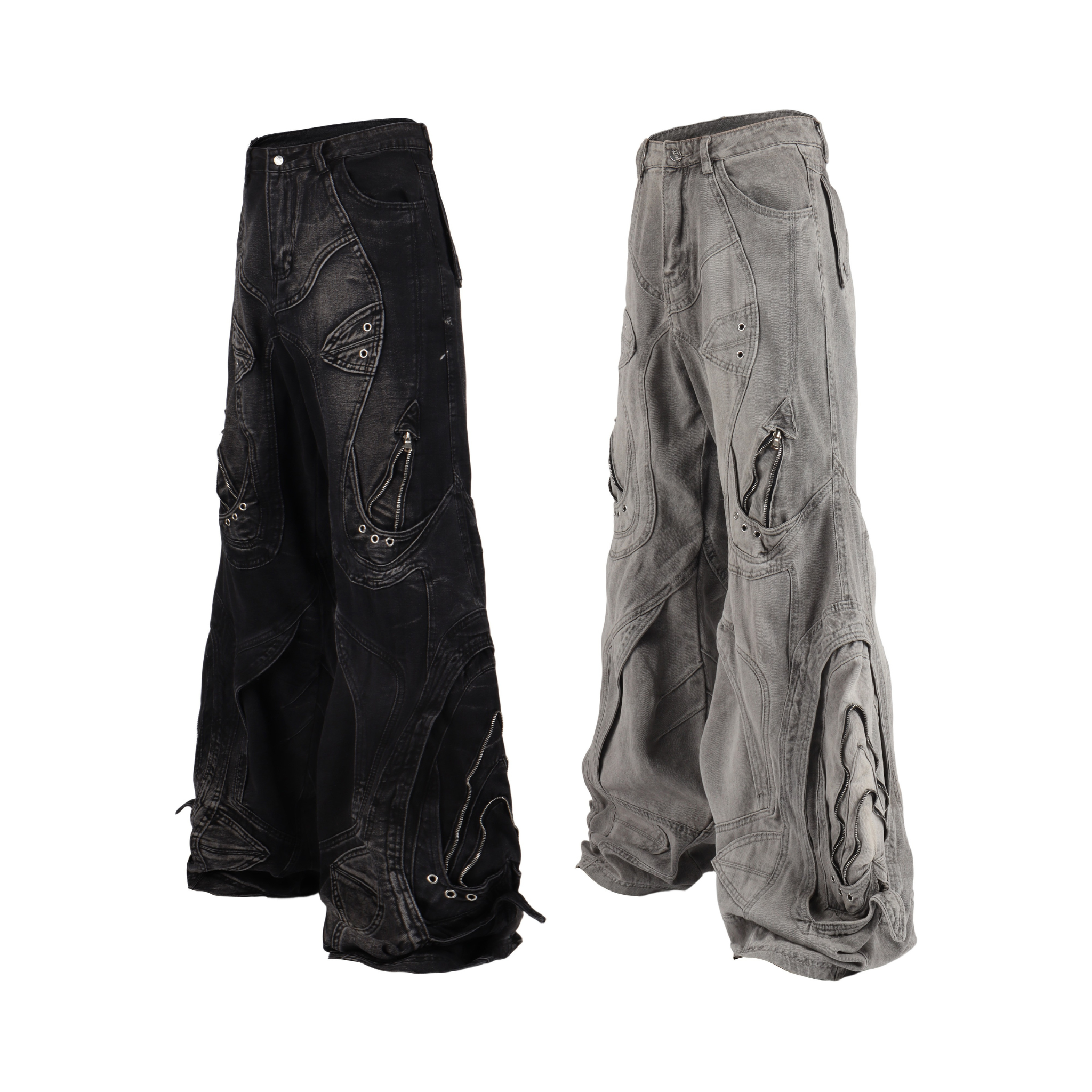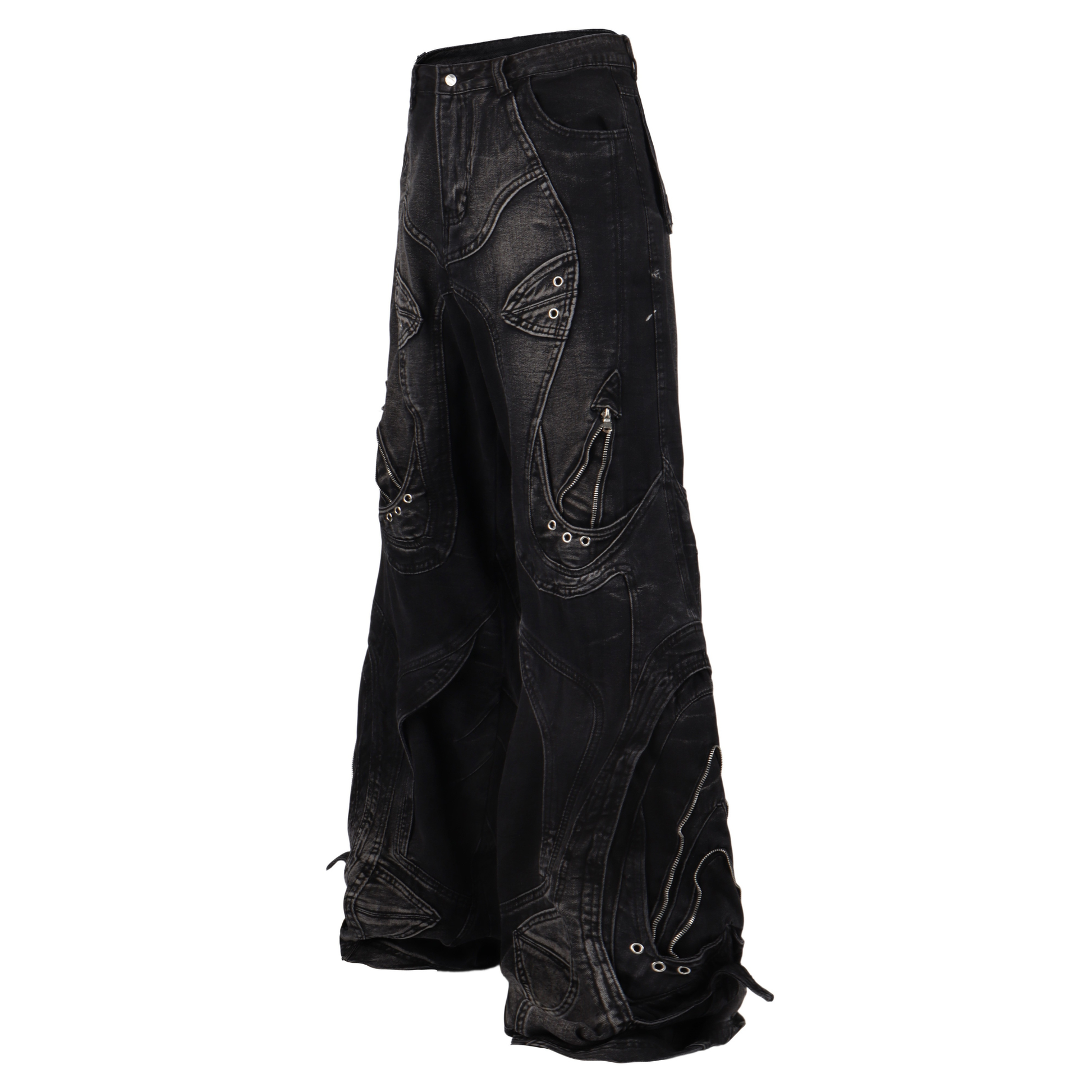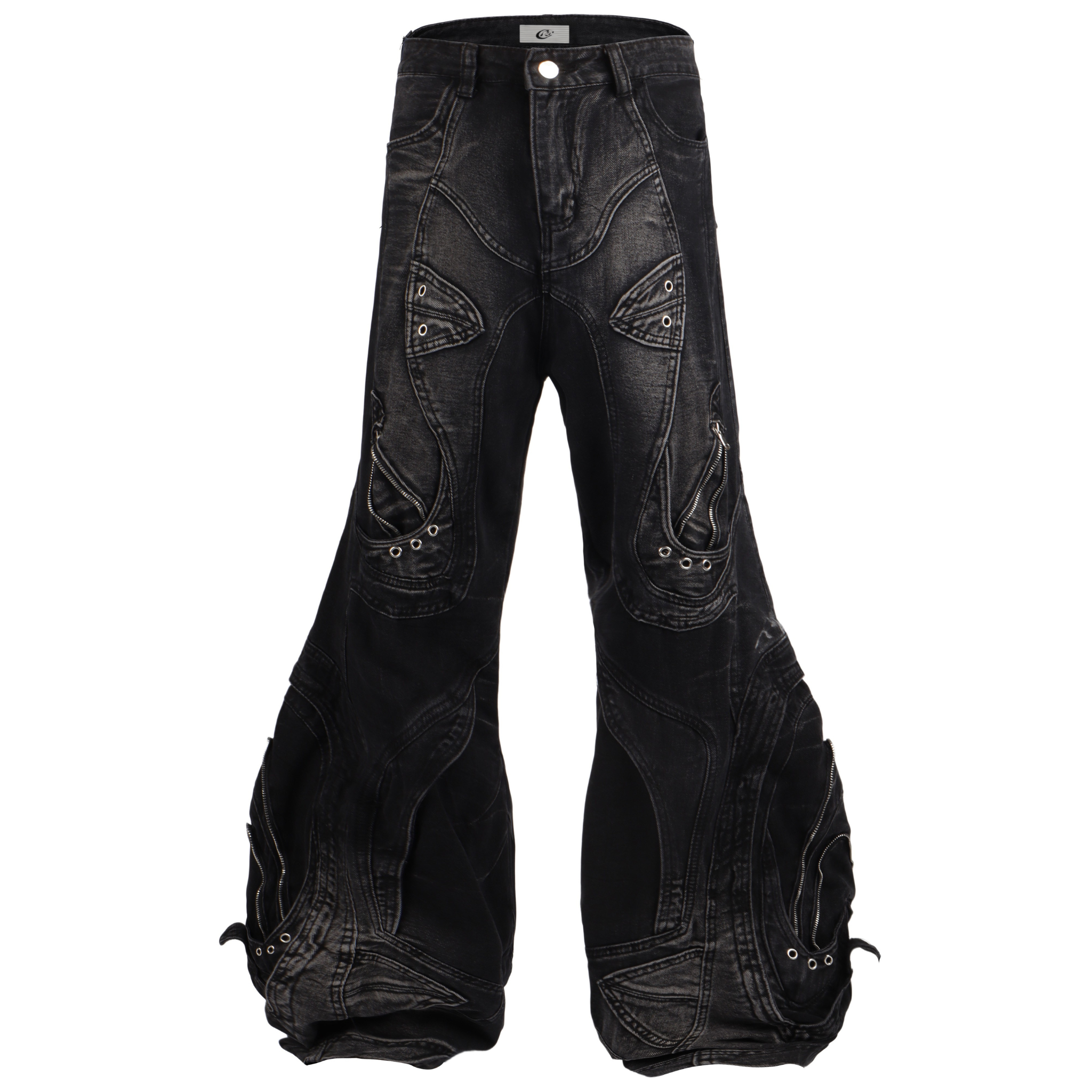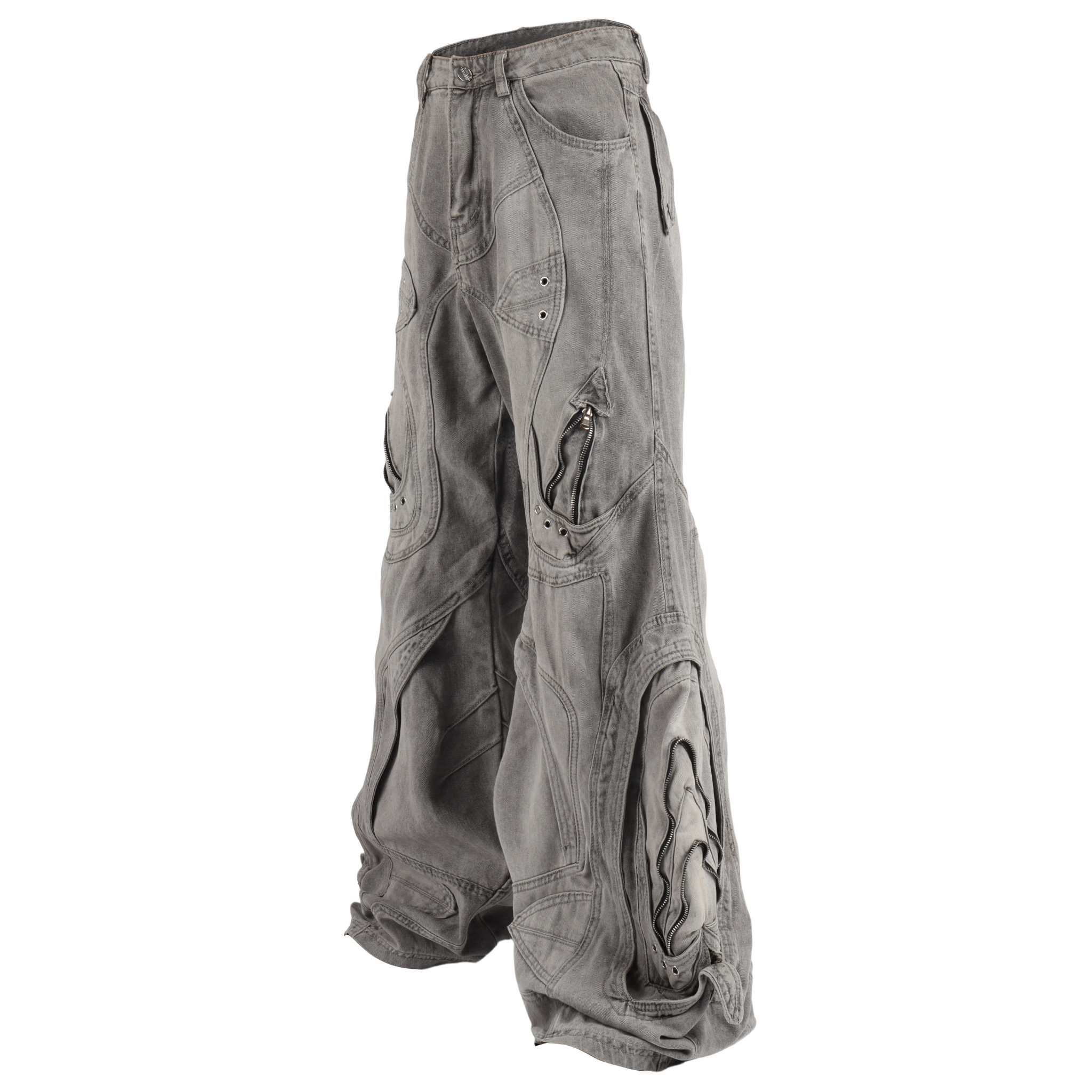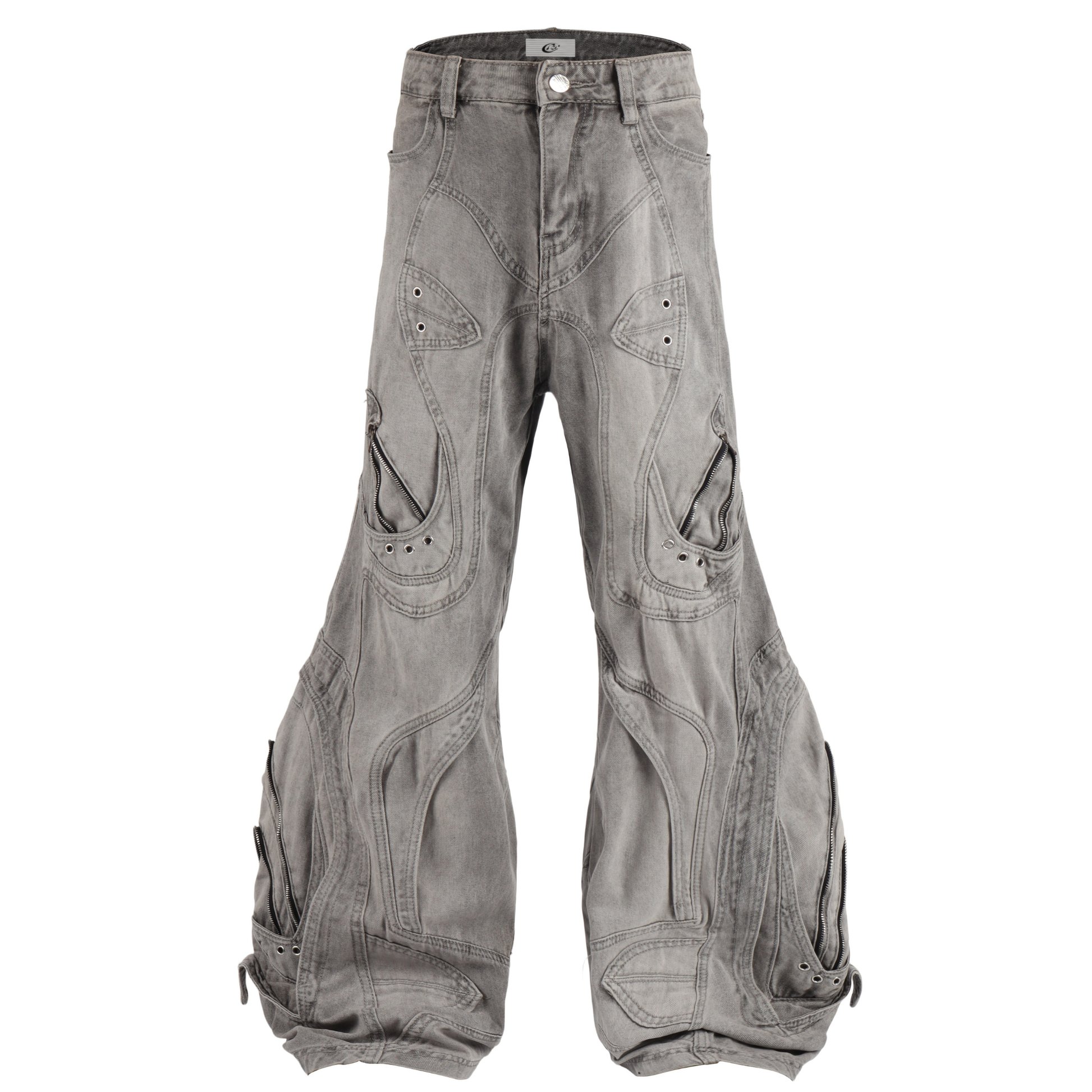 The Omirad Deconstructed Barrel Jeans showcase a futuristic silhouette with extreme volume and multi-panel detailing. Crafted from a unique cotton-blend denim (78% cotton, 11.1% polyester, 10.4% regenerated fibers), these jeans balance durability with a premium washed texture. The asymmetric panel stitching, metal rivets, and curved seams give a sculptural look that embodies the new-wave Y2K aesthetic.