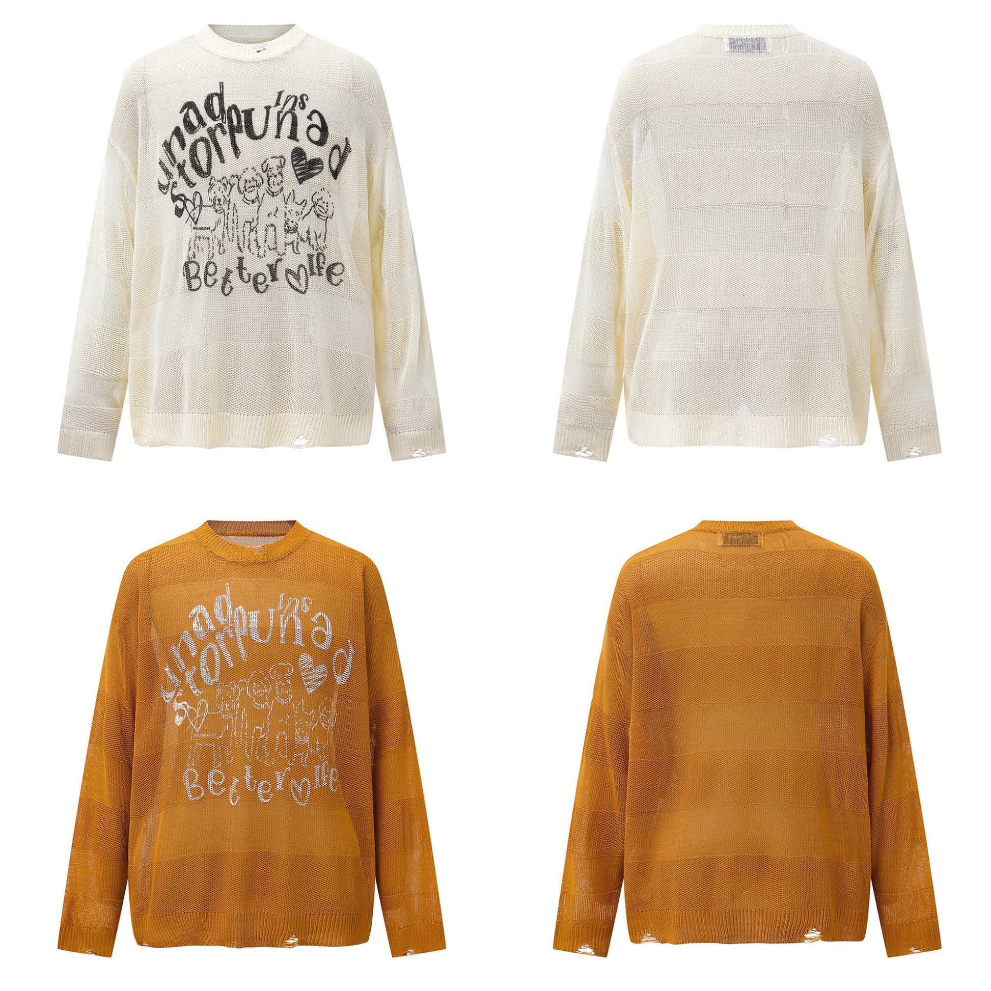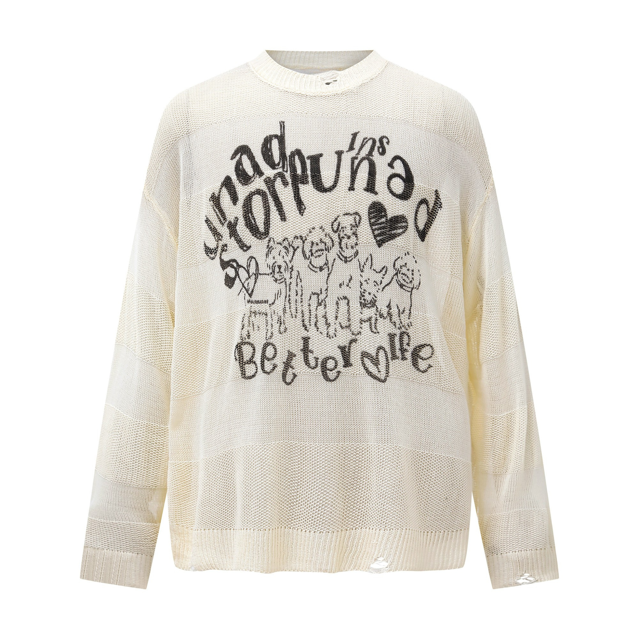 The Omirad Graphic Mesh Knit Sweater combines playful artistry with a lightweight streetwear aesthetic. Made from 100% acrylic, this sweater features a semi-sheer mesh knit texture and a hand-drawn graphic design with cartoon-style characters and uplifting typography. The relaxed silhouette and distressed hem details give it a casual, worn-in attitude, perfect for layering over tanks or tees.