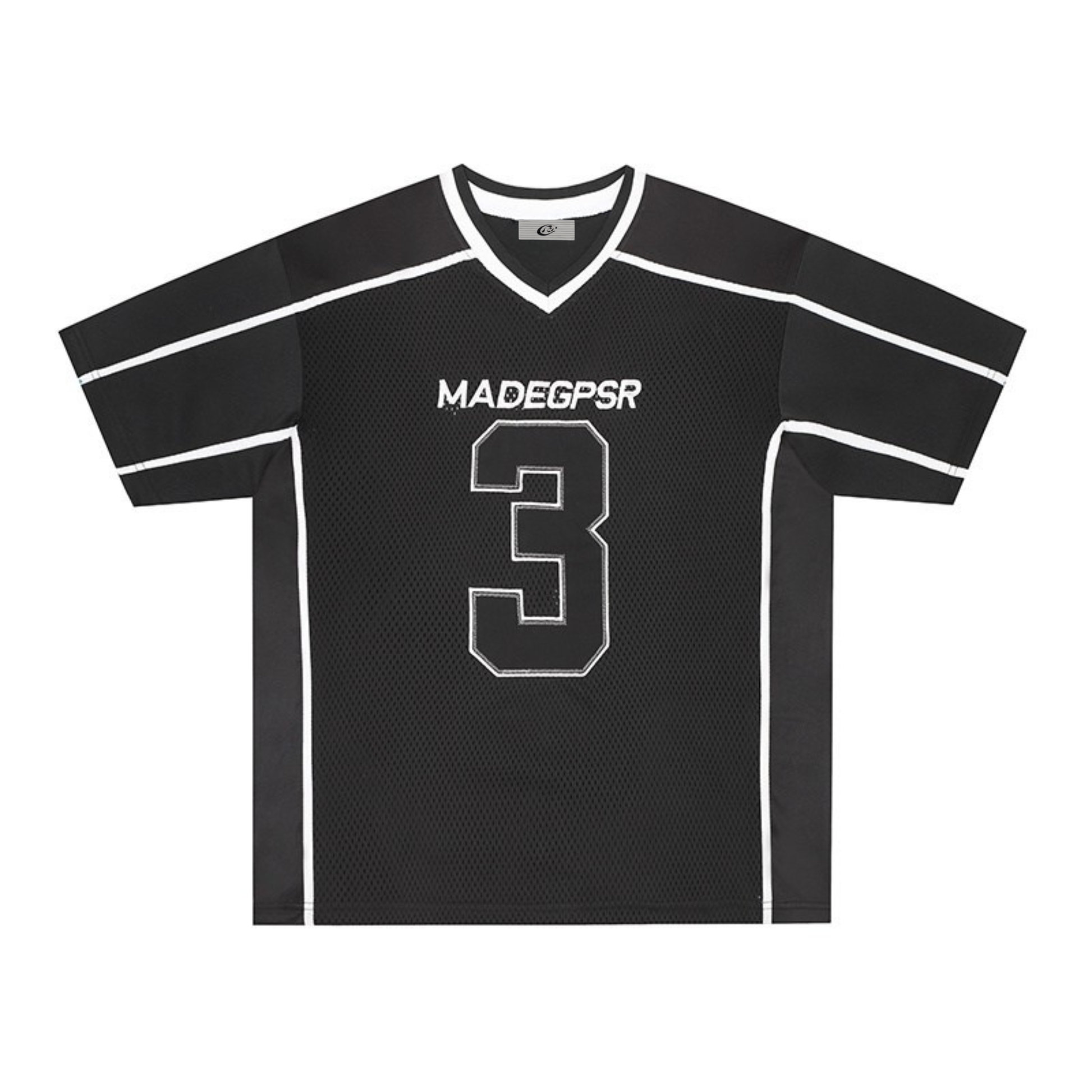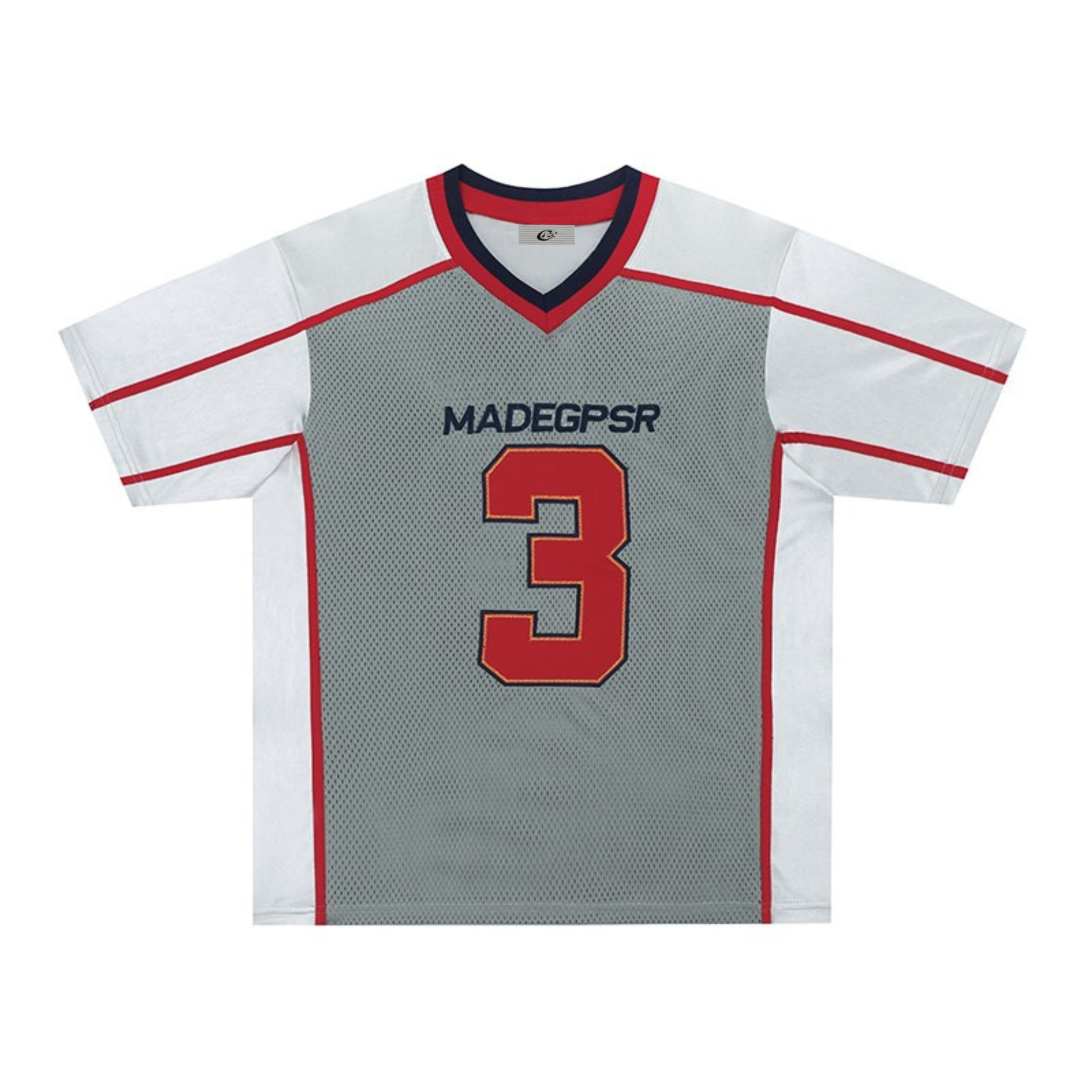 Featuring oversized varsity “3” prints on both the front and back, contrast piping lines, and mesh paneling, this jersey captures the authentic look of classic American football uniforms. The color-block sleeves and sharp shoulder stitching enhance the structured athletic silhouette, while the “MADEGPSR” lettering adds a retro team-inspired touch.