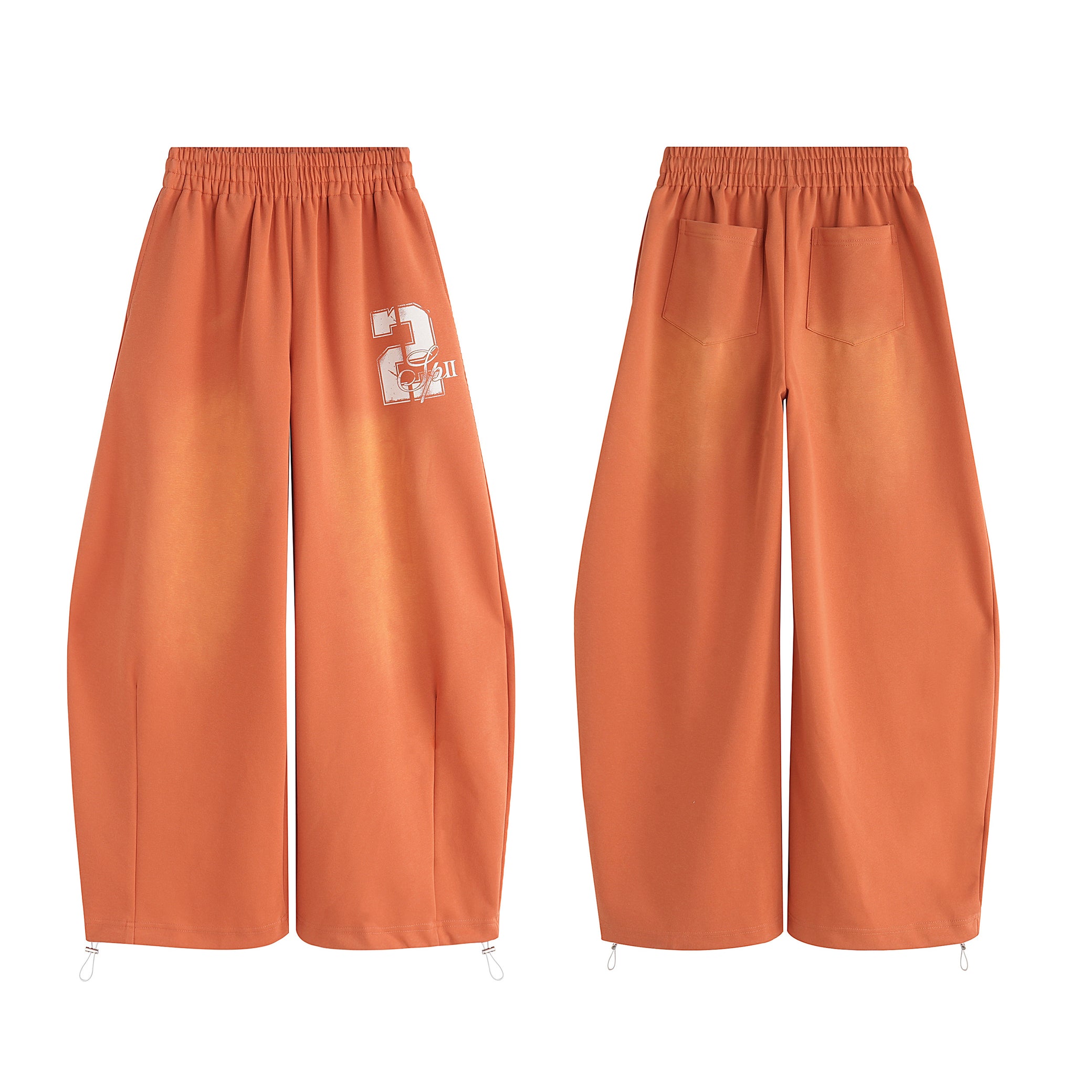 Clothing details: Gradient washed finish, printed “02” logo, elastic waistband with drawstring, adjustable hem cords, relaxed wide-leg fit