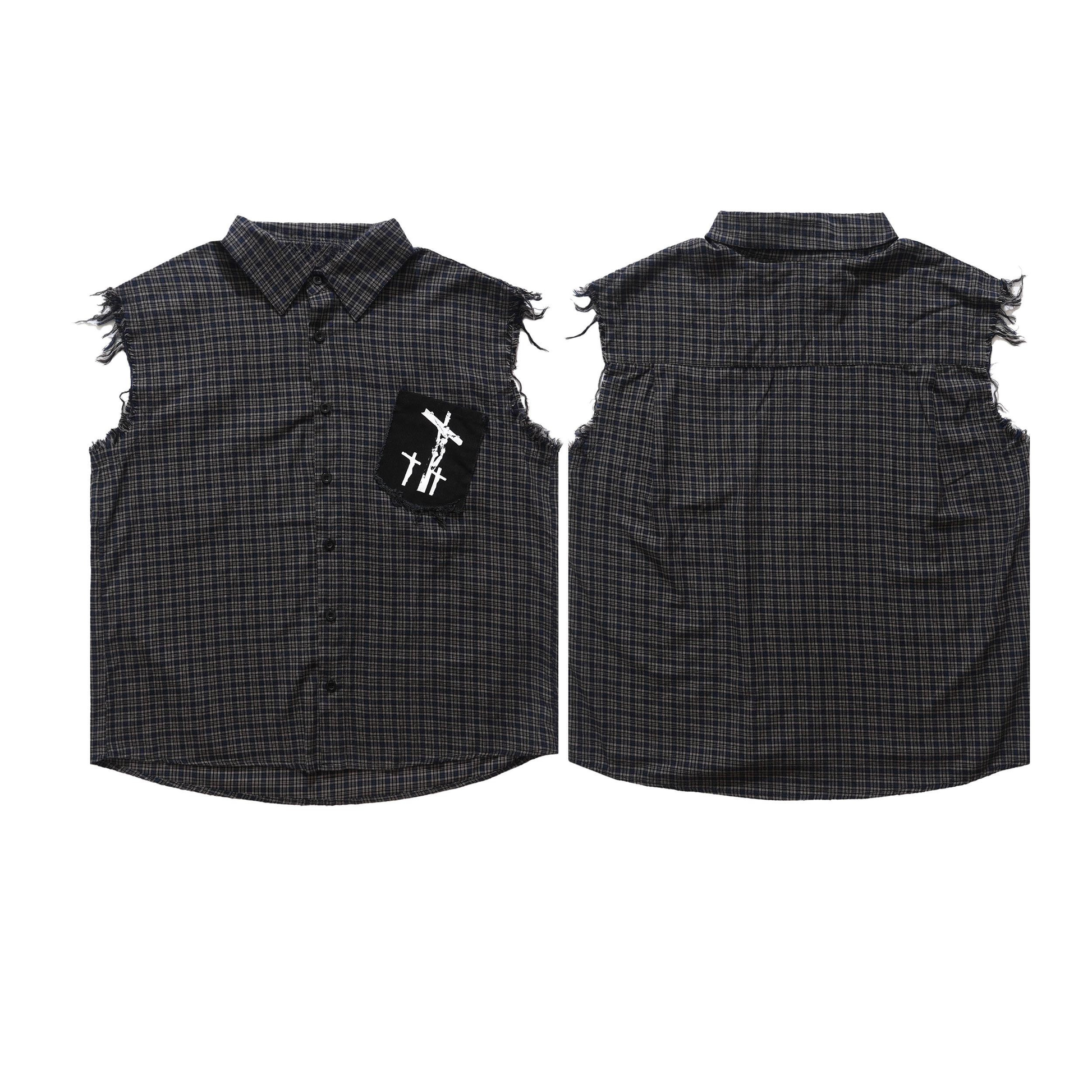 The Omirad Raw-Edge Plaid Sleeveless Cotton Shirt features a classic checkered pattern and distressed cut-off sleeves that bring a rebellious streetwear attitude to a clean utility-inspired silhouette. Perfect for elevating your layered fits, this piece combines breathable comfort with bold DIY-style detailing.