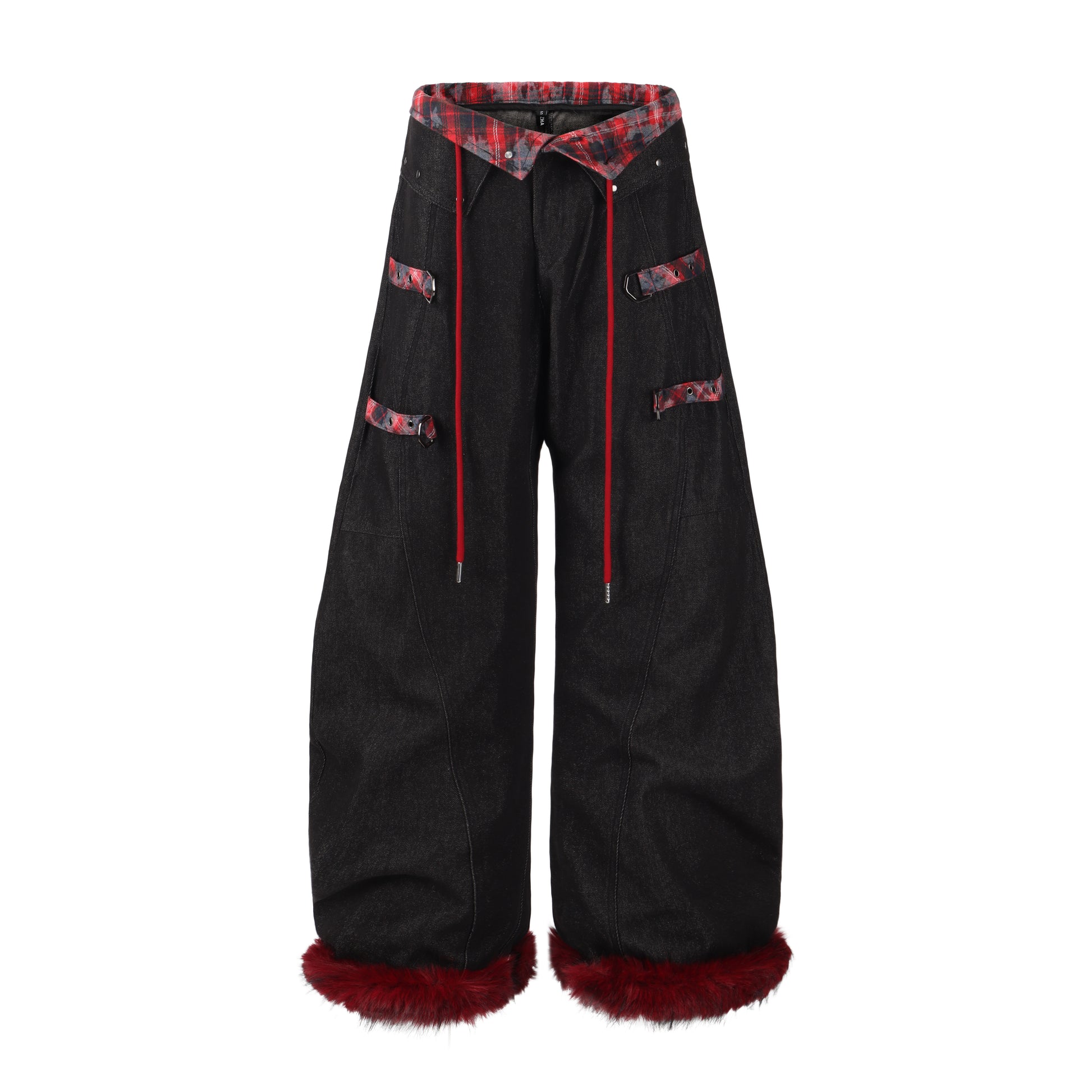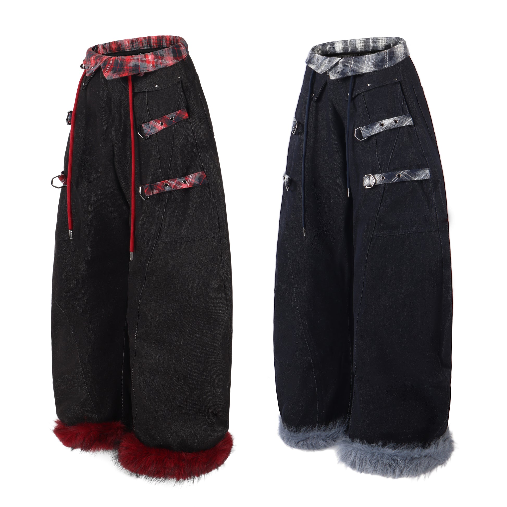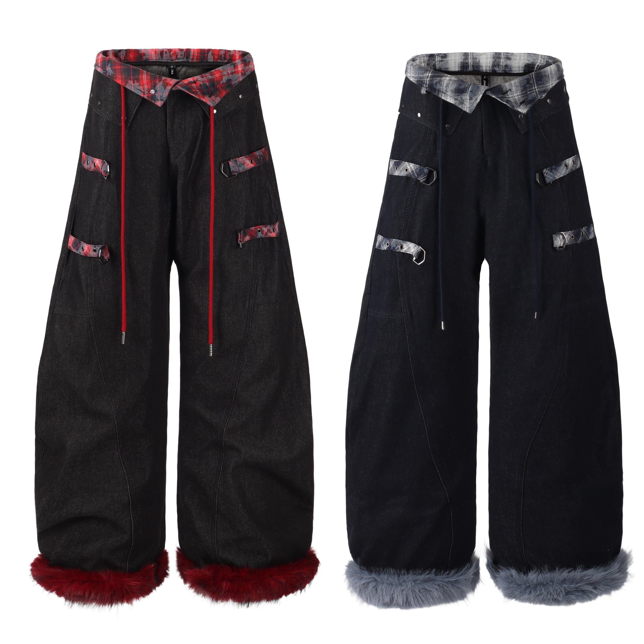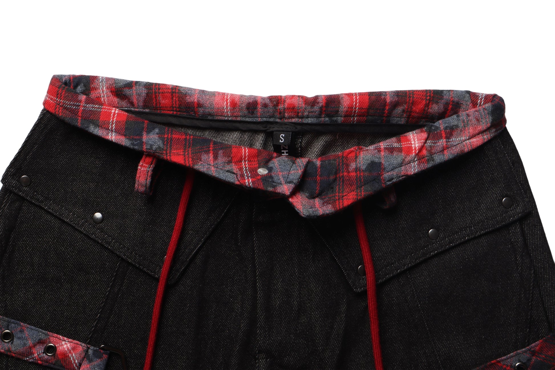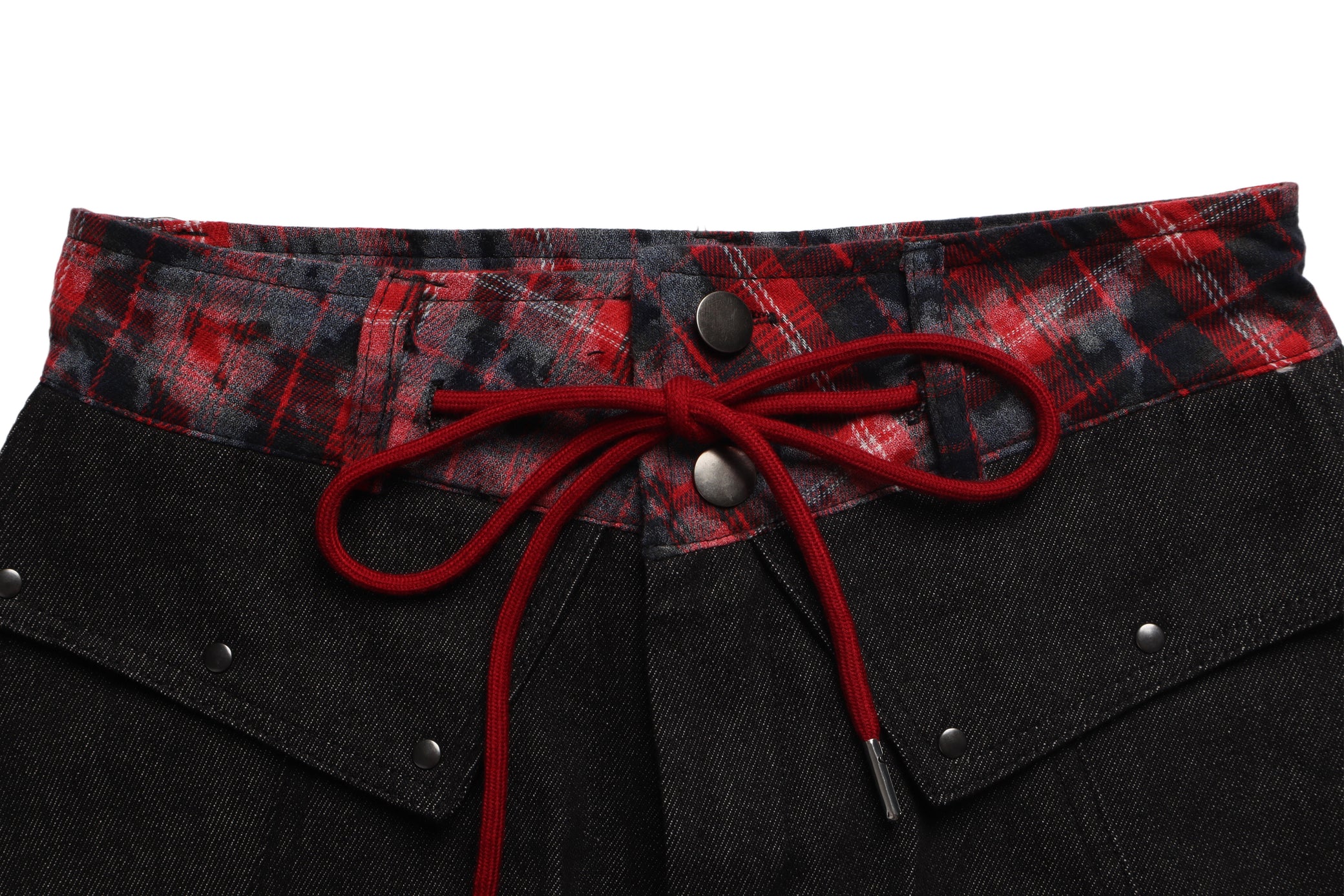 American Streetwear Plaid Patchwork Curved-Cut Jeans
