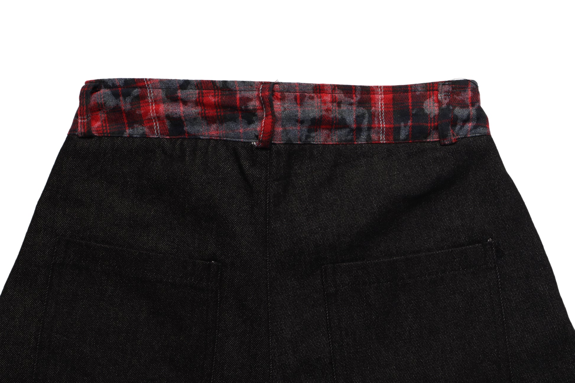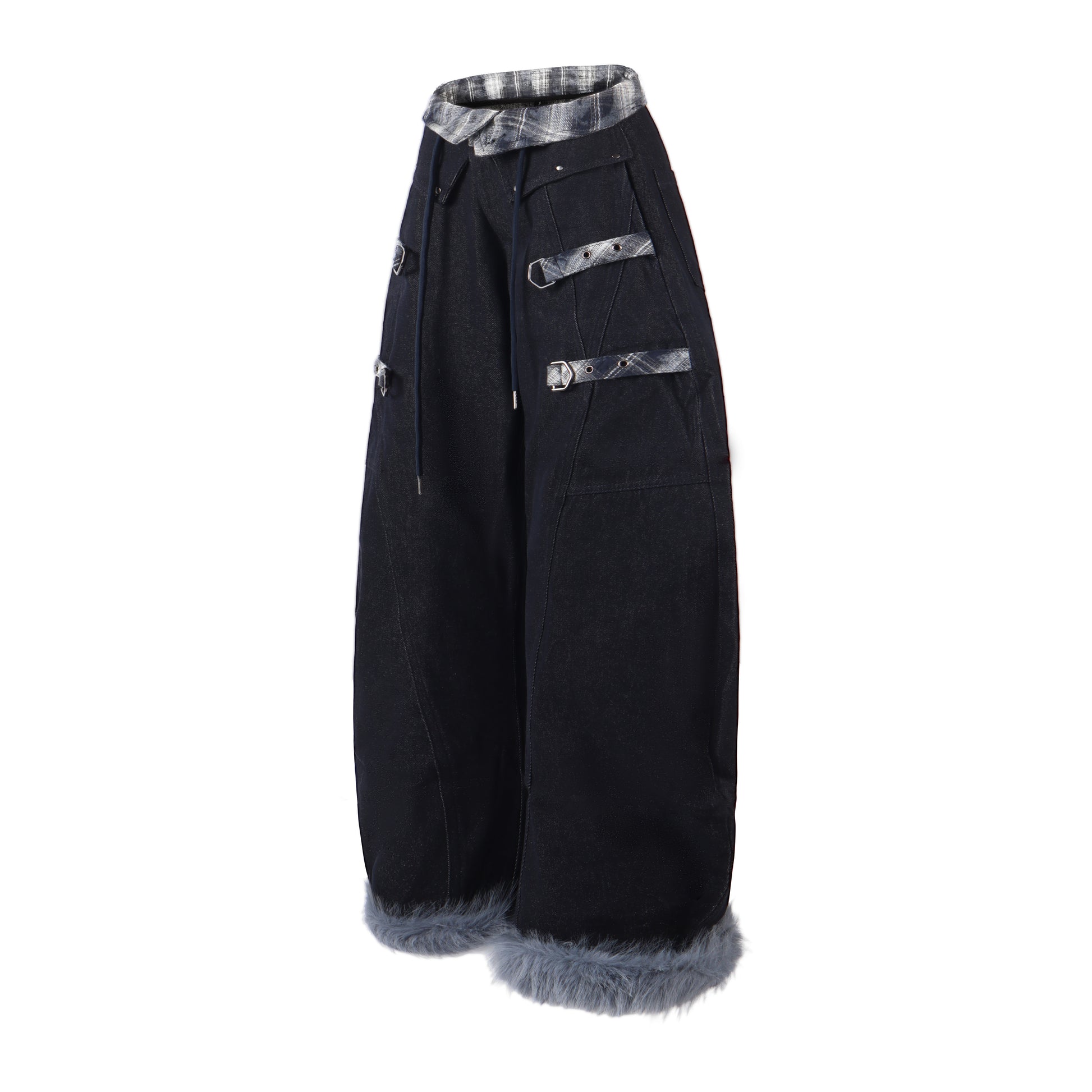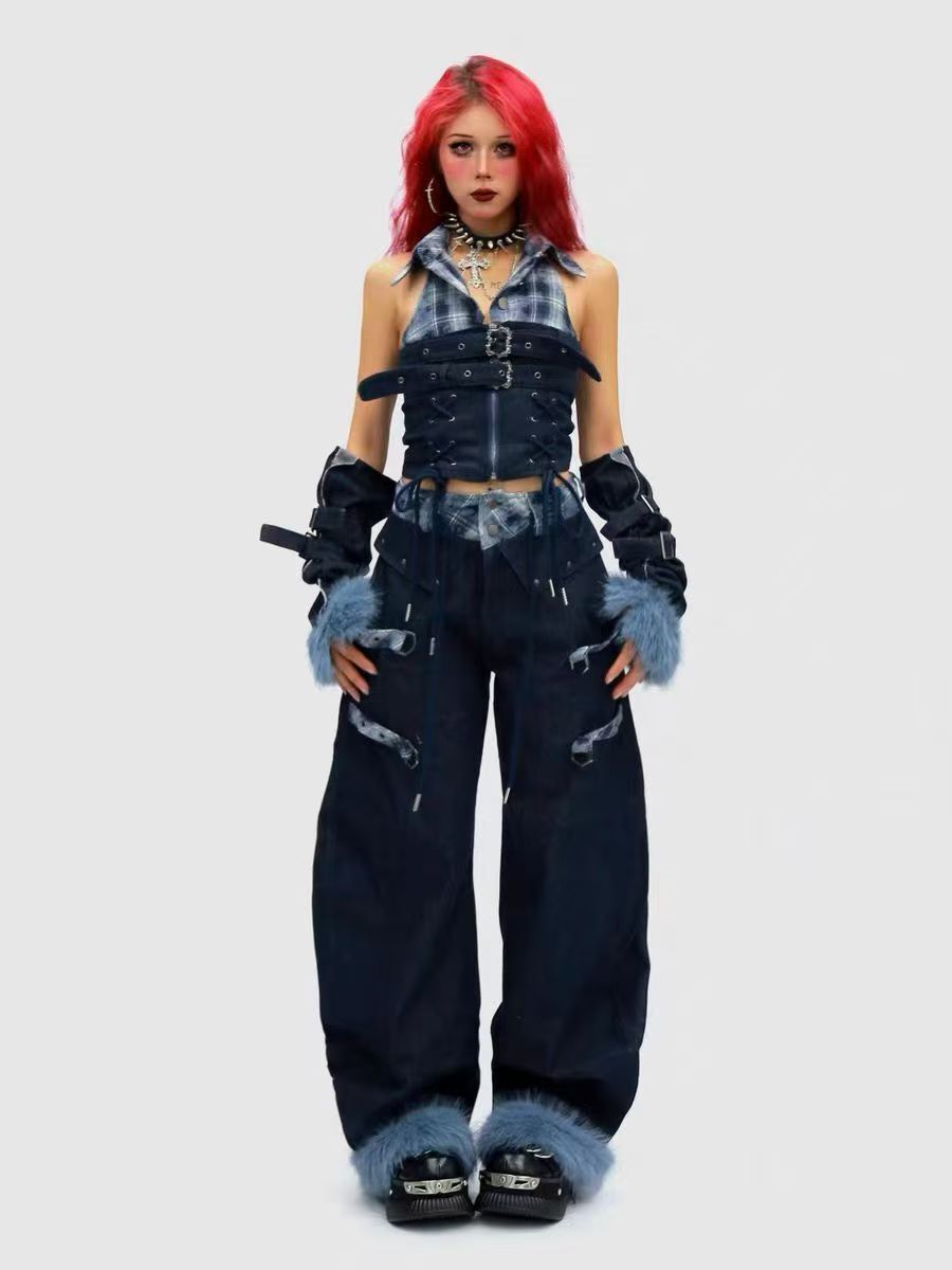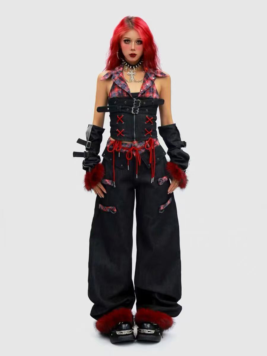 American Streetwear Plaid Patchwork Curved-Cut Jeans