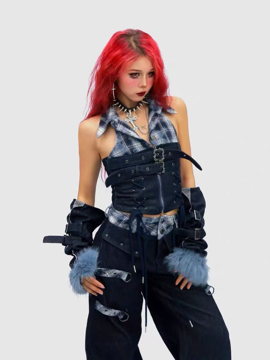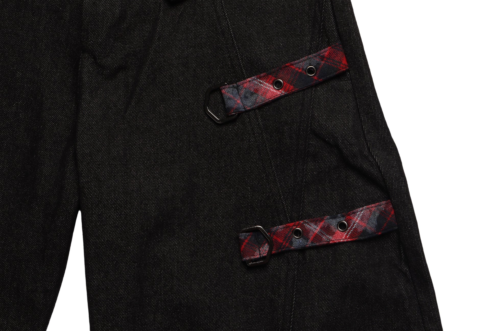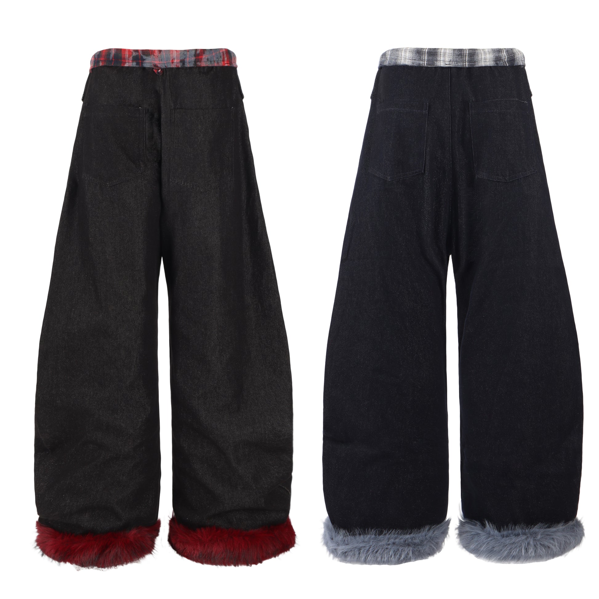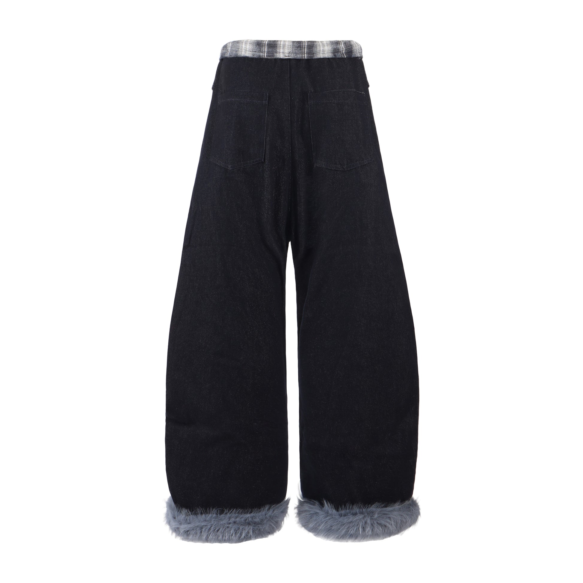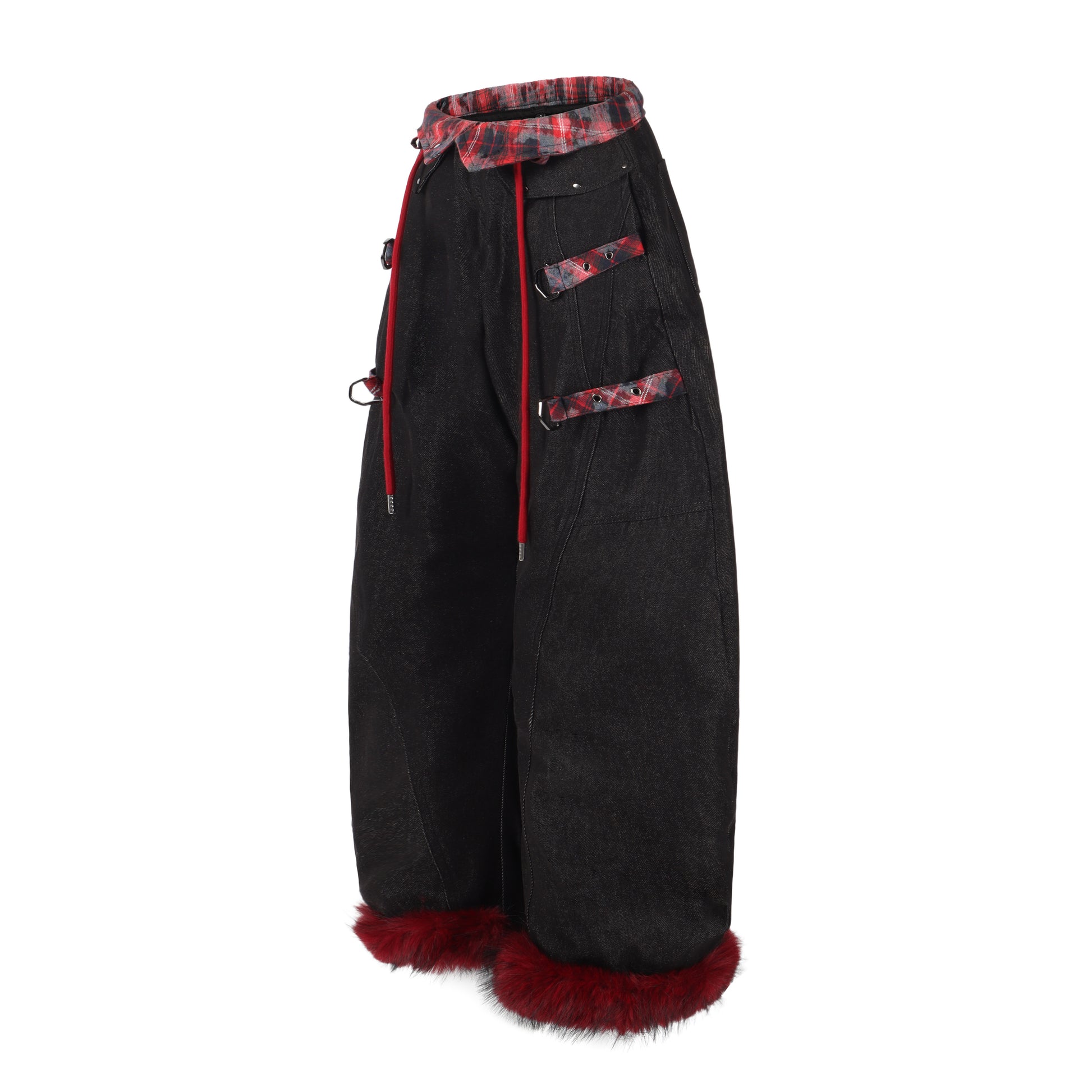 American Streetwear Plaid Patchwork Curved-Cut Jeans