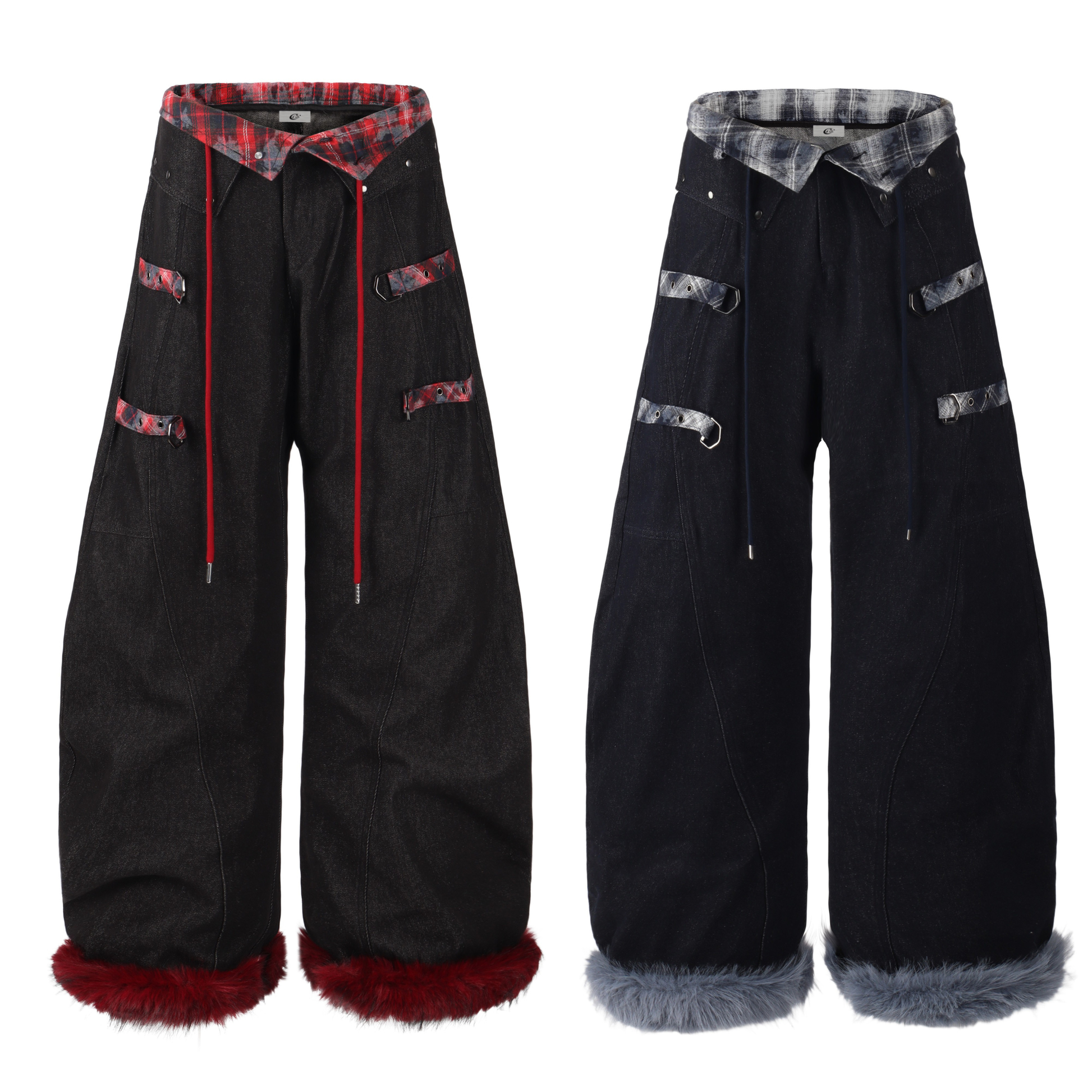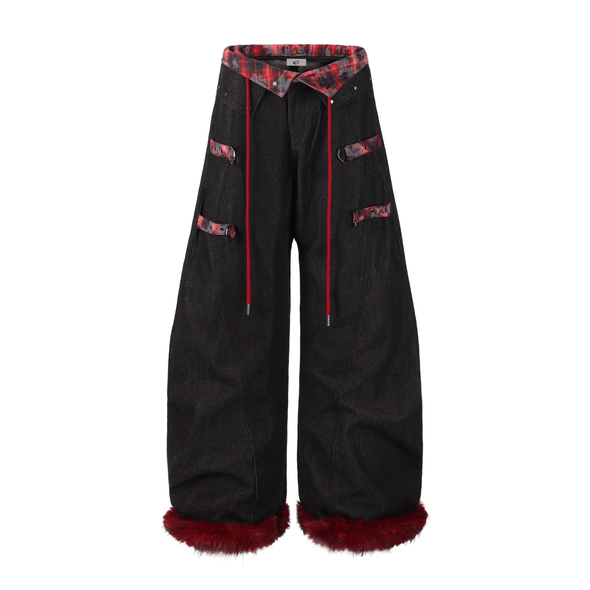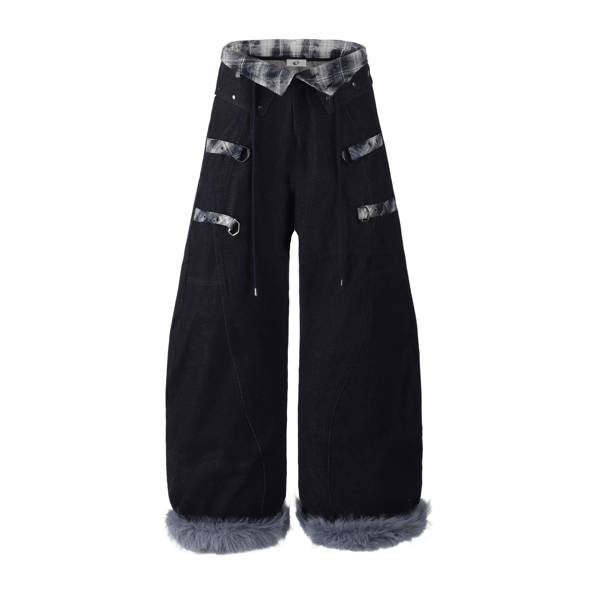 The Omirad Flannel-Lined Faux Fur Barrel Pants deliver an avant-garde twist on utilitarian denim. Constructed from a premium cotton-blend fabric (70% cotton, 20% polyester, 10% nylon), these pants feature a dramatic barrel silhouette with plaid contrast panels, D-ring strap details, and faux fur cuffs for a striking finish. The mix of rugged denim texture and soft flannel lining balances structure with comfort — embodying Omirad’s experimental streetwear aesthetic.