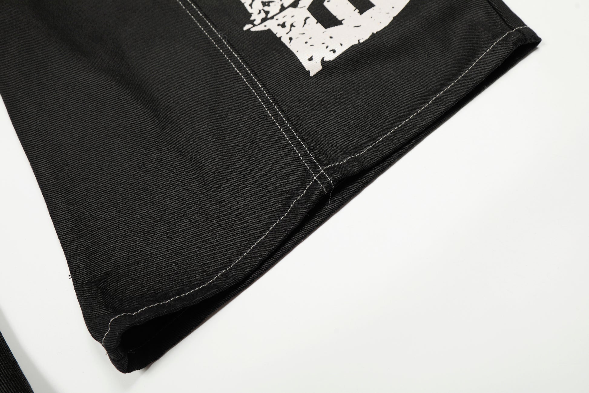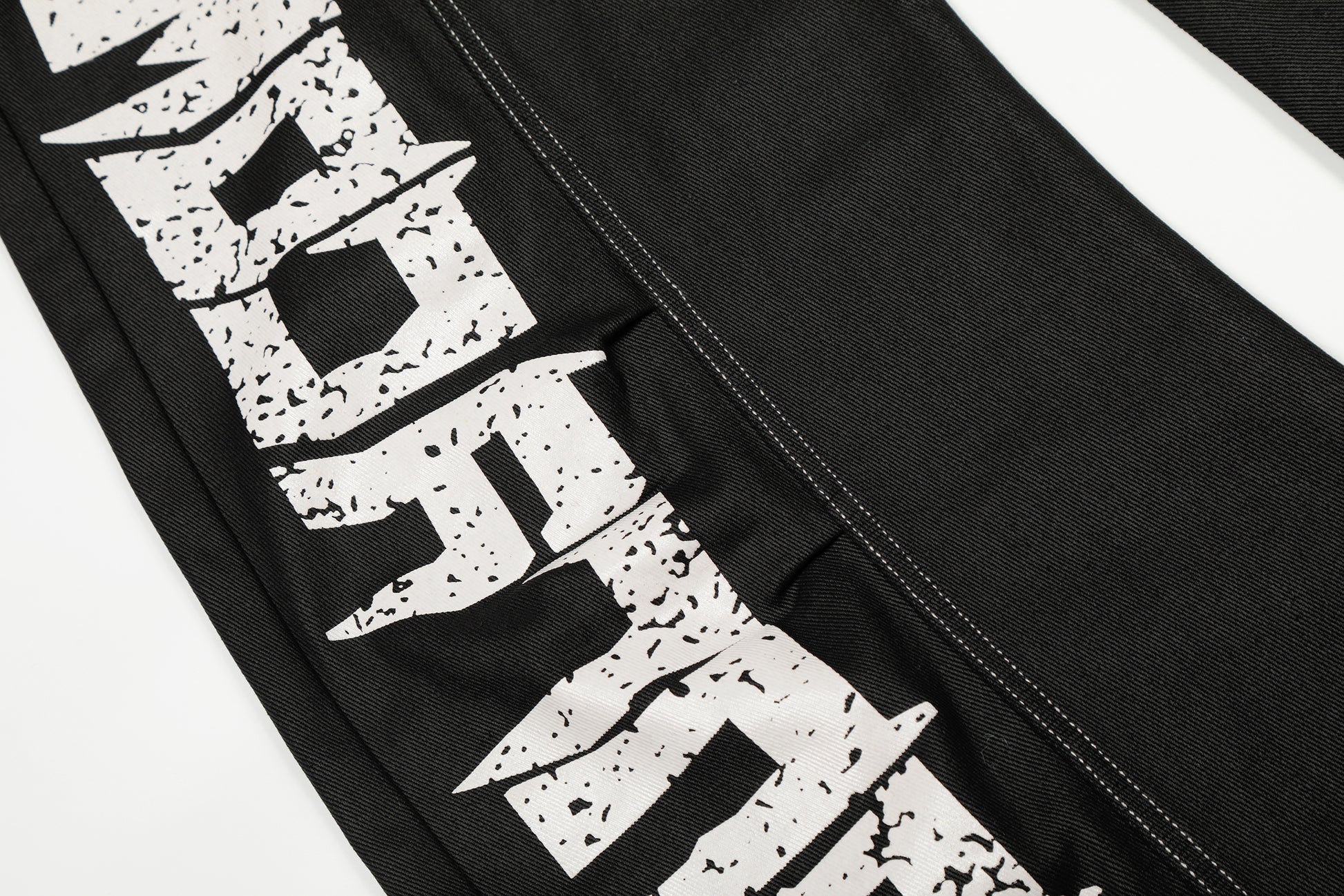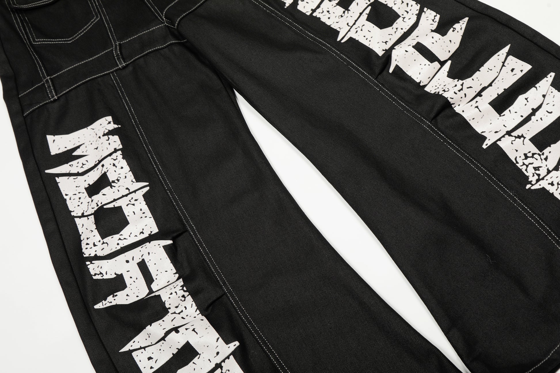 Clothing details: Wide-leg silhouette, contrast stitching, bold graffiti print, structured denim texture, signature Omirad patch.