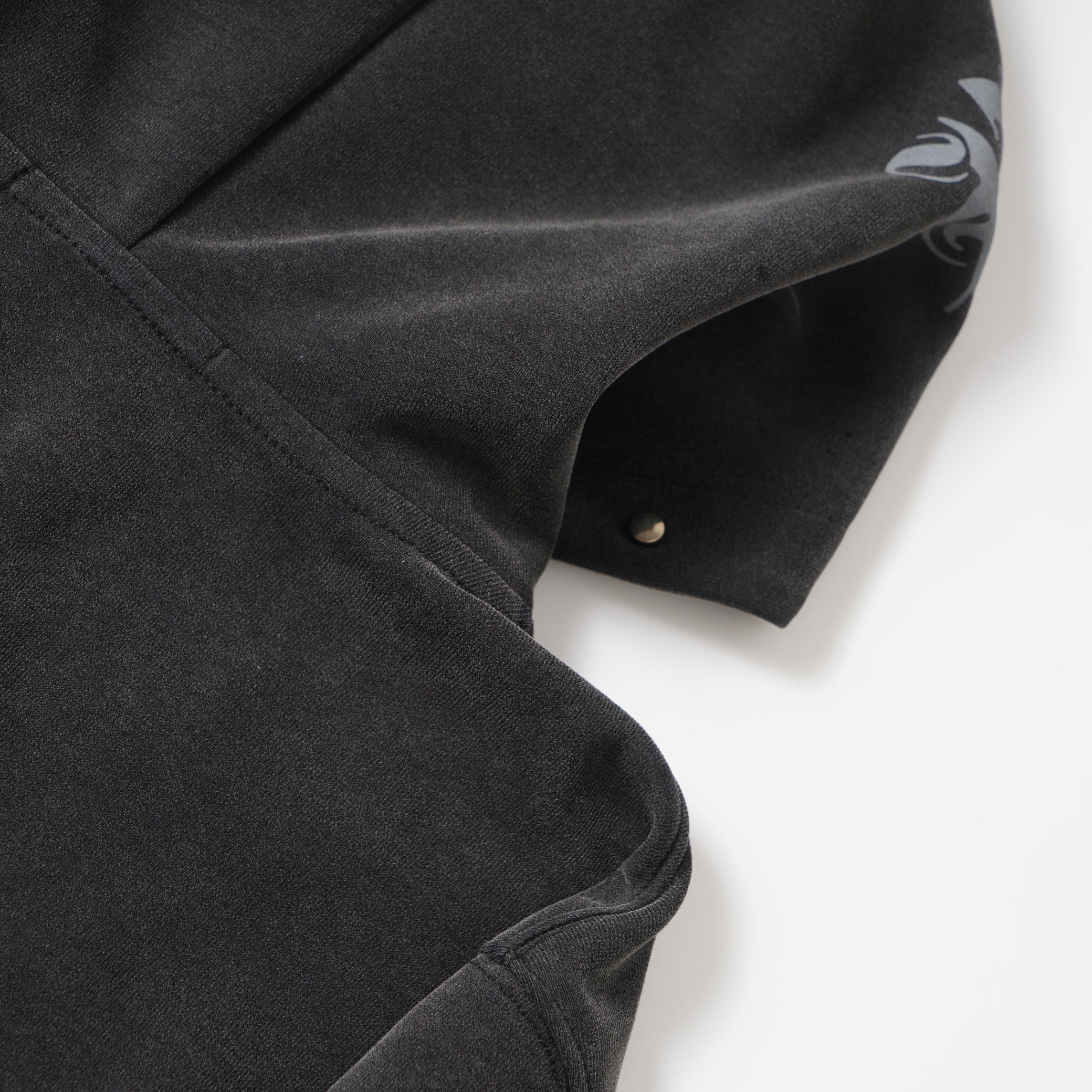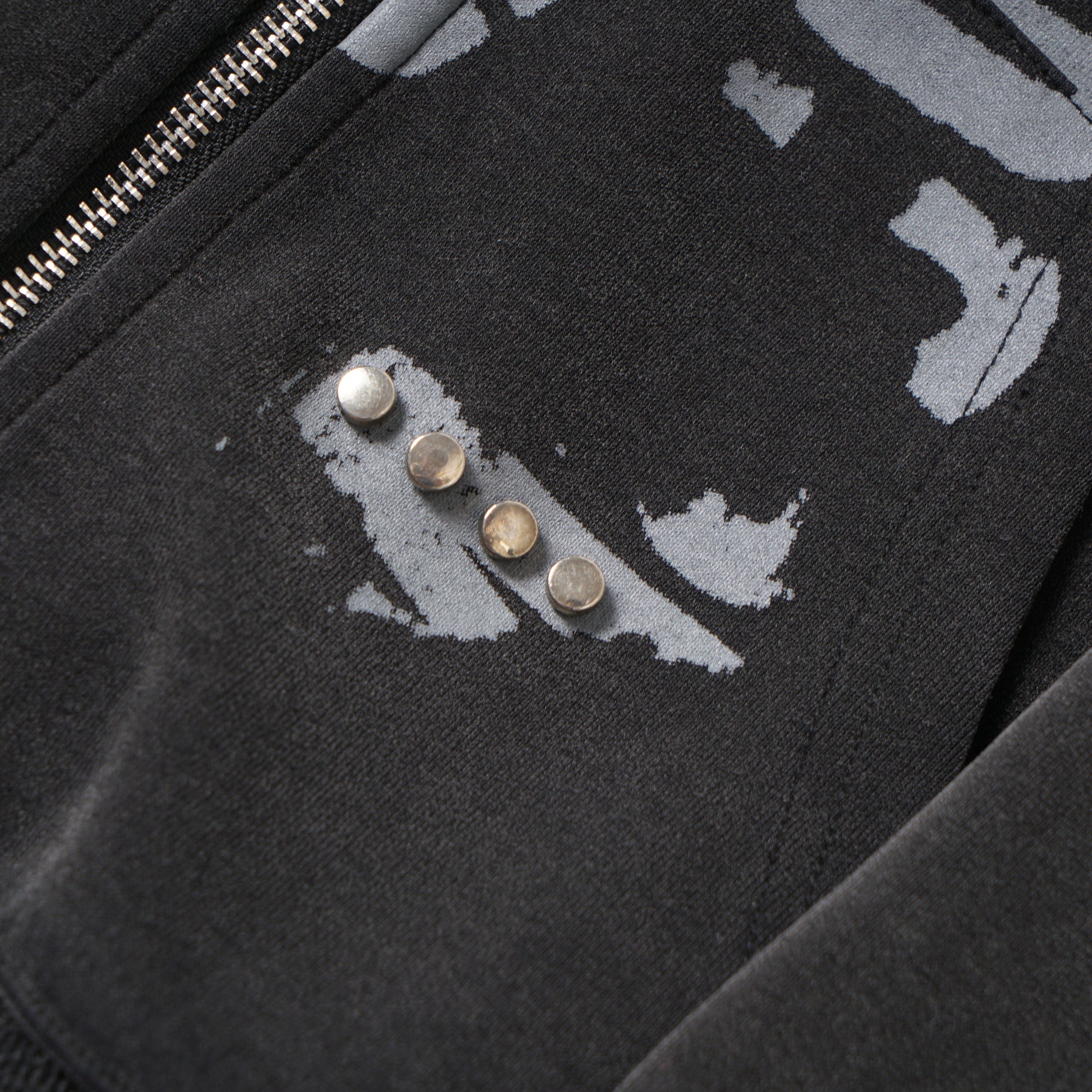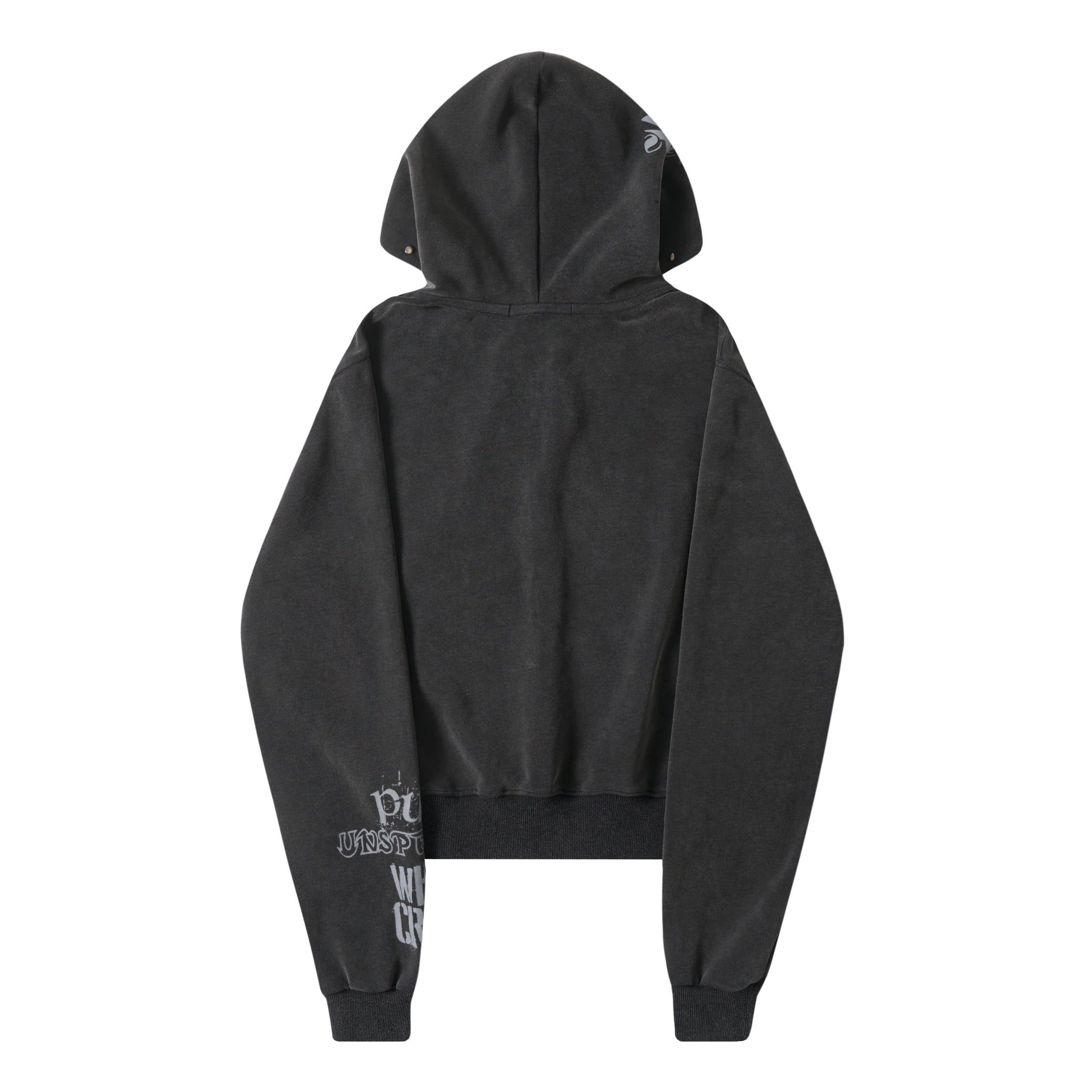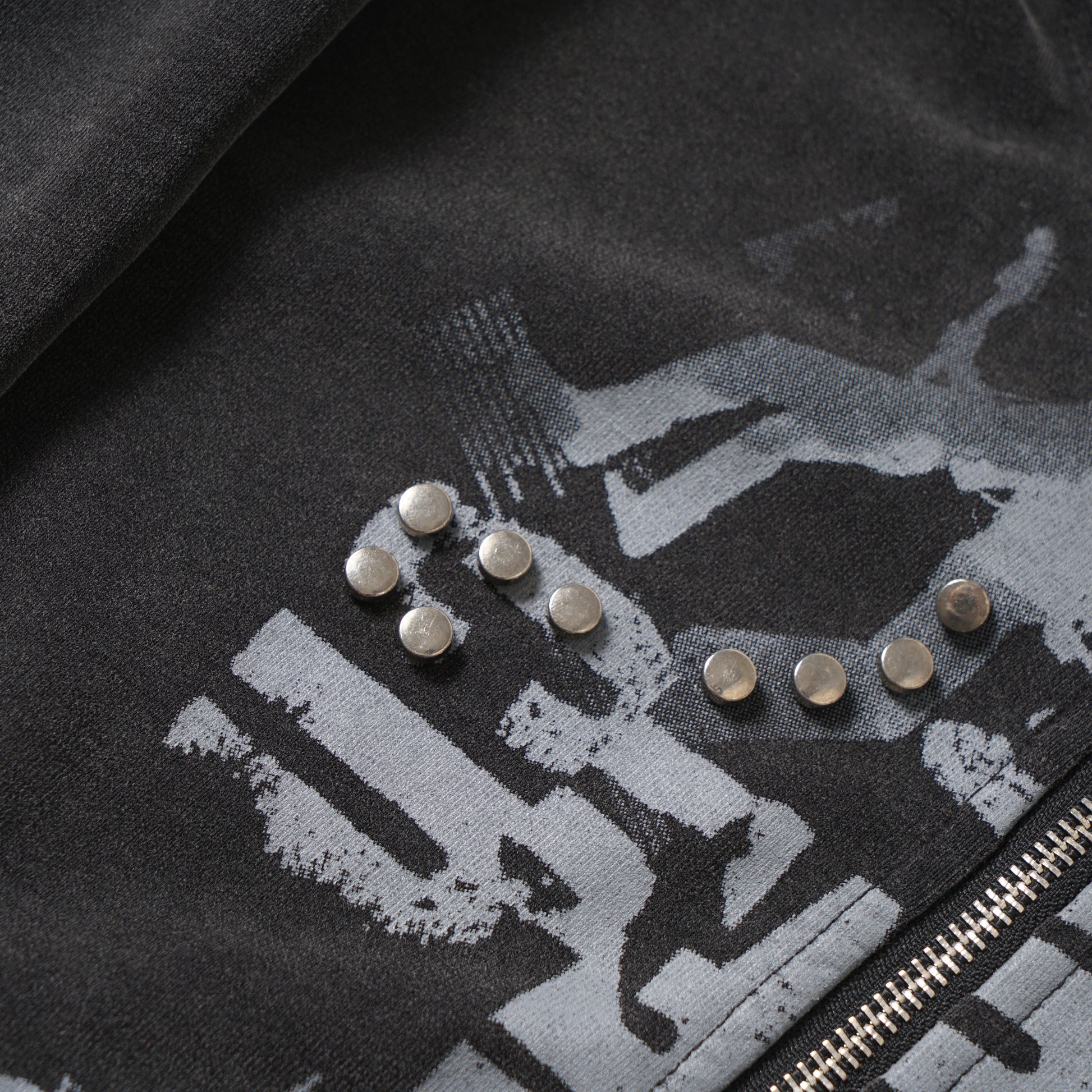 Clothing details: Washed finish, rivet hood trim, bold print graphics, zip front closure, ribbed hem and cuffs, cropped fit with Omirad signature punk influence.
