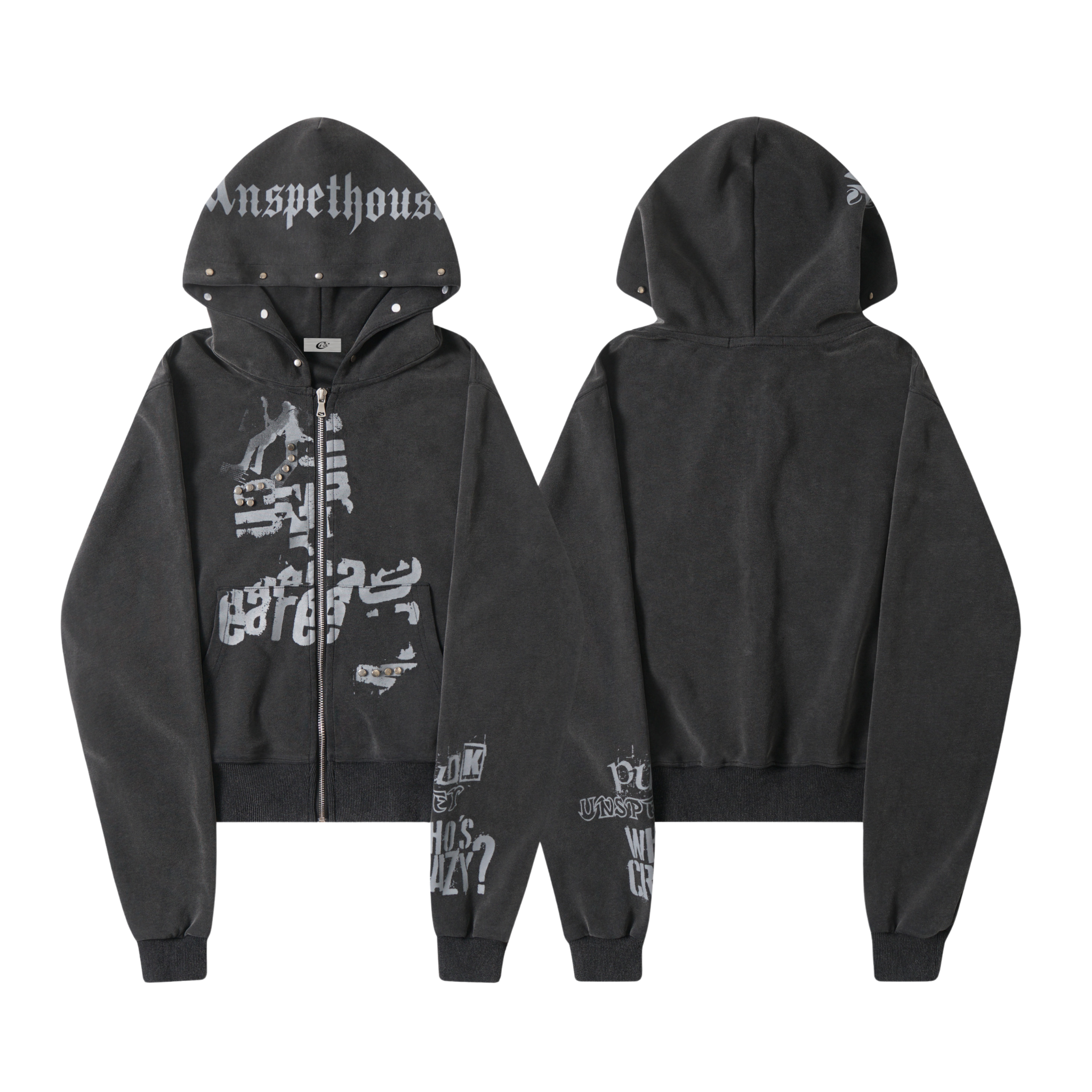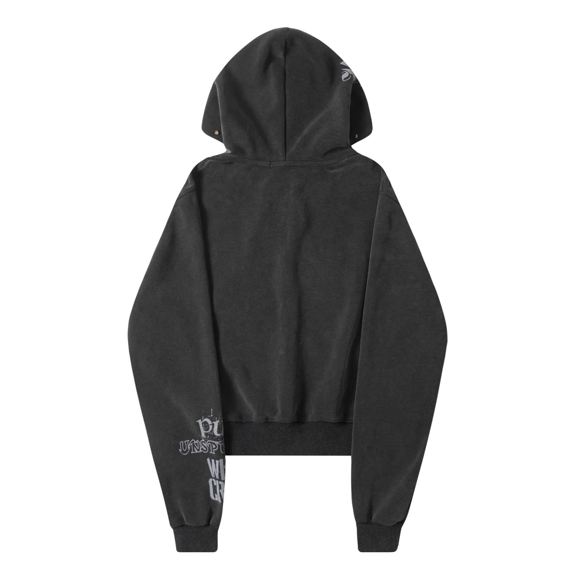 The Omirad Punk Washed Zip Hoodie channels raw rebellion and vintage street energy. Crafted from a soft cotton-blend fabric with a distressed washed finish, it features bold gothic typography and rivet detailing along the hood for an elevated grunge aesthetic. The cropped silhouette adds a modern edge, pairing perfectly with wide-leg denim or cargo pants for a full streetwear look.