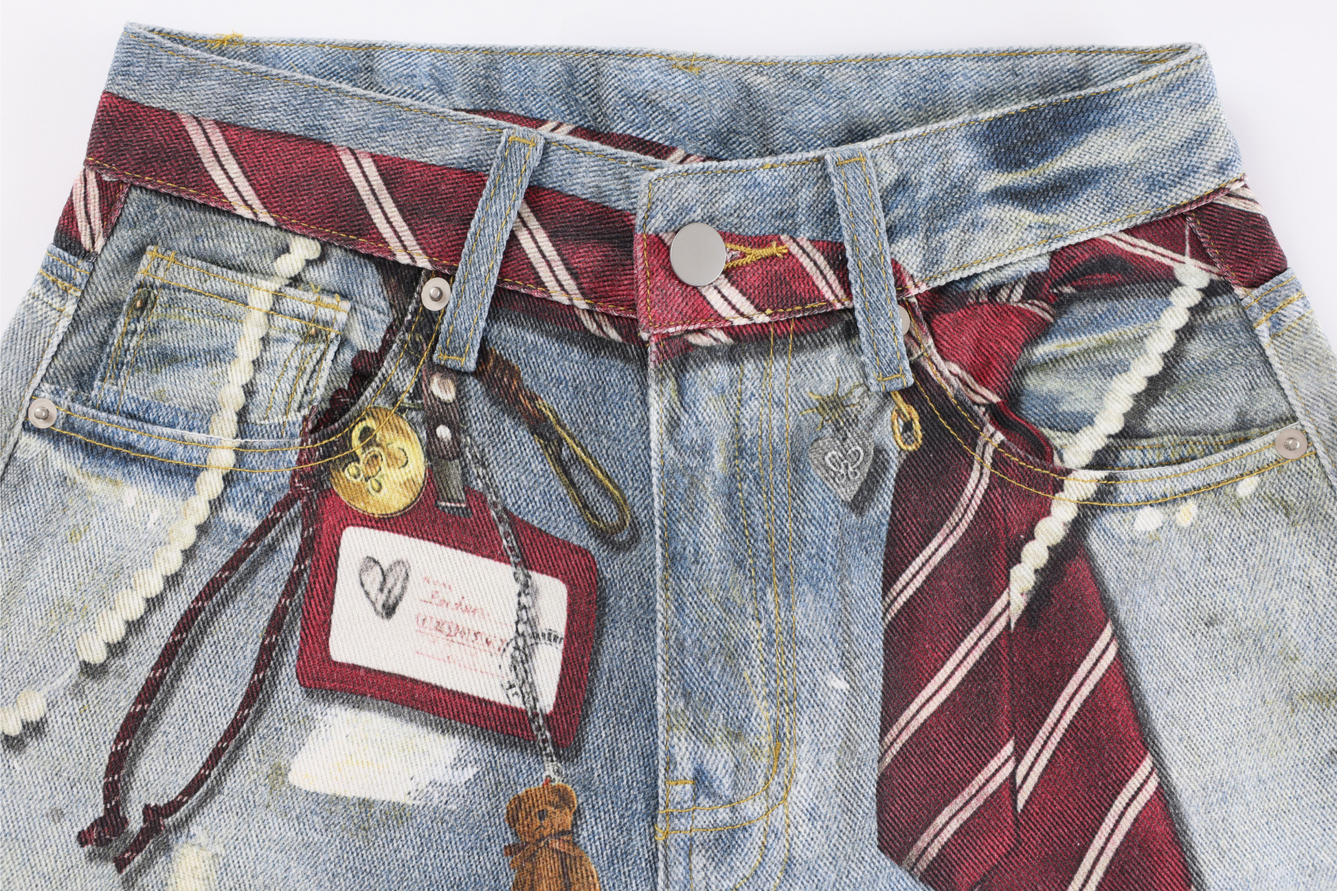 American Streetwear Tie 3D Digital Print Curved-Cut Jeans