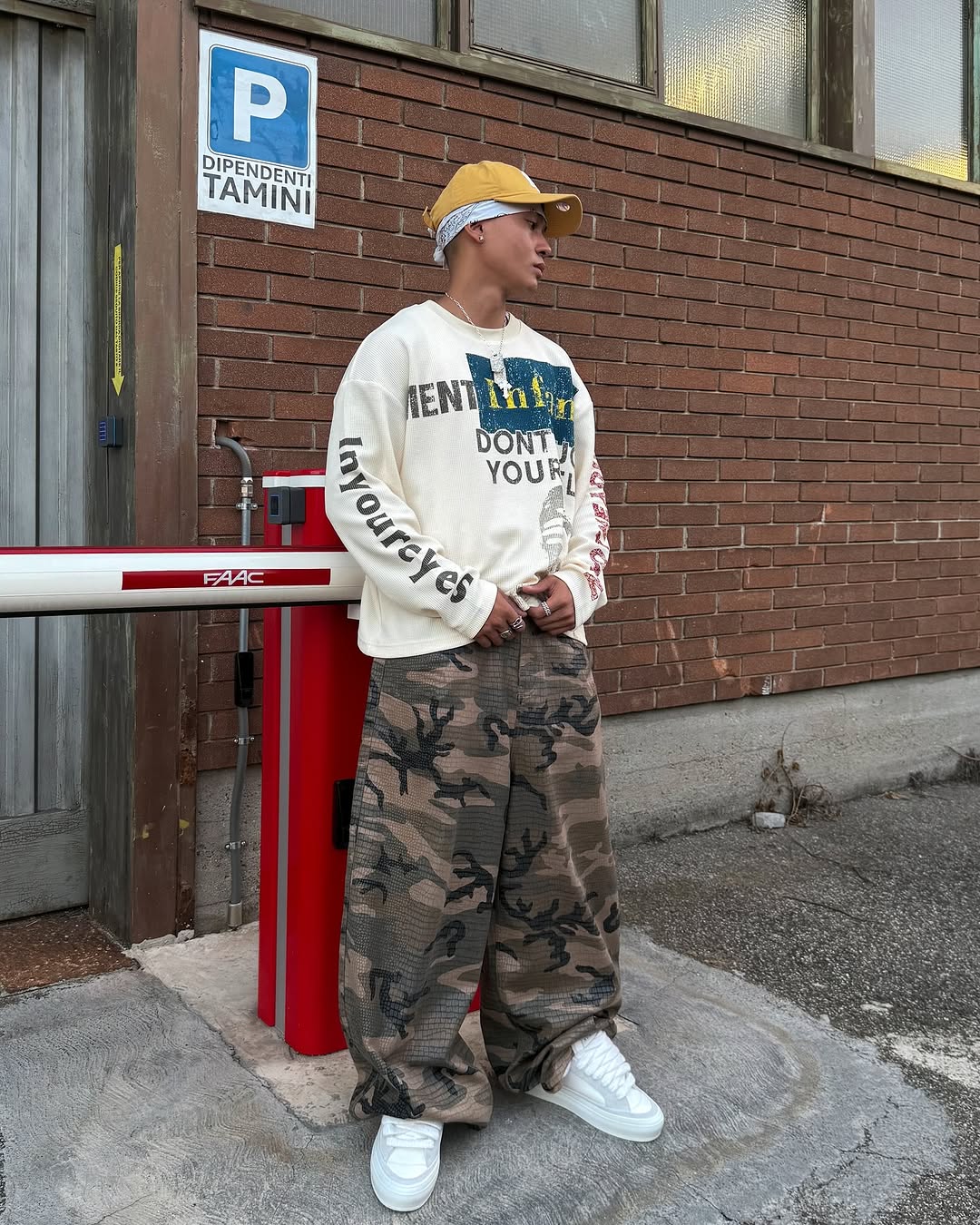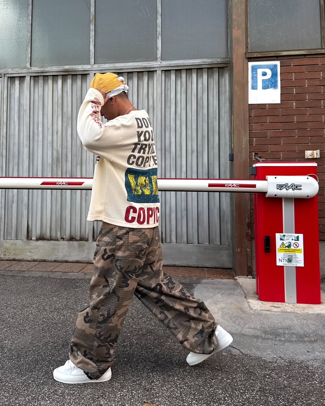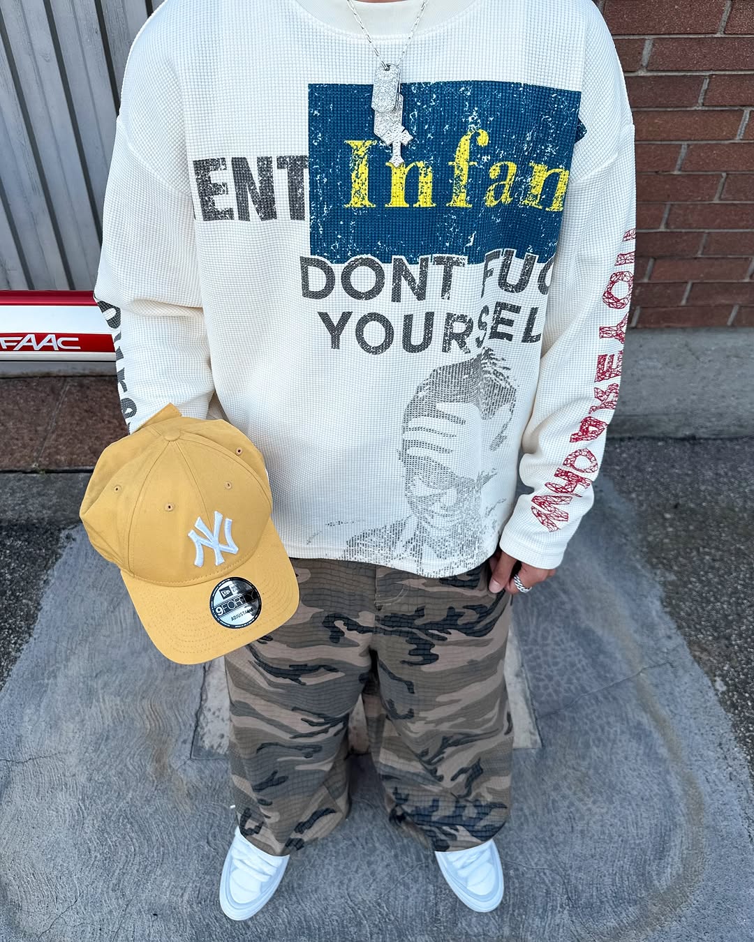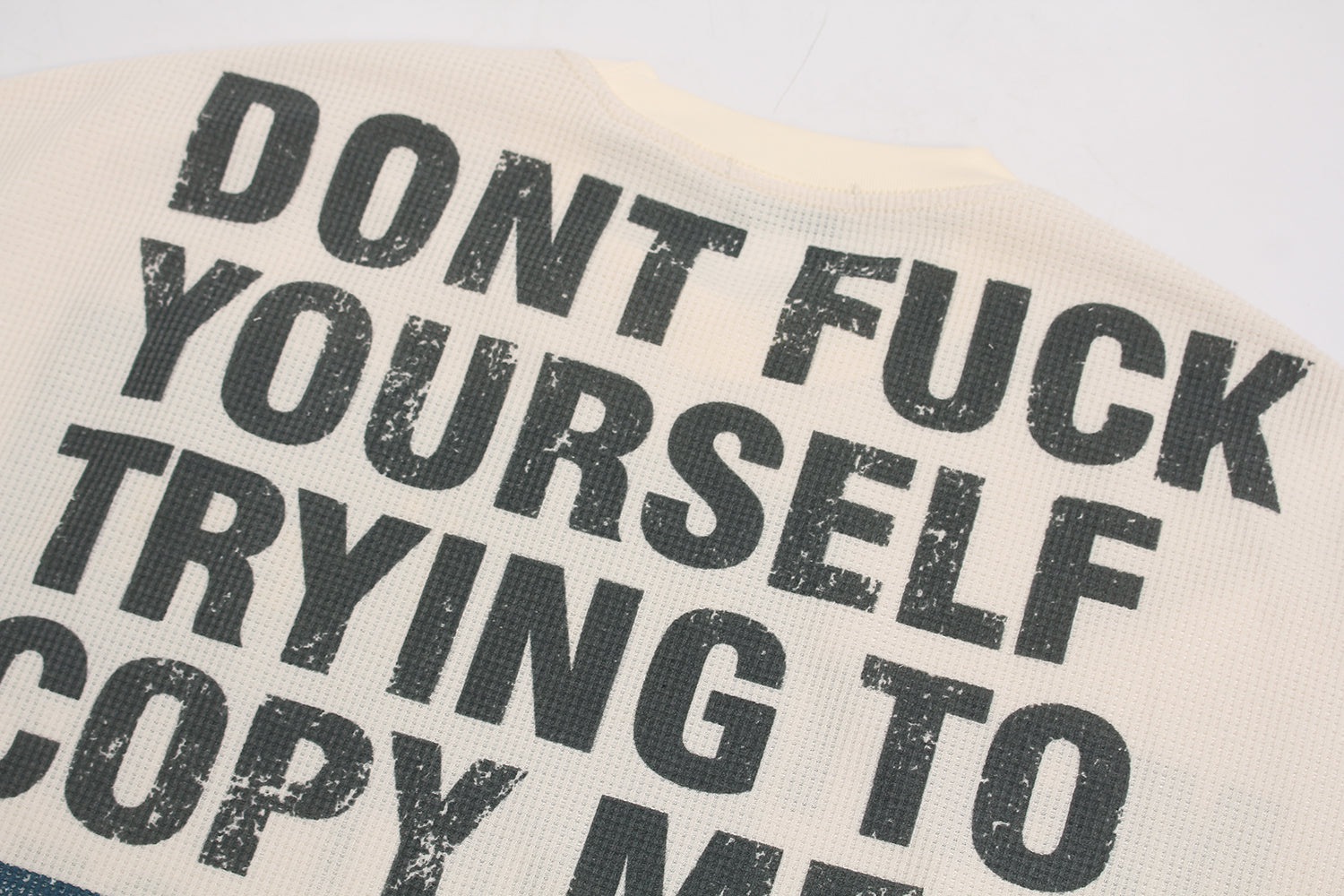 The Omirad “COPYCAT WAR” Long Sleeve channels unapologetic street rebellion through bold typography and a vintage-wash finish. Made with 300g heavy waffle-textured fabric, this top delivers both structure and comfort — perfect for layering or wearing solo. The distressed print across the back and sleeves expresses anti-imitation defiance, making it a standout statement piece in any fit.