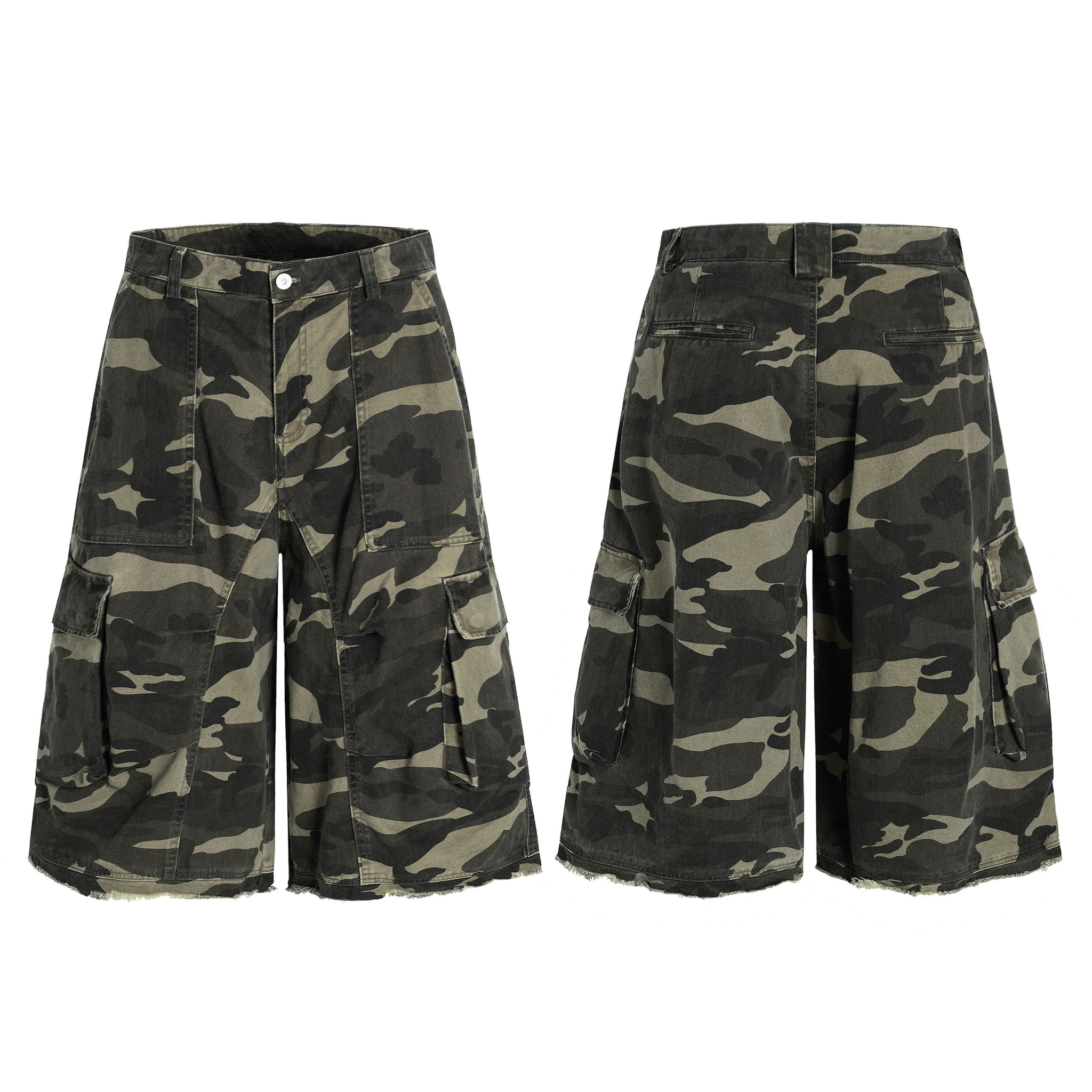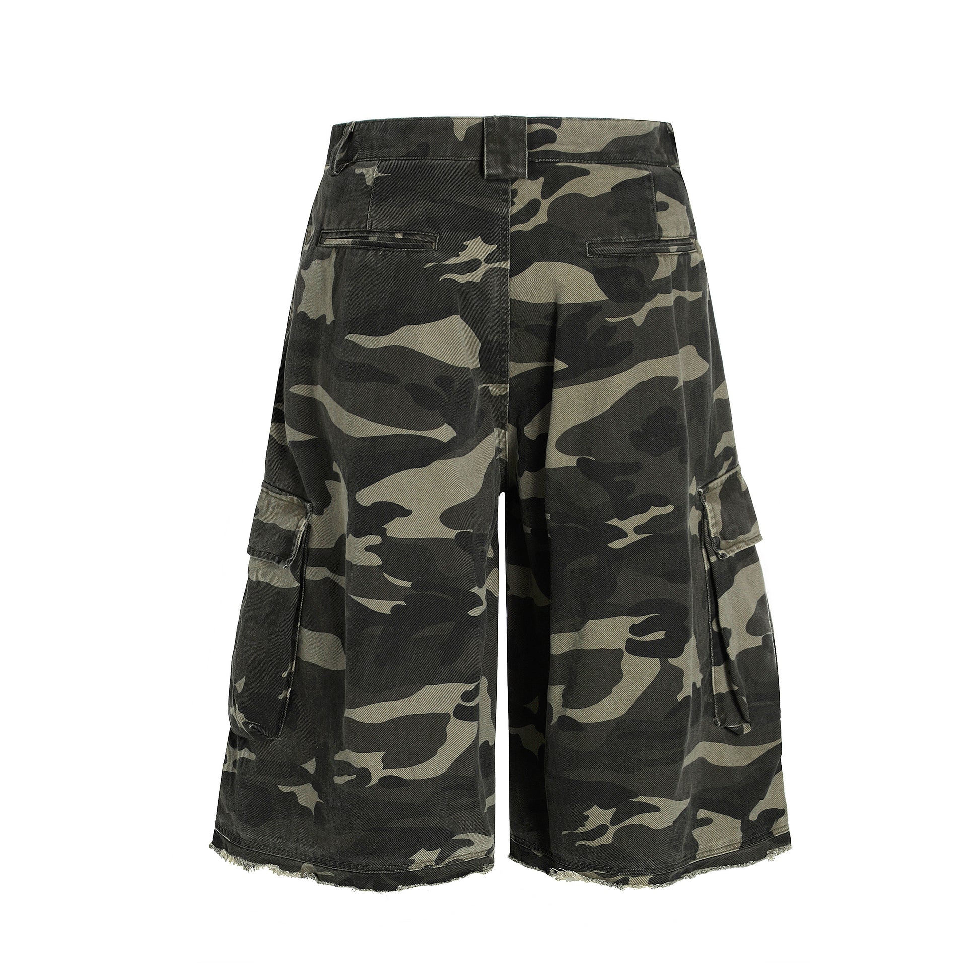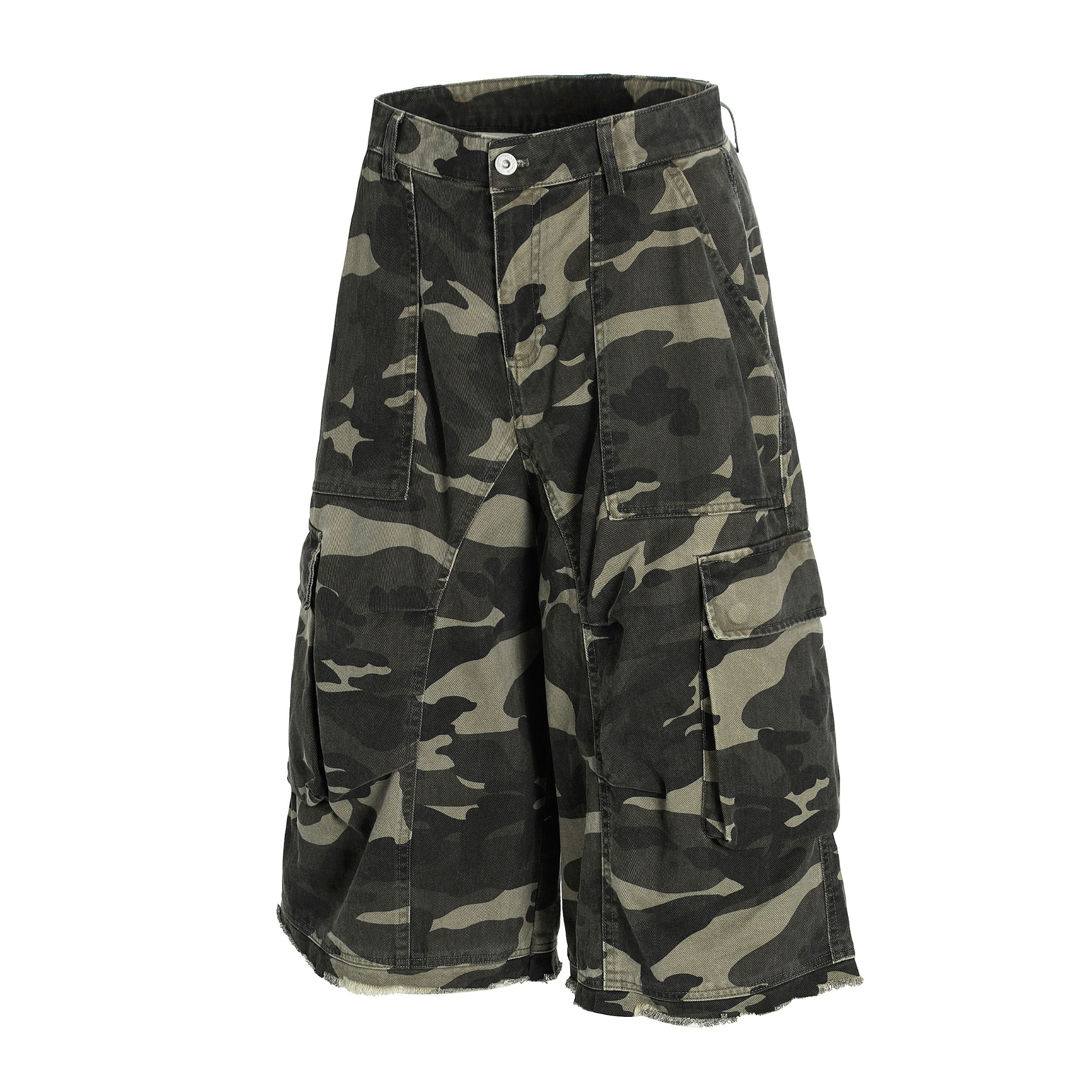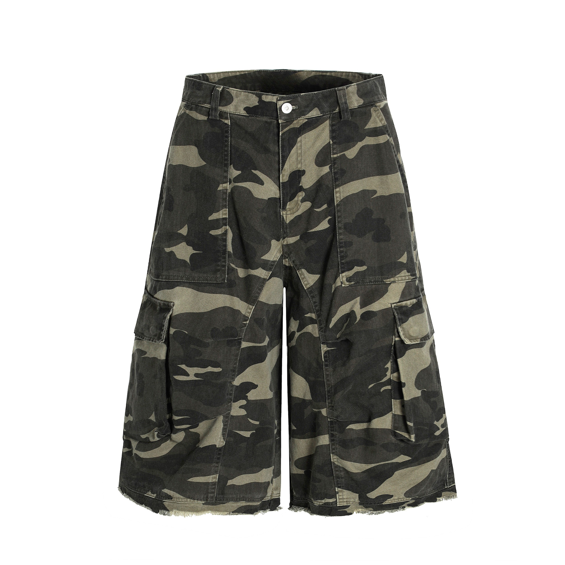Clothing details: Wide-leg silhouette, full camo print, oversized 3D cargo pockets, raw-edge hem, reinforced seam panels, button + zip closure, utility-inspired construction.
