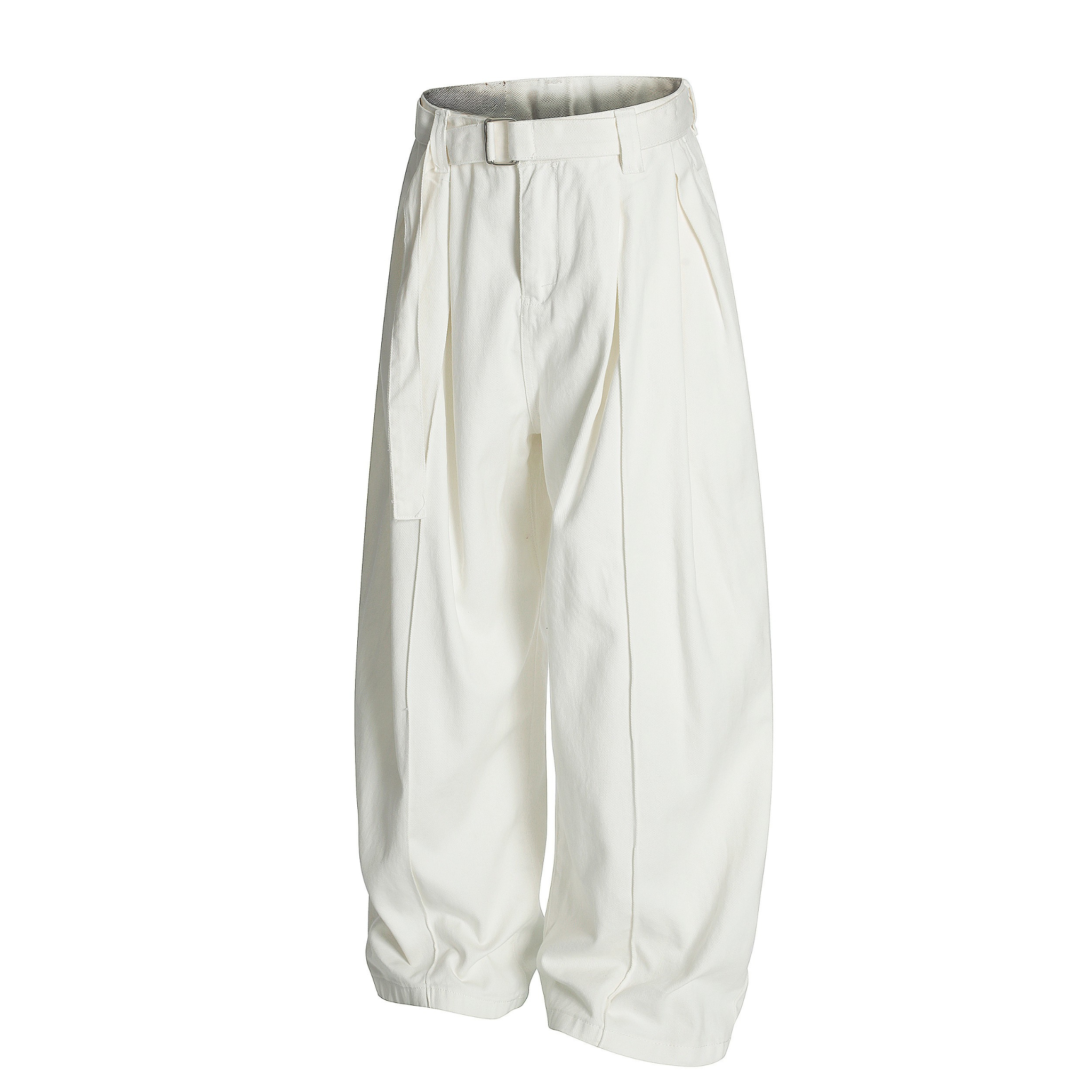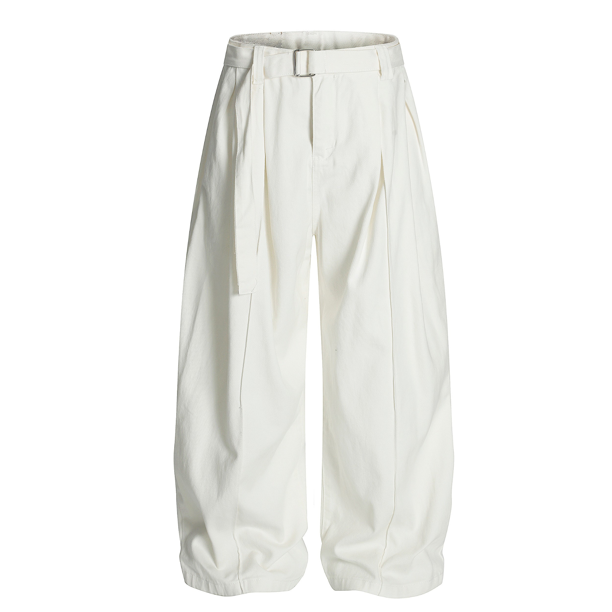 Clothing details: Integrated self-belt; structured pleats; wide balloon-leg fit; clean minimal rear welt pocket; soft natural stacking at the cuffs.
