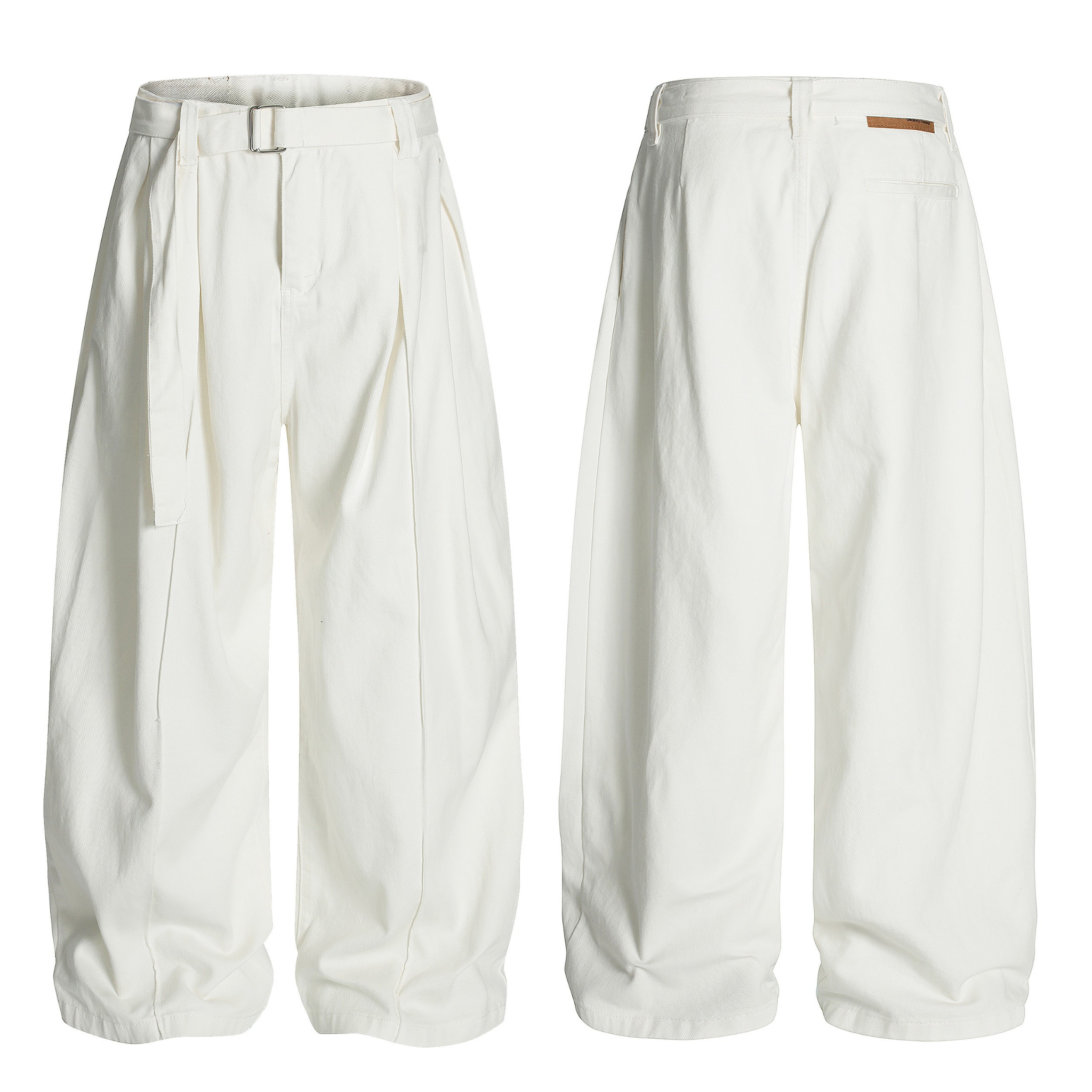 The Omirad Pleated Belted Cotton Trousers bring a clean, sculptural silhouette to everyday streetwear. Cut entirely from premium 100% cotton, the pants feature deep front pleats that form a soft balloon shape, finished with an adjustable self-belt for a sharp, tailored edge. The wide-leg volume stacks naturally at the hem, giving the fit a relaxed yet elevated presence.