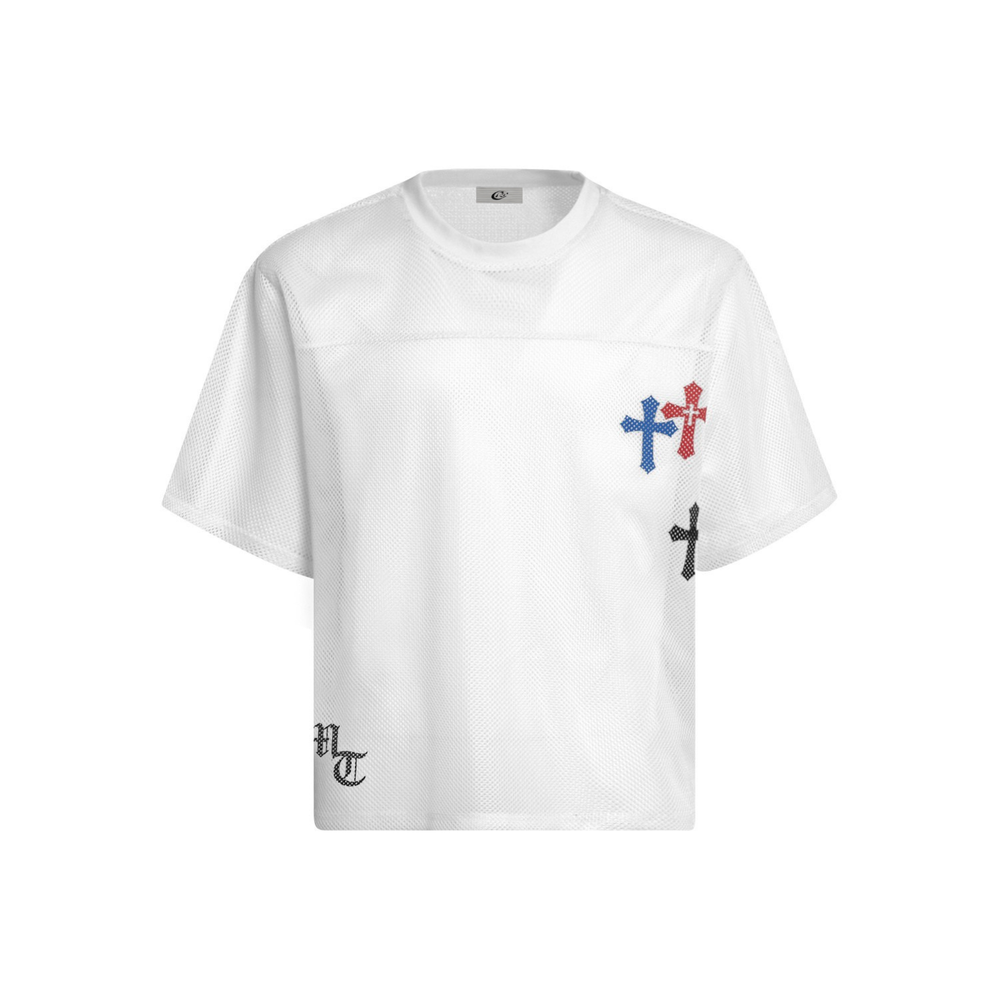 The Omirad Multi-Cross Mesh Jersey Tee brings a clean athletic base together with bold graphic accents. Made from breathable 100% polyester mesh, it features multi-color cross motifs on the chest and a full row of crosses across the back for a strong visual punch. The boxy fit and minimal front design keep the silhouette modern and easy to style.