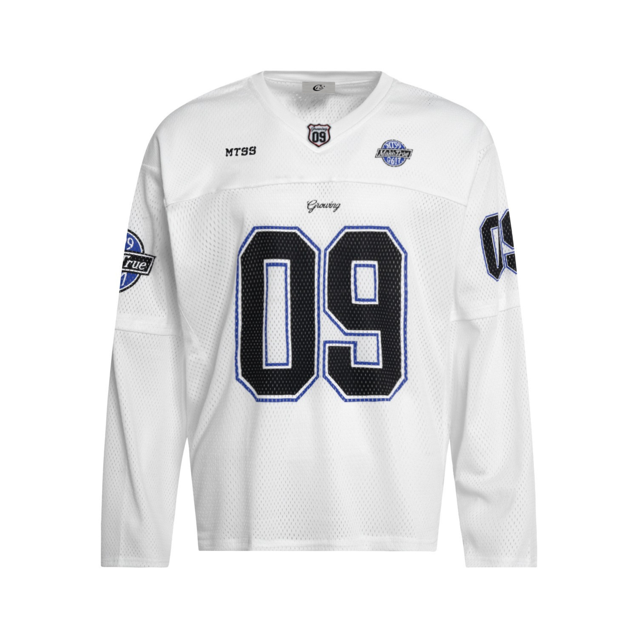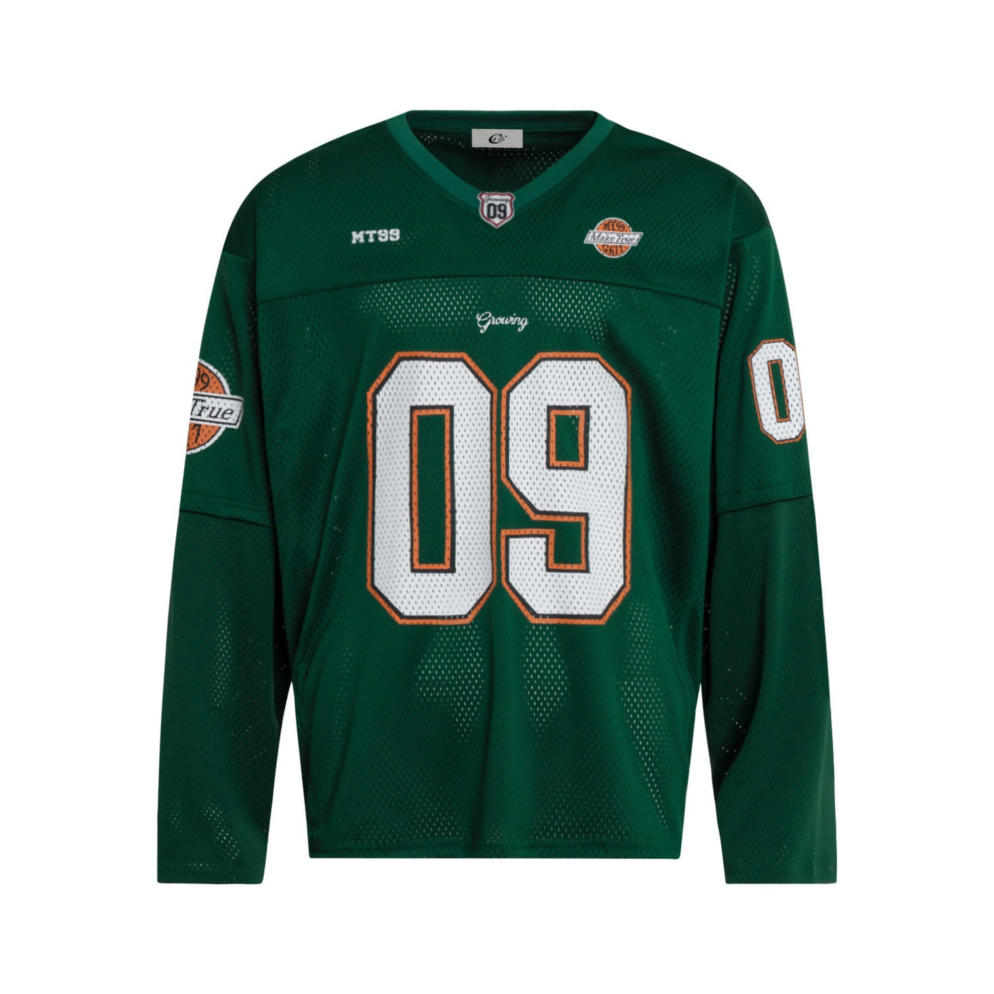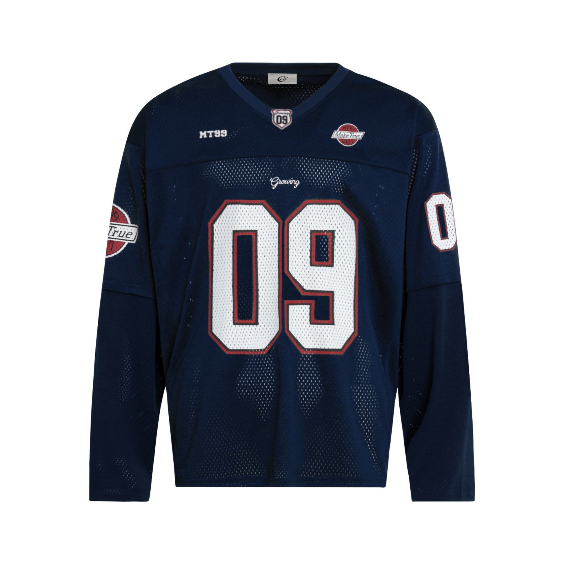 Details: Mesh fabric, oversized “09” graphics, sleeve numbers, patch-style logos, V-neckline, relaxed long-sleeve fit