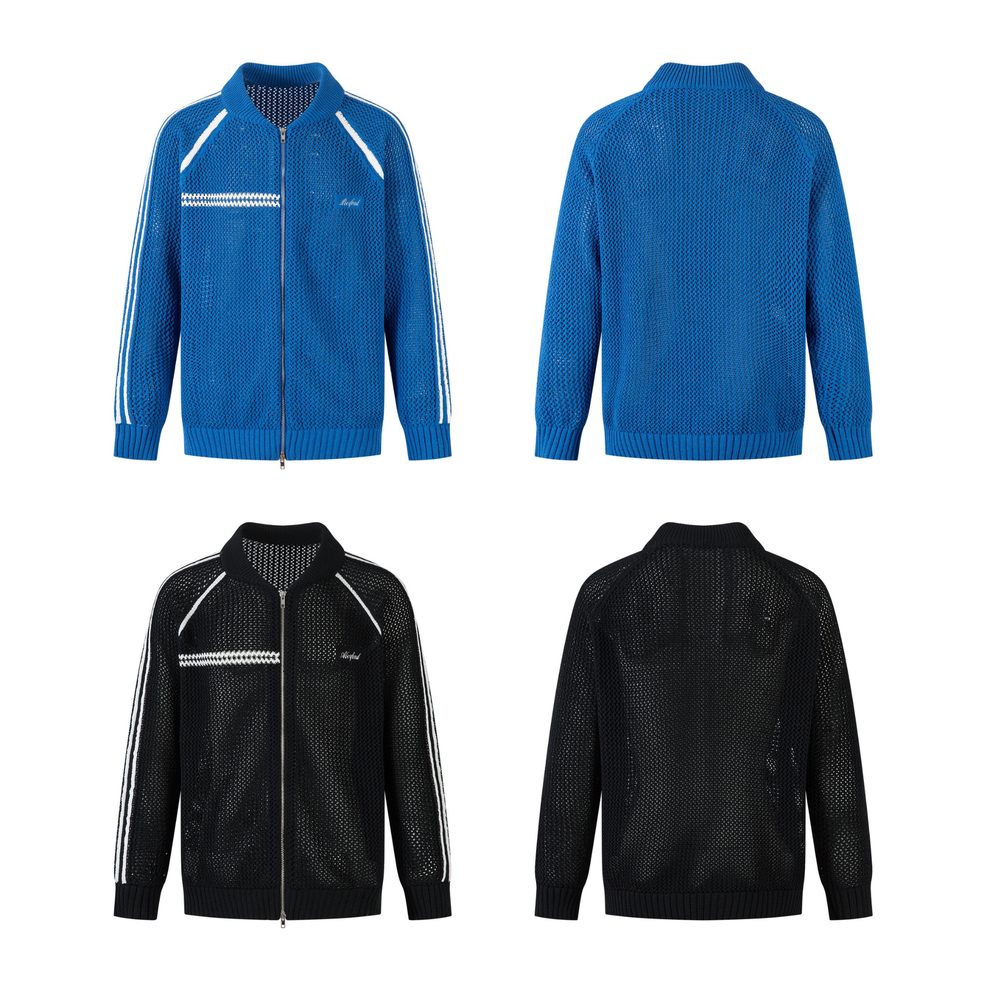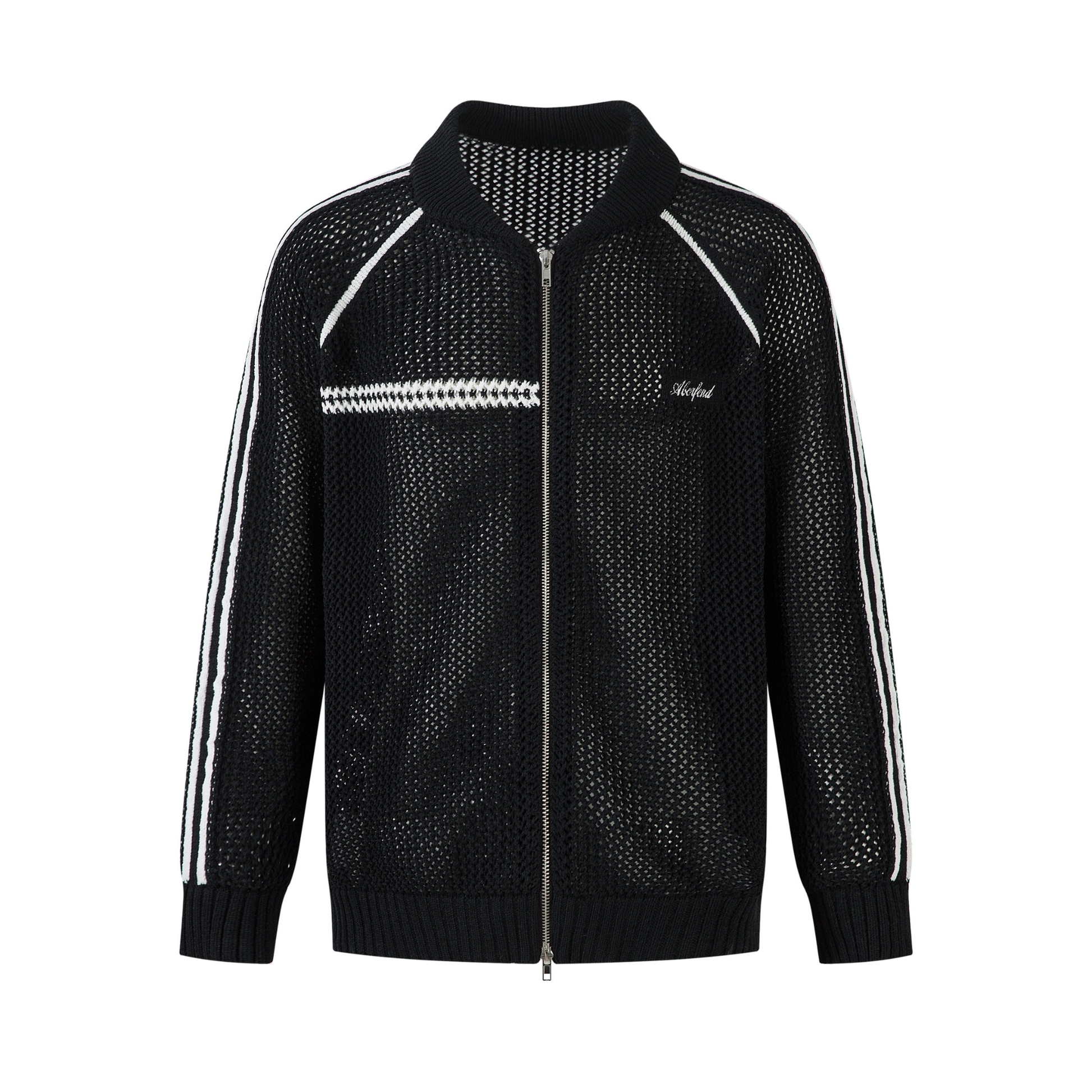 Combining classic track aesthetics with a breathable knit texture, the Omirad Mesh Knit Track Jacket brings a sporty yet vintage feel. Featuring a see-through mesh structure, contrast stripe details along the sleeves, and a relaxed bomber silhouette — perfect for layering over tees or tanks.
