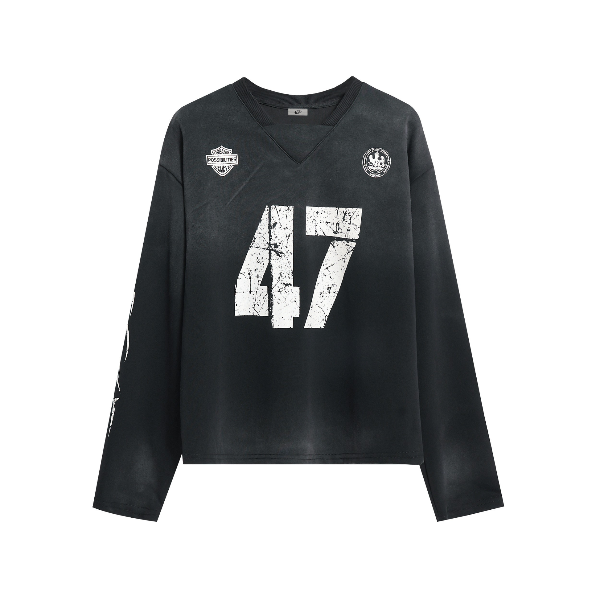 Designed with a washed black gradient, cracked “47” front print, and varsity-inspired patches, this piece channels authentic retro jersey vibes. Sleeve graphics and a bold back print add dimension, while the relaxed fit and V-neckline enhance its laid-back athletic look.