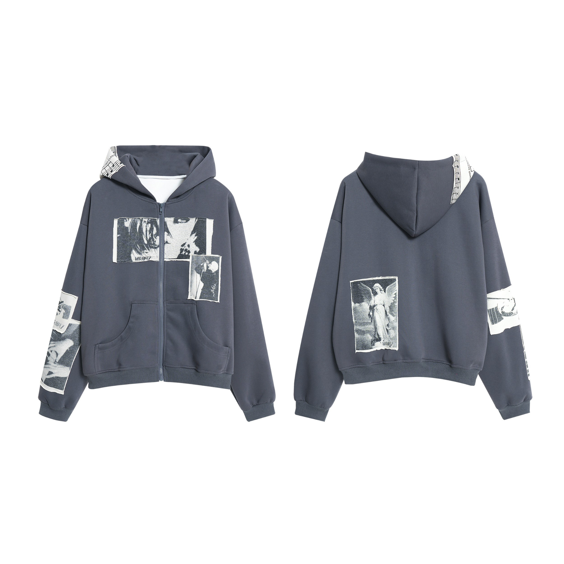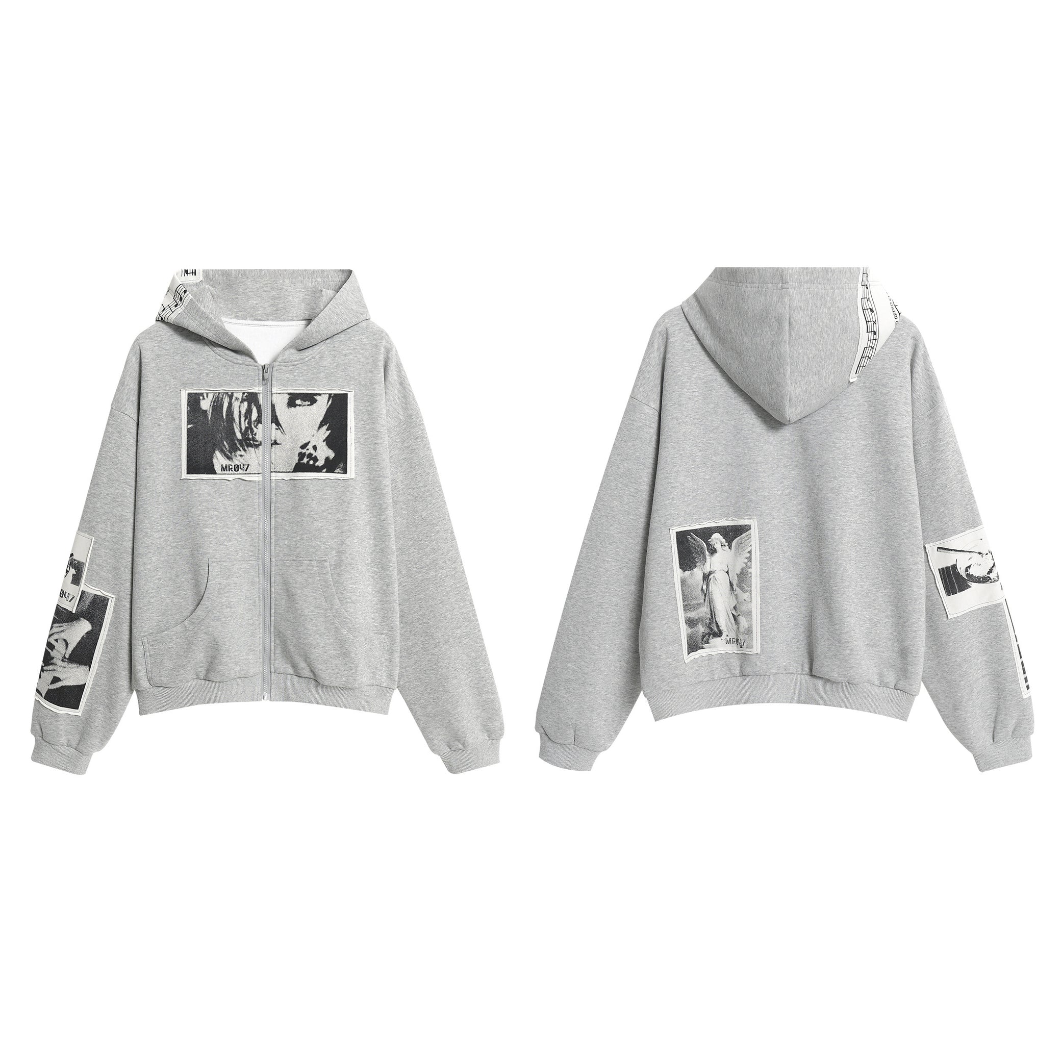 Featuring multiple photo-style patches across the chest, sleeves, and hood, the hoodie delivers a unique layered visual effect reminiscent of retro film prints. A relaxed silhouette, kangaroo pockets, and full-zip closure complete the look, making it an easy statement piece for any streetwear rotation.