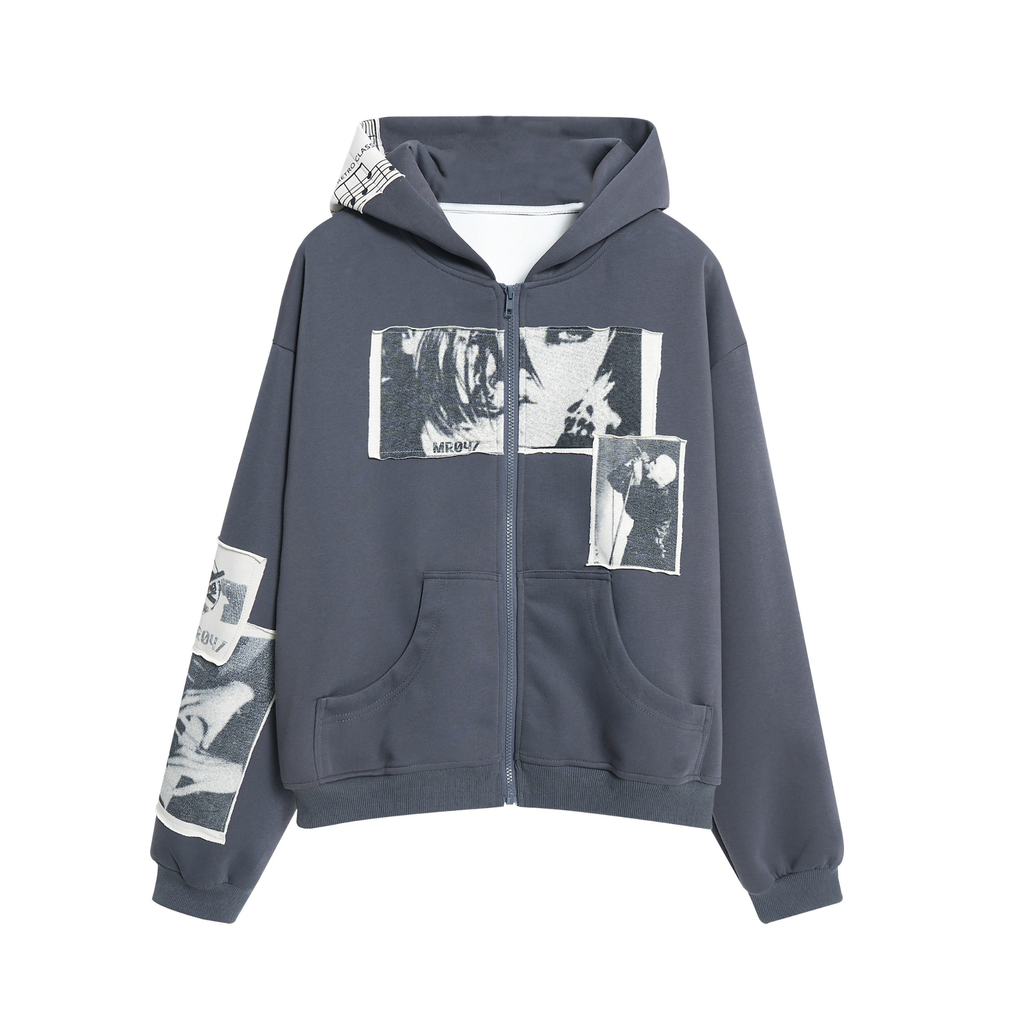 Clothing Details: Multi-panel photo patches, full-zip closure, kangaroo pockets, ribbed cuffs and hem, relaxed street fit
