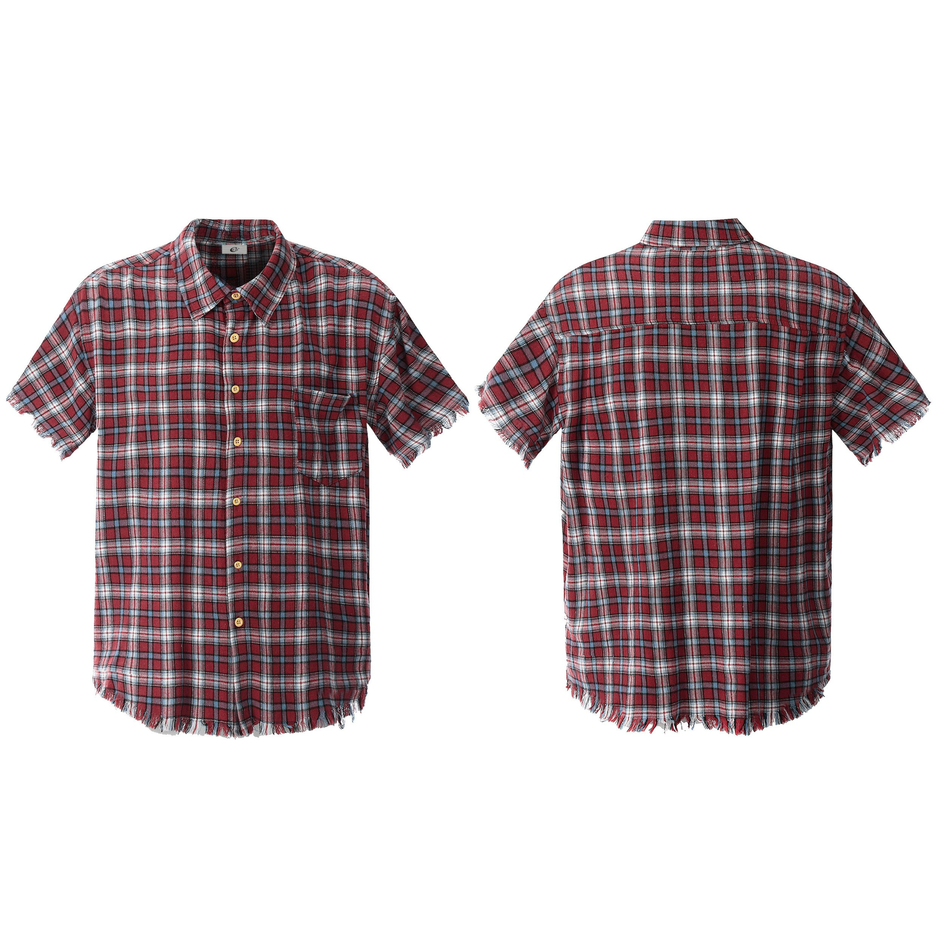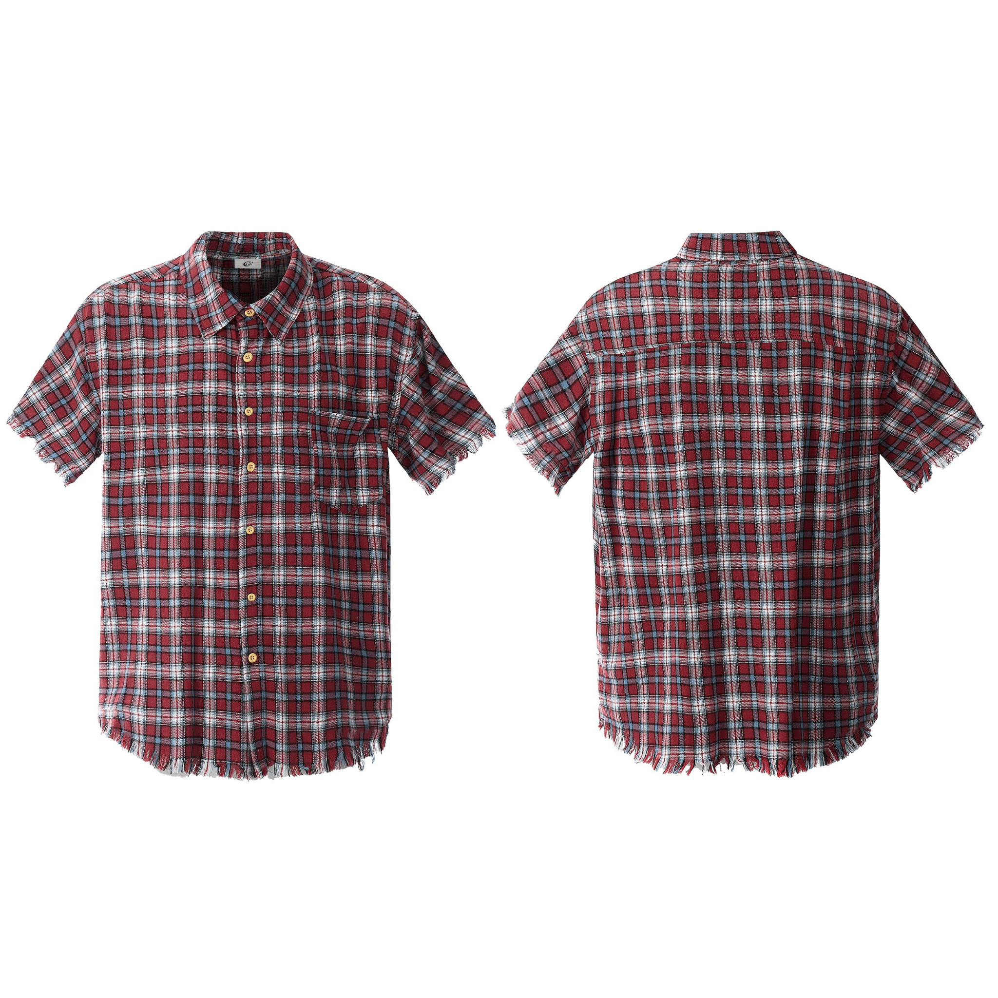 The Omirad Distressed Plaid Short-Sleeve Shirt brings a rugged twist to a classic summer staple. Featuring a vintage red plaid pattern, this shirt stands out with raw, frayed edges along the sleeves and hem for a naturally worn-in look. The relaxed fit and lightweight cotton fabric make it perfect for layering or wearing on its own during warm weather.