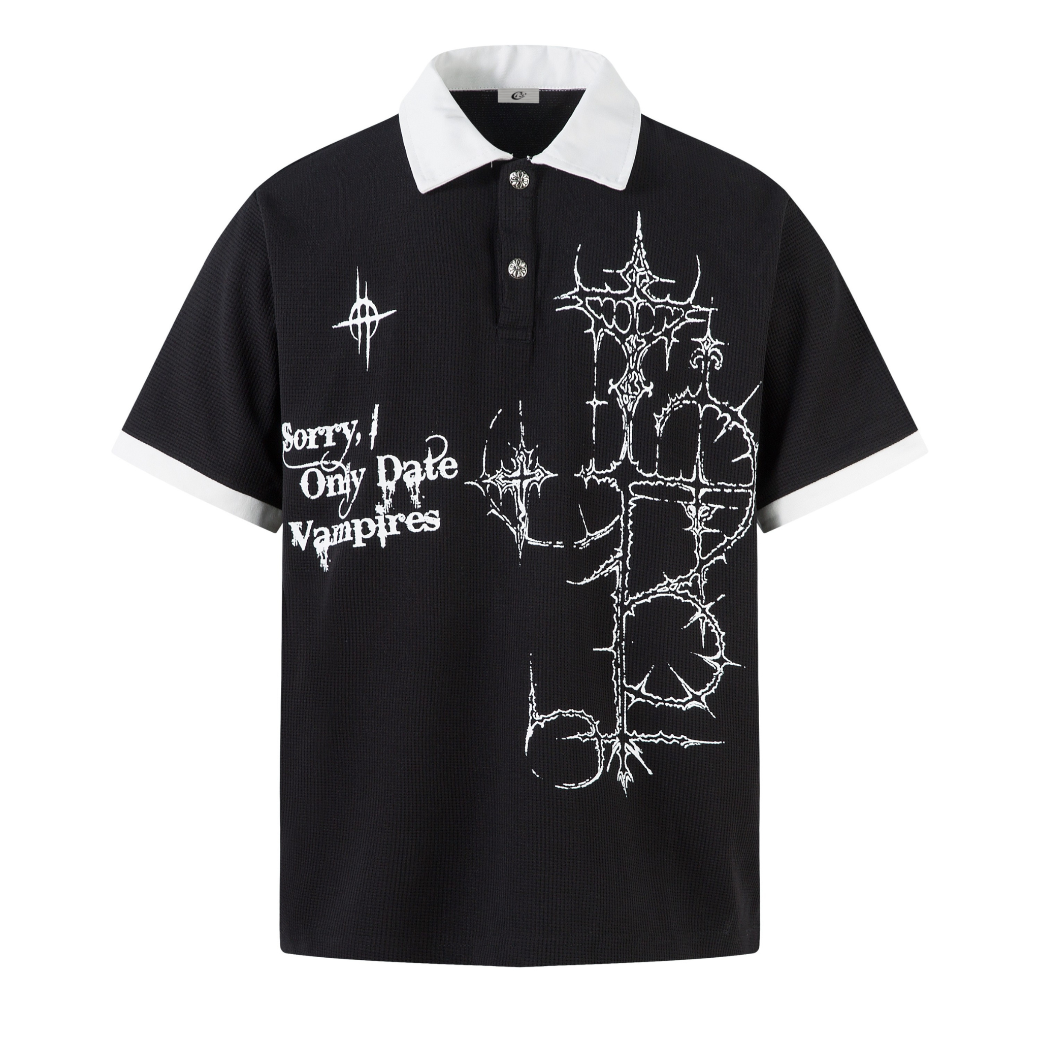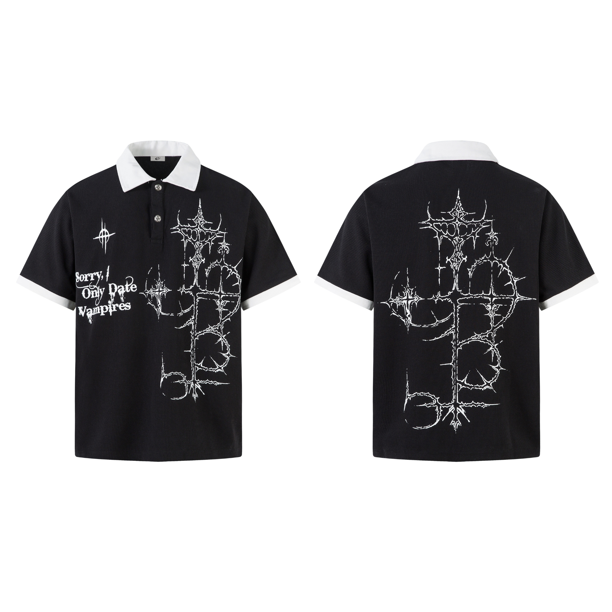 The Omirad Gothic Graphic Polo Shirt features bold front-and-back thorn-style graphics paired with a contrast collar and sleeve cuffs for a sharp streetwear twist on a classic polo. Made from 100% polyester, it offers lightweight comfort and a clean structured look.