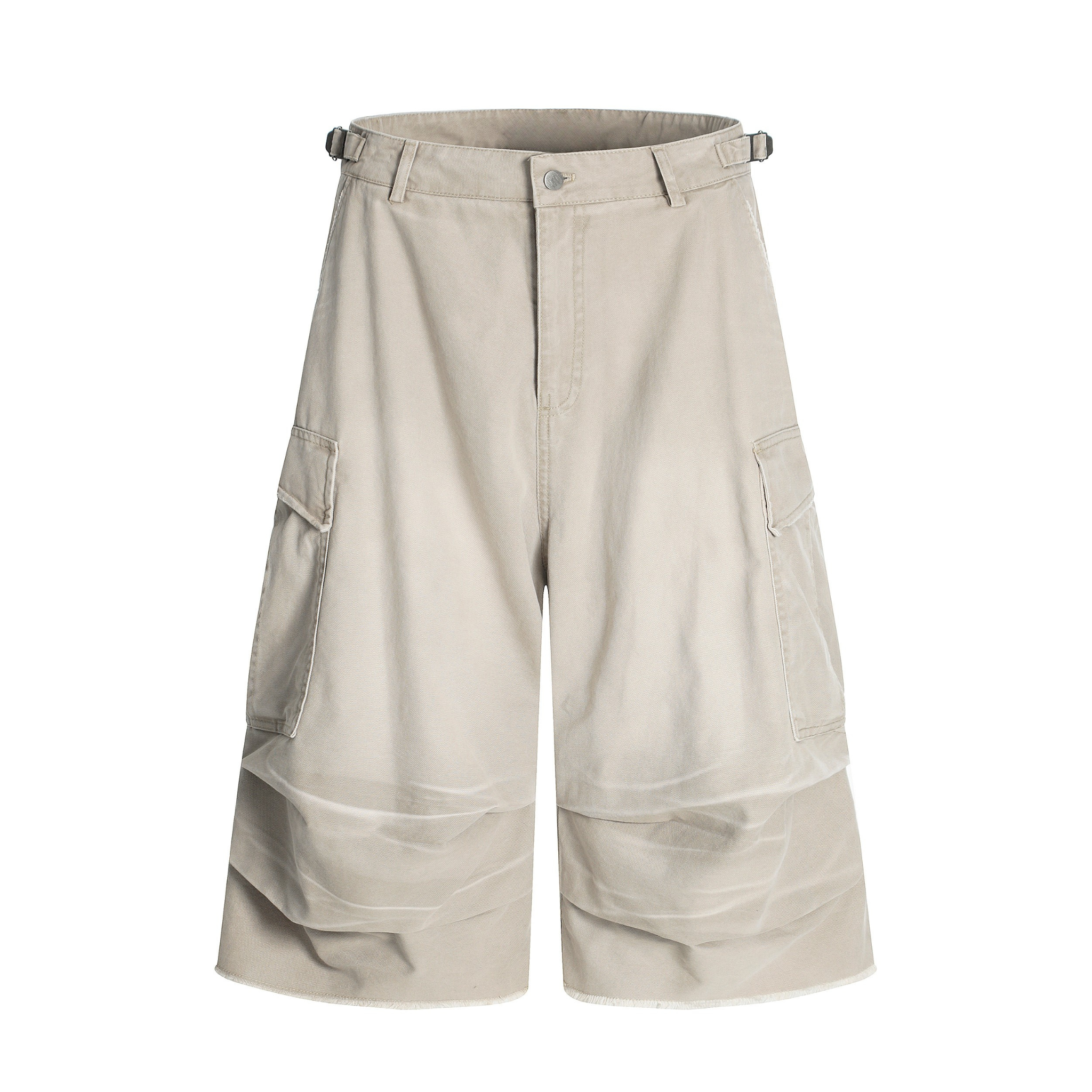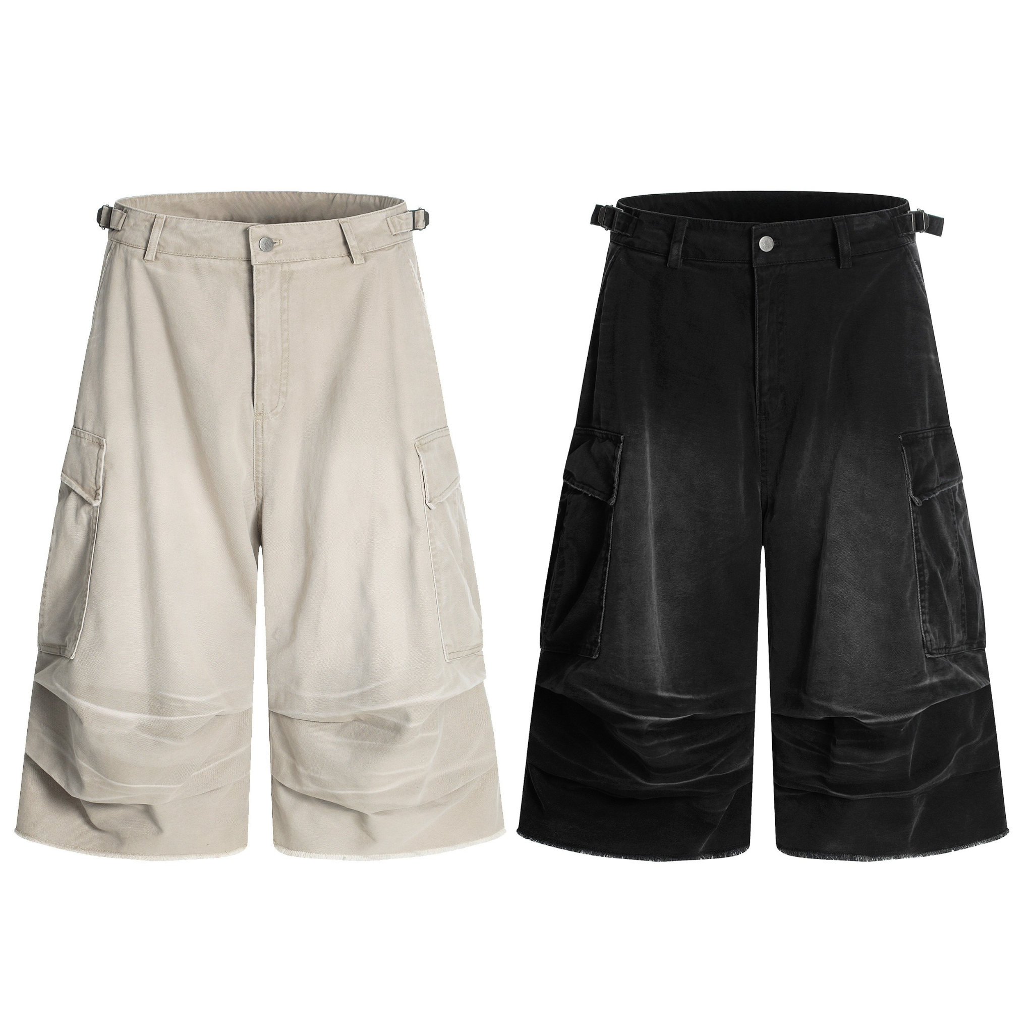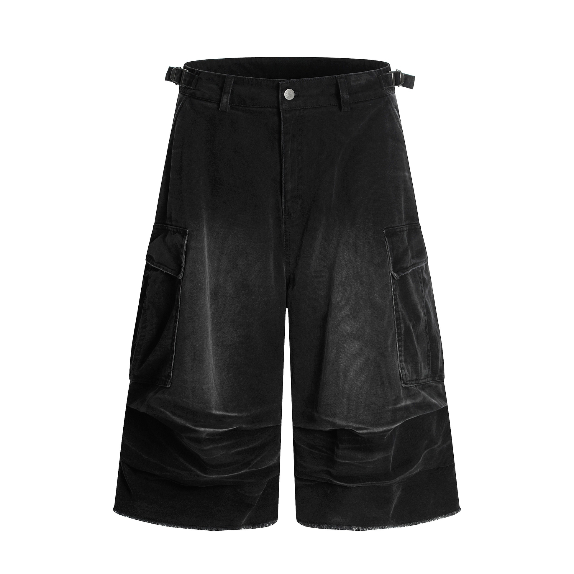 Clothing details: Washed gradient finish, multi-layer knee panels, oversized cargo pockets, adjustable waist tabs, raw-edge hem, relaxed wide-leg cut.
