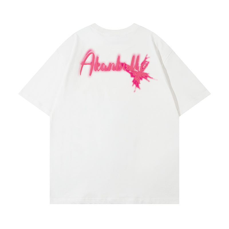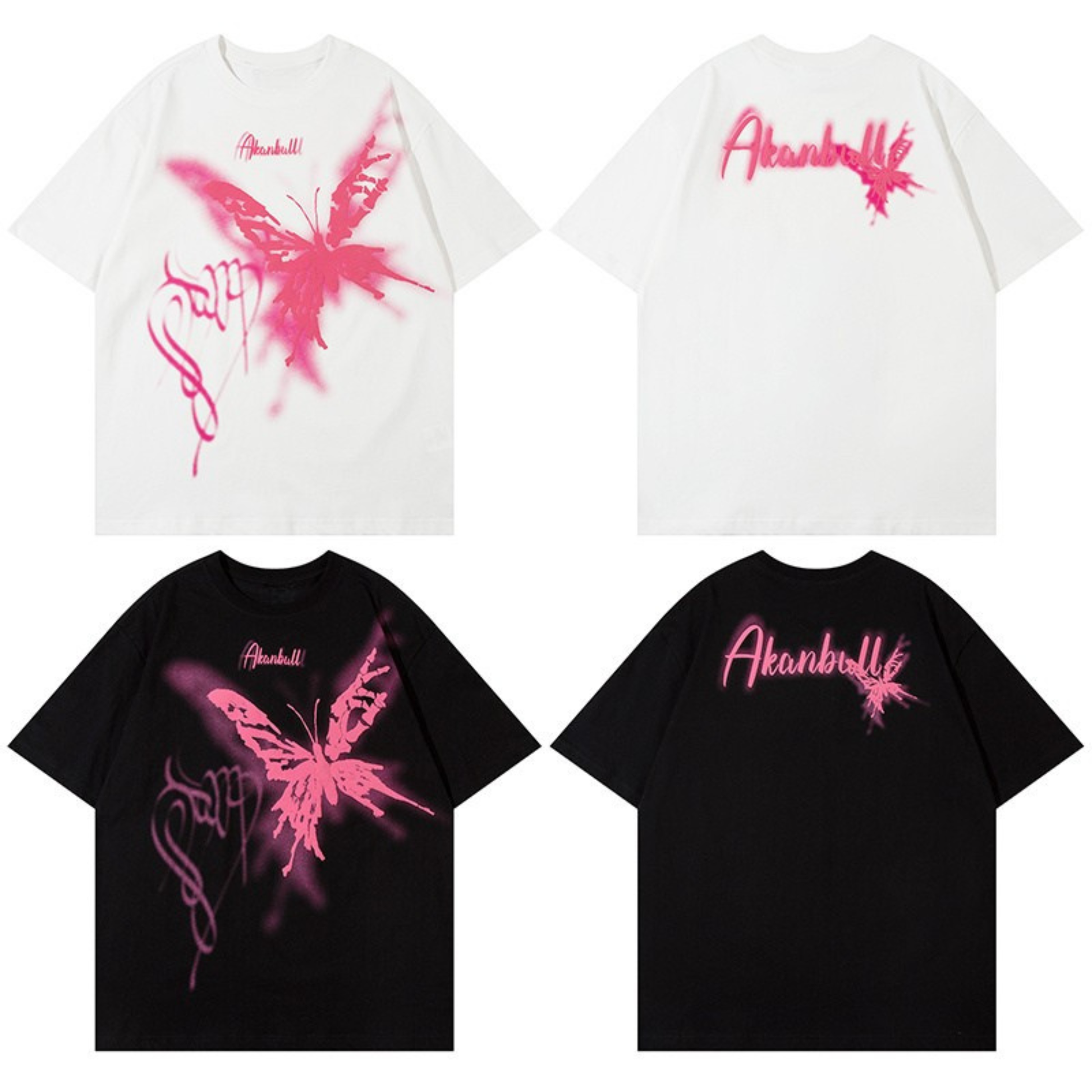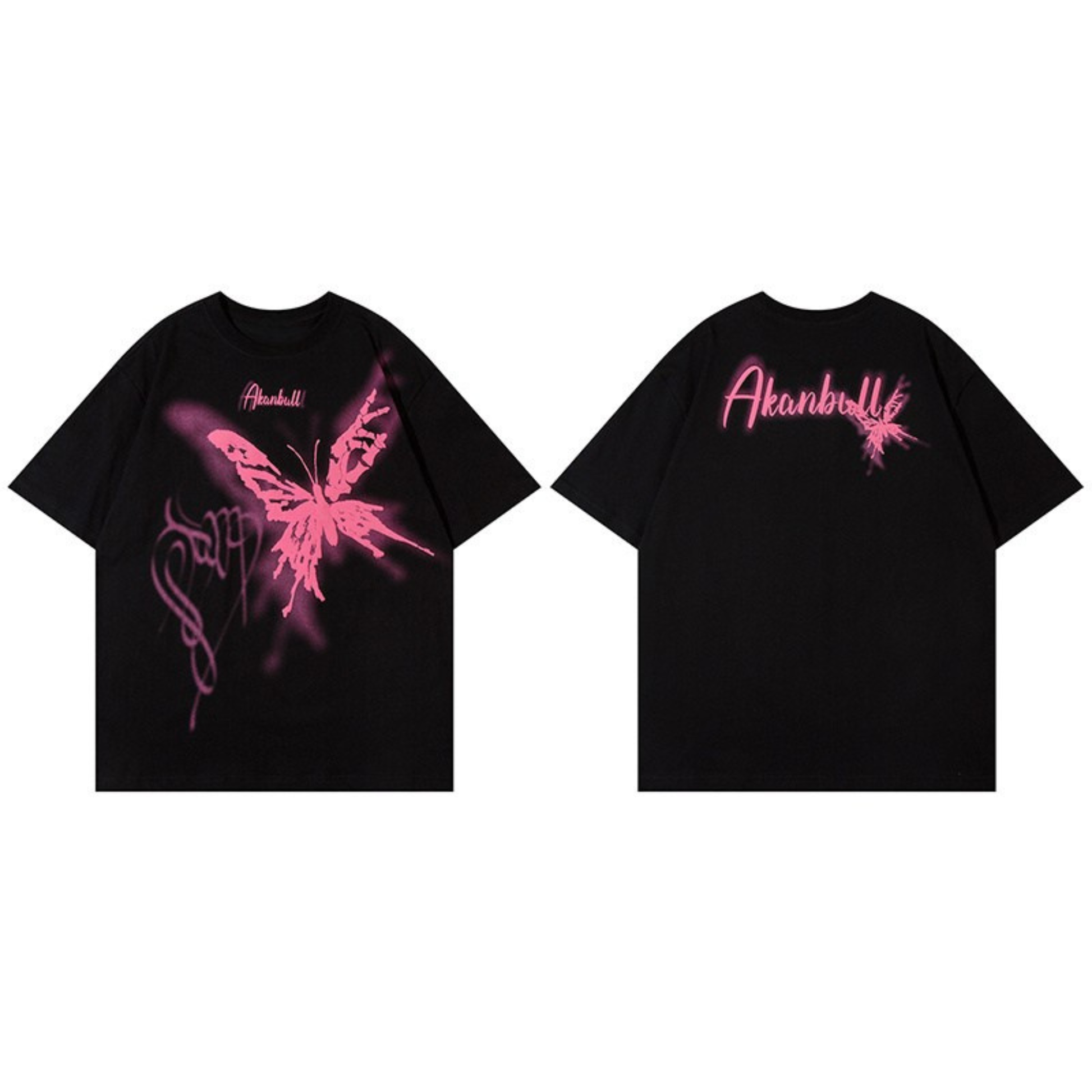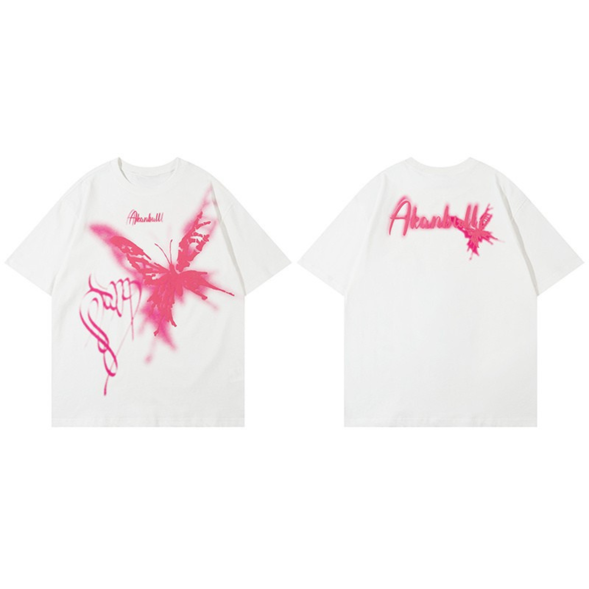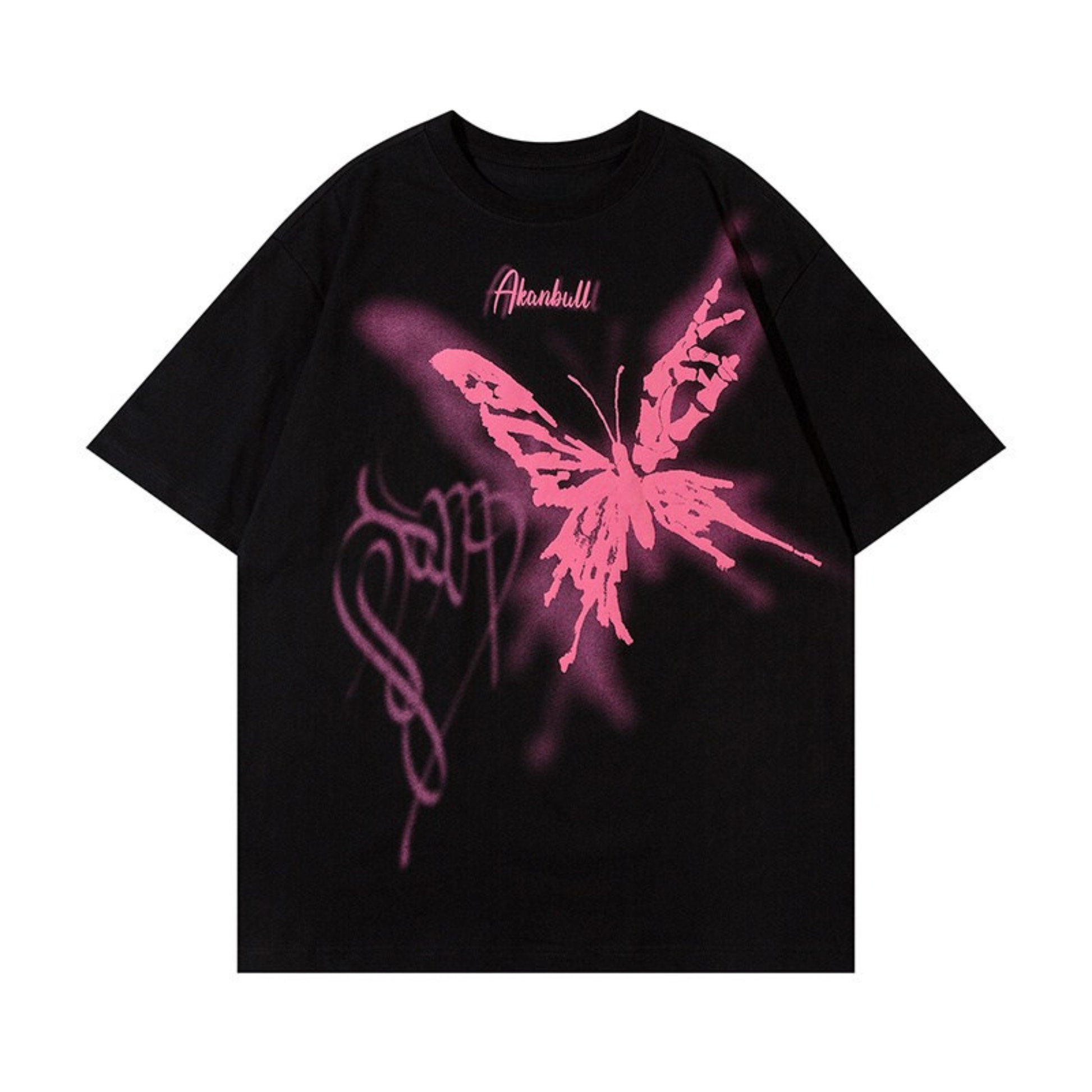 Clothing details: Oversized short-sleeve tee, spray-effect butterfly graphic print, front and back logo detailing, crew neckline, dropped shoulders, soft heavyweight cotton fabric, relaxed street fit.
