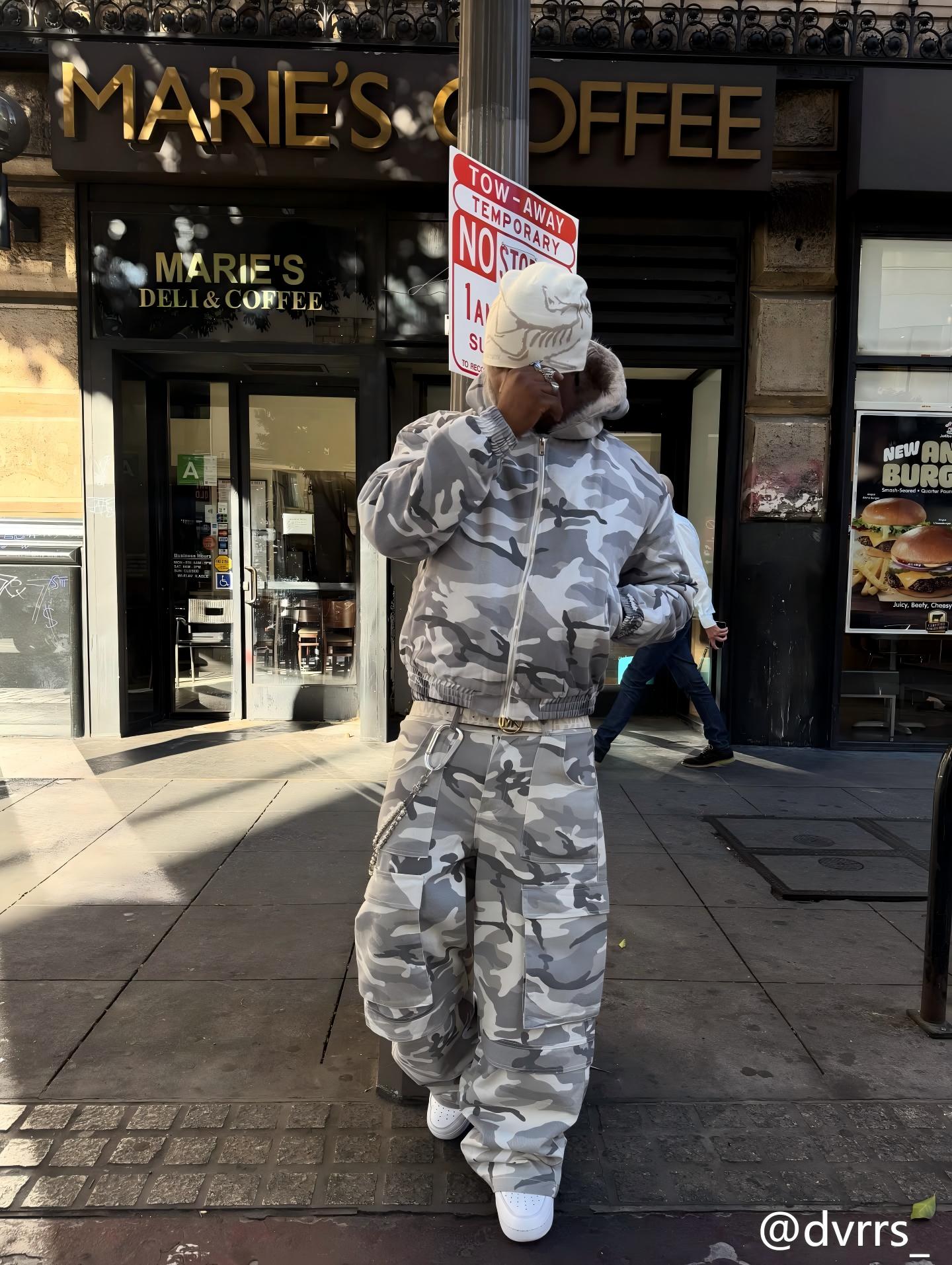 The Omirad Grey Camo Cargo Wide-Leg Pants feature an all-over grey camo print with oversized cargo pockets and a relaxed wide-leg silhouette. Made from 100% cotton, they offer breathable comfort with a bold military-inspired streetwear edge.