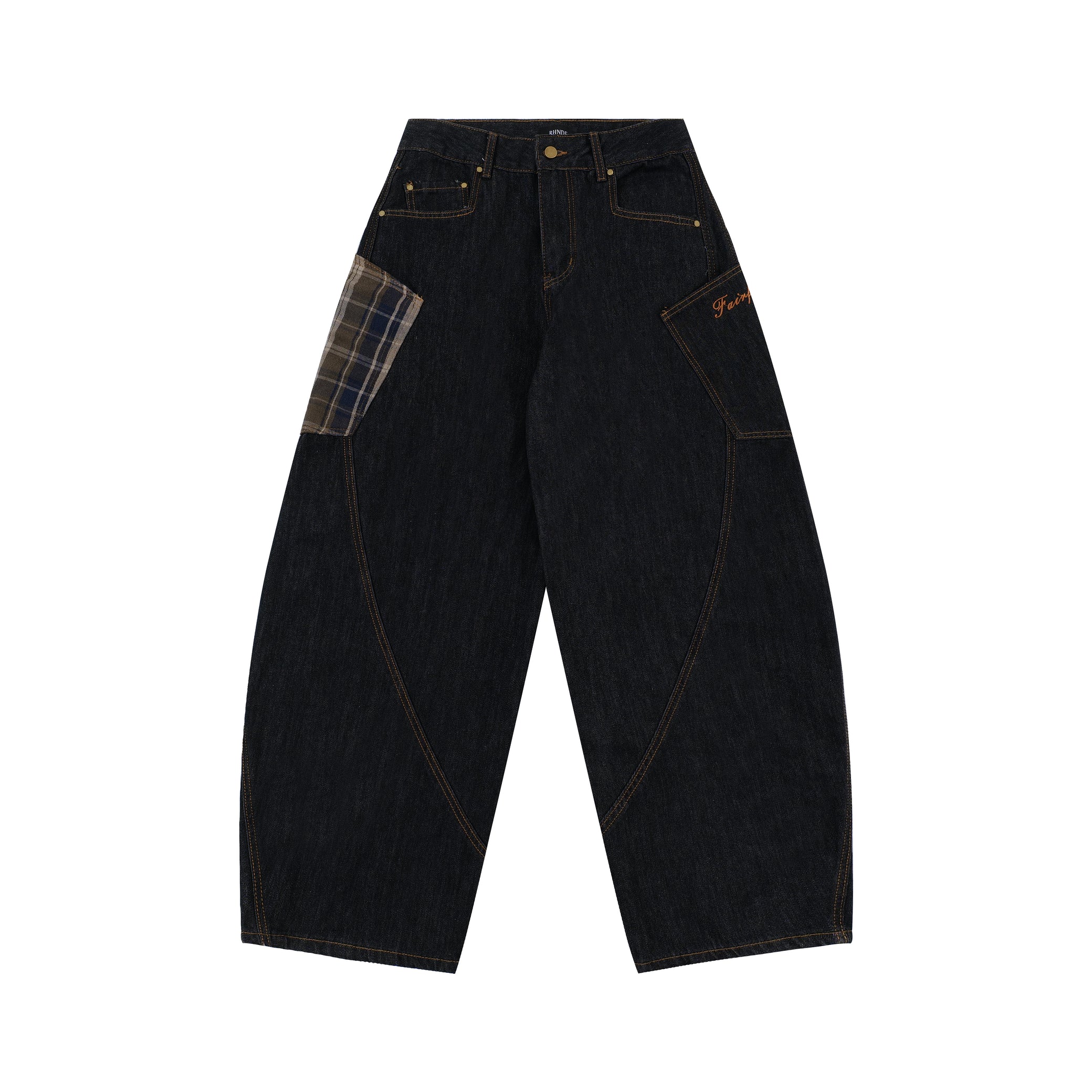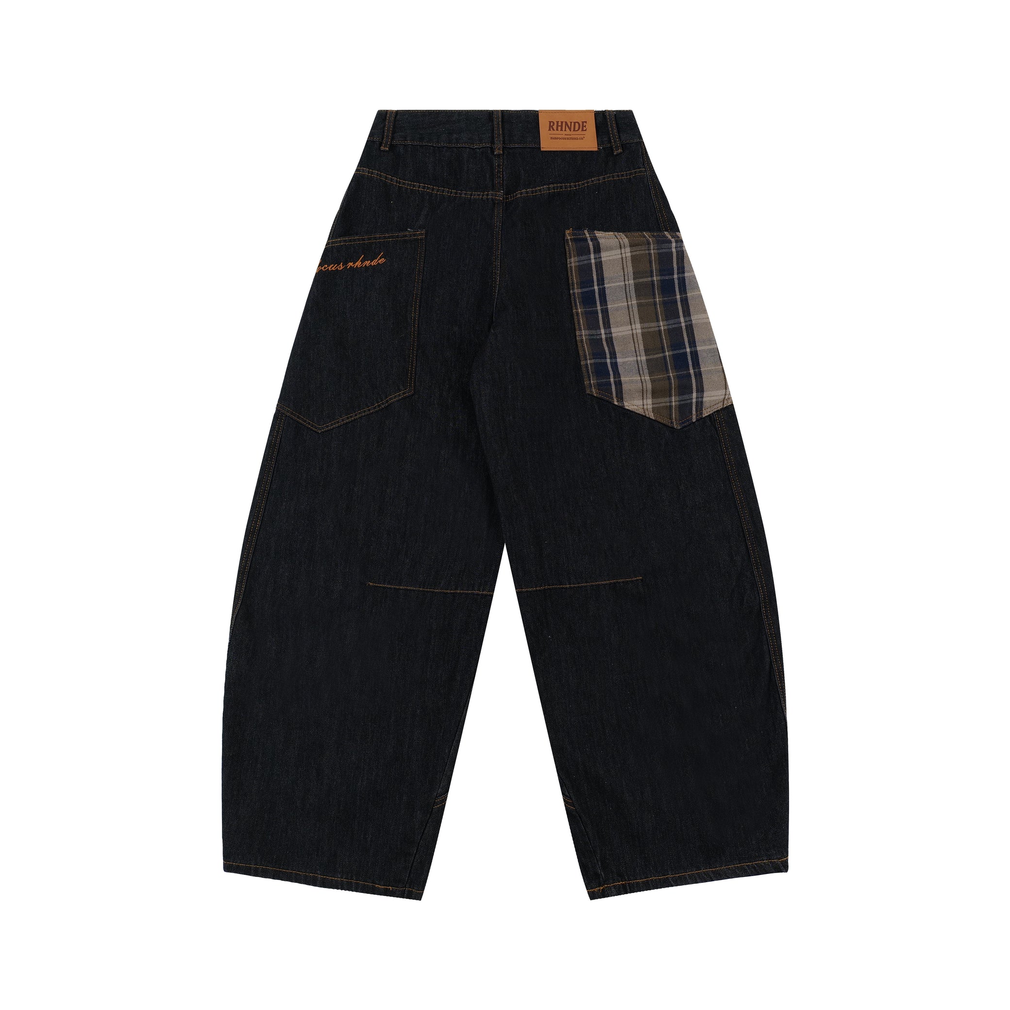 These Omirad jeans blend rugged workwear with subtle patchwork artistry. The plaid contrast pockets add a playful touch to the structured denim base, while the curved seam construction enhances the silhouette. Crafted from 82.4% cotton, 10% polyester, and 7.6% regenerated cellulose fiber, the fabric provides a balance of durability and breathability for everyday wear.