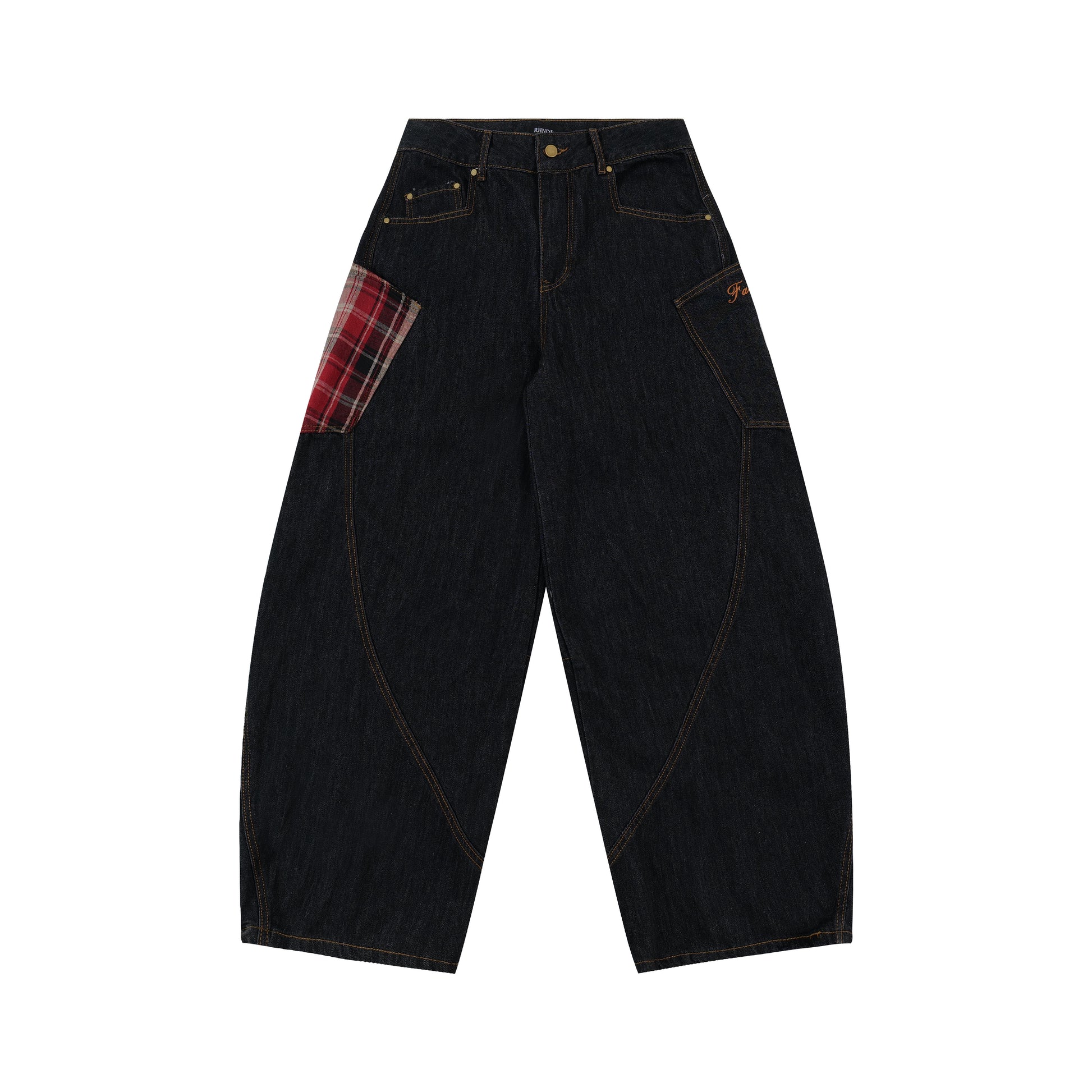Clothing details Red plaid patch pockets curved seam construction dark indigo wash contrast stitching relaxed wide-leg fit