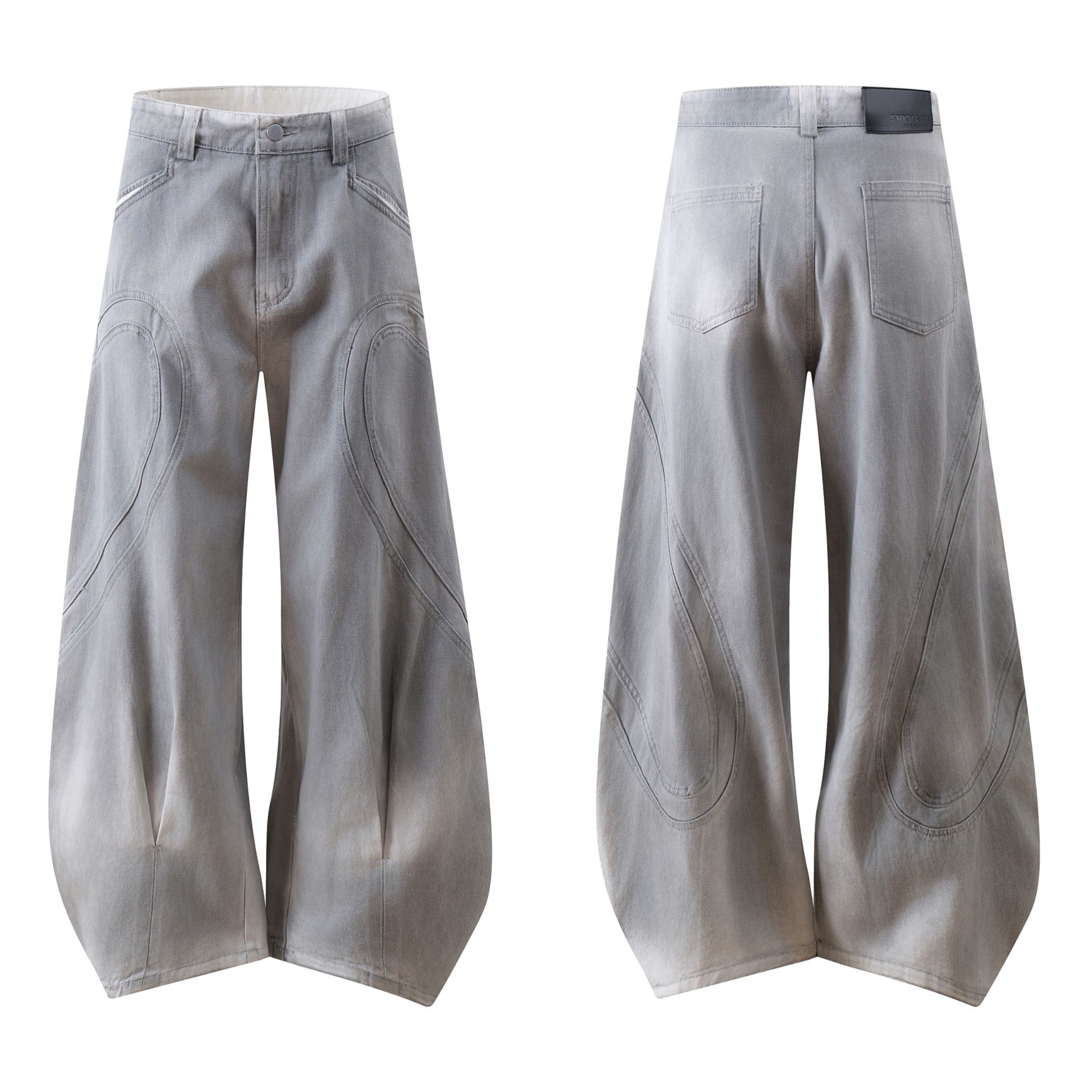 Clothing details: Curved Seam Paneling, Balloon Wide-Leg Silhouette, Washed Grey Finish, Back Patch Pockets, Structured Waistband, Sculpted Streetwear Fit
